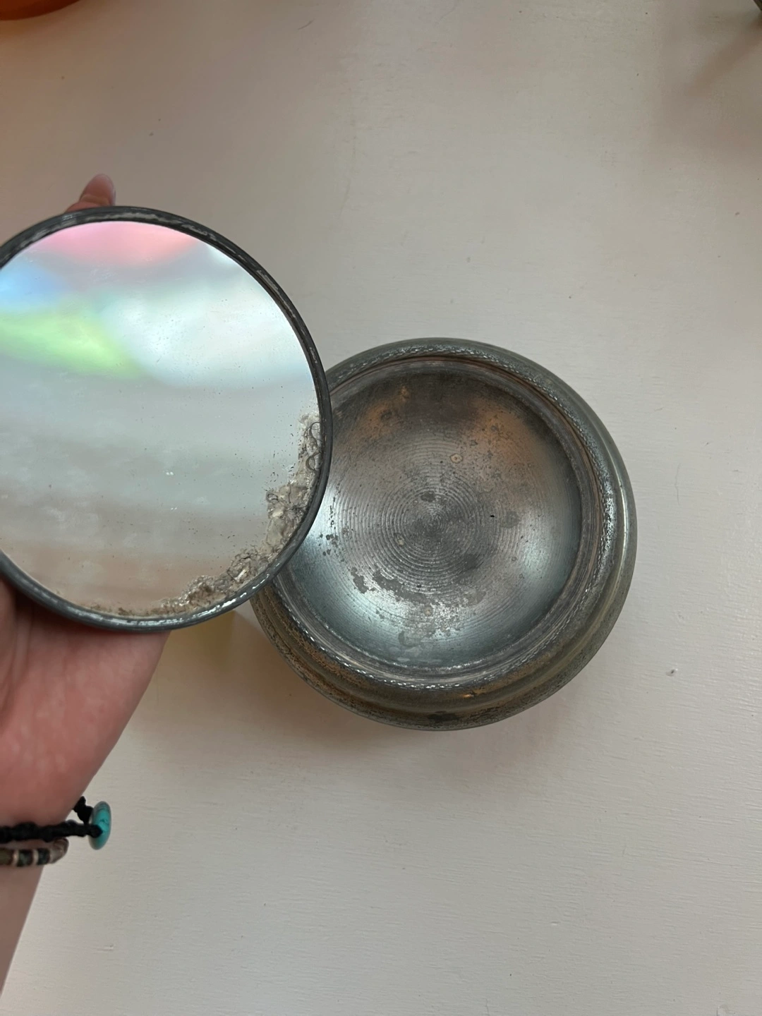 Circa 1930s vanity powder/music box. Features a Bakelite handle and small mirror. Metal construction. Shows signs of age and wear.