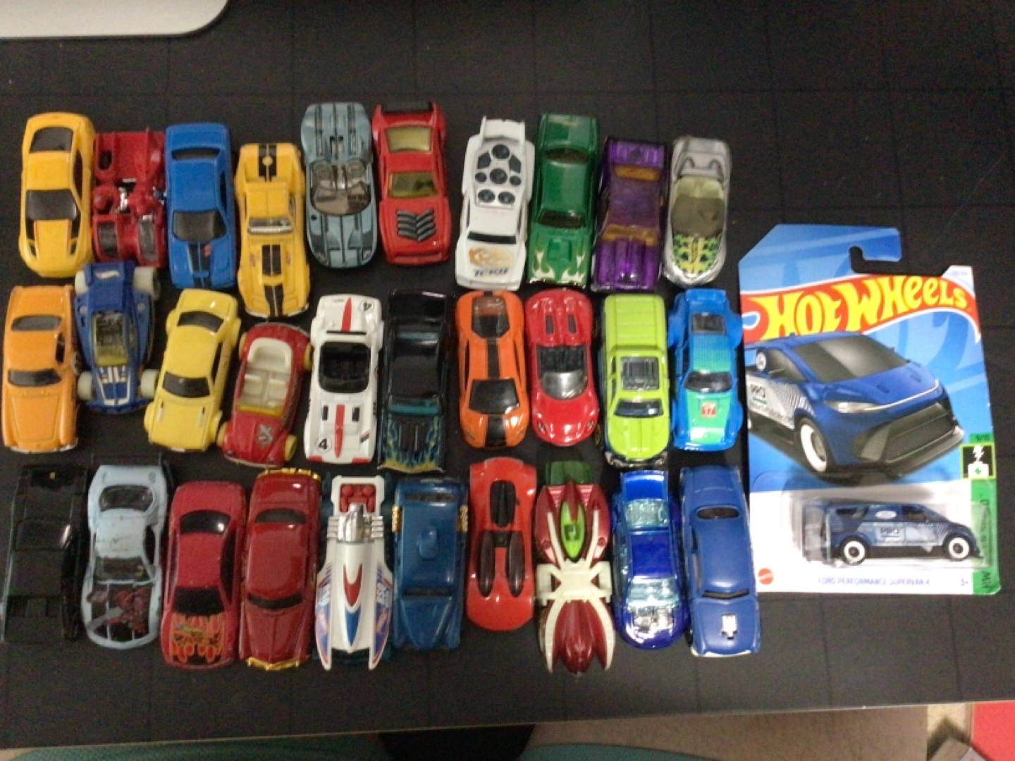 21 different hot wheels. One is still in the box. Minor bit of folding to the packaging.