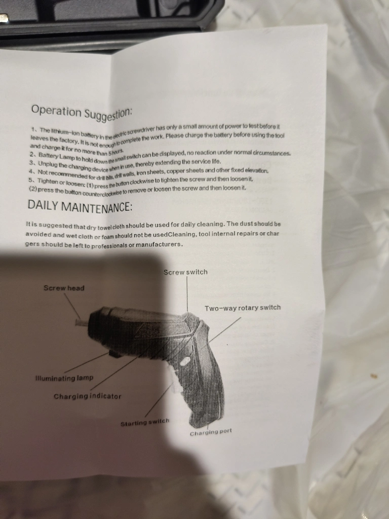 Portable electric screwdriver. Includes various bits and attachments. Charging cable and carrying case. USB rechargeable. 45+ piece set.