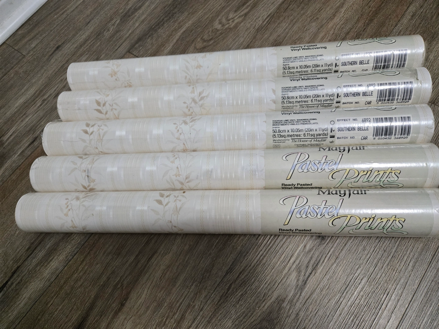 Five rolls of ready-pasted vinyl wallpaper. Off-white background with a subtle floral pattern. Southern Belle effect. New, in original packaging.