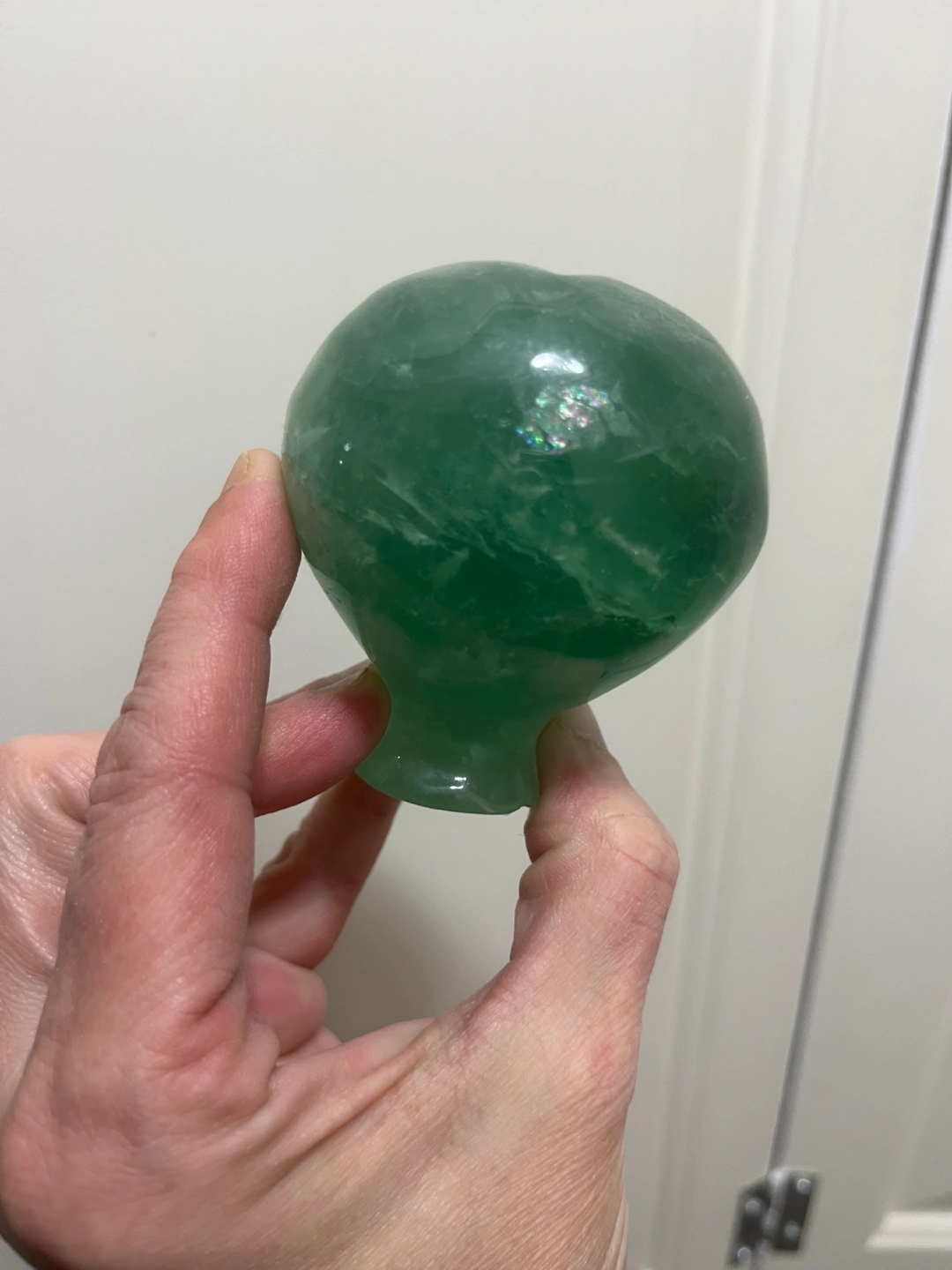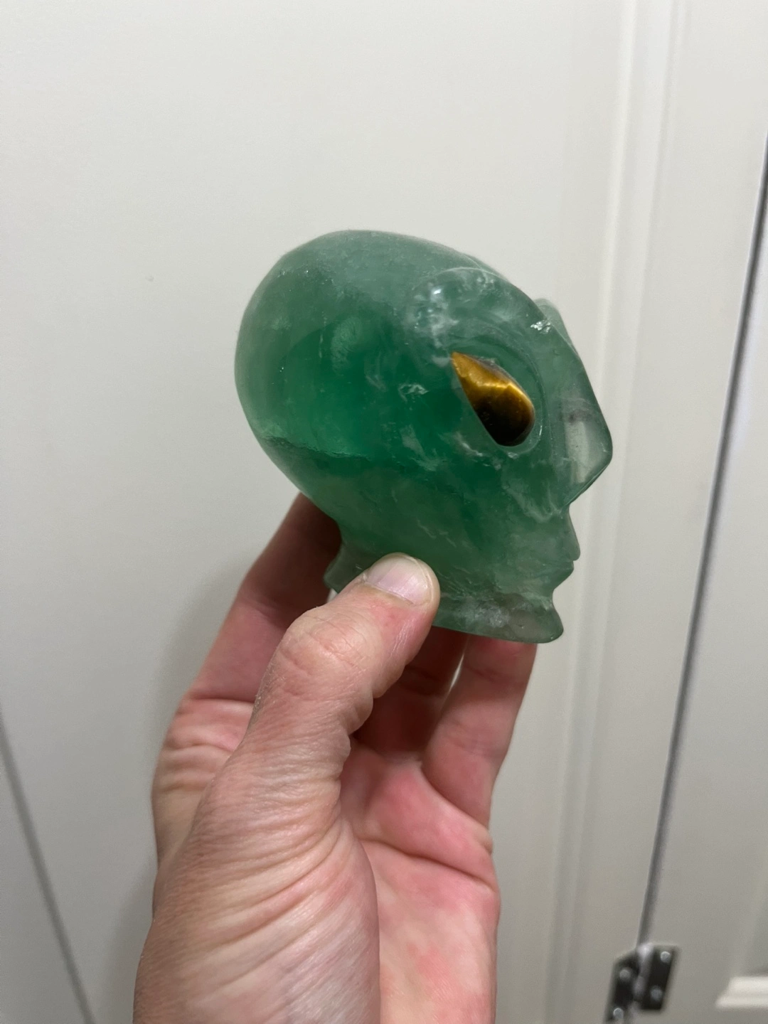 Hand-carved, High Quality green fluorite alien head. Features tiger eye inlay for eyes. Unique collectible, great for display. Approximately 4 inches tall. Rainbow π on the back of his head !