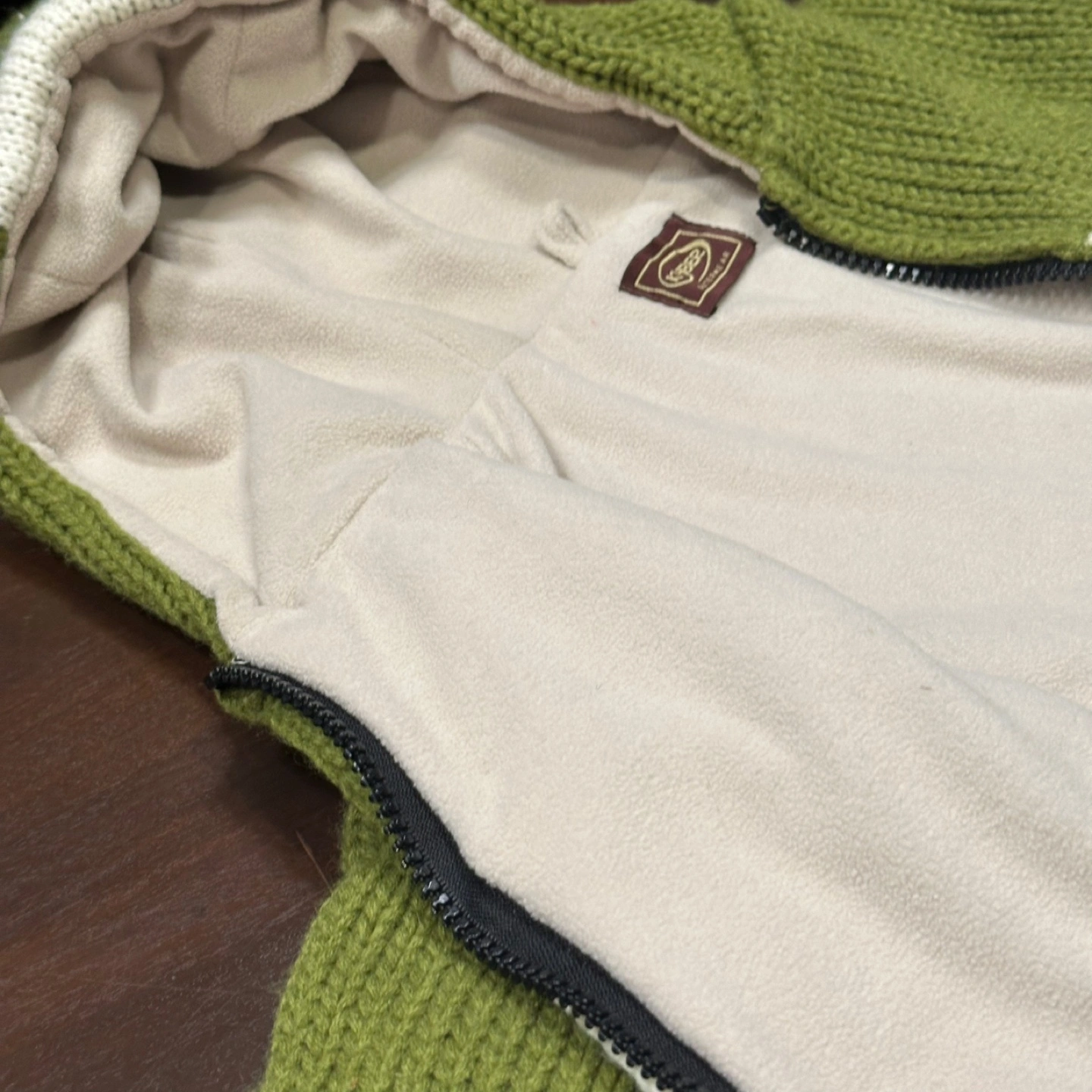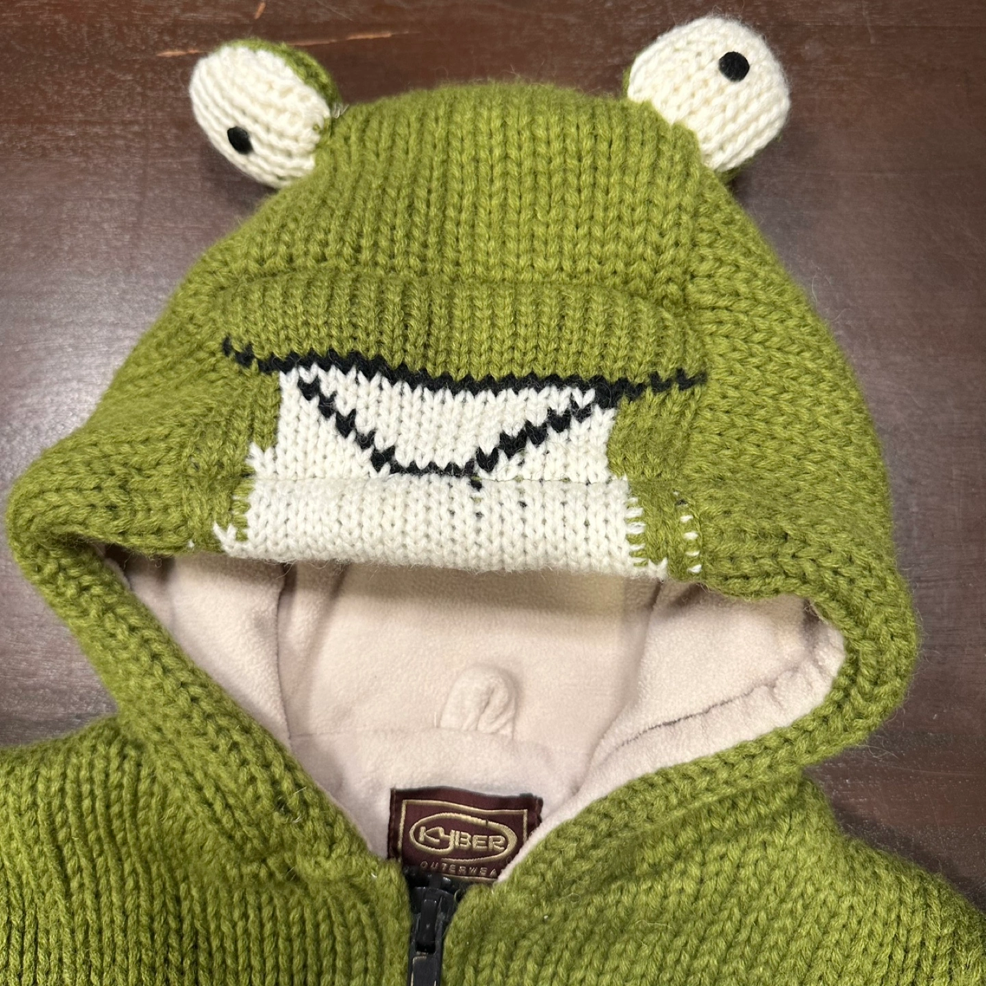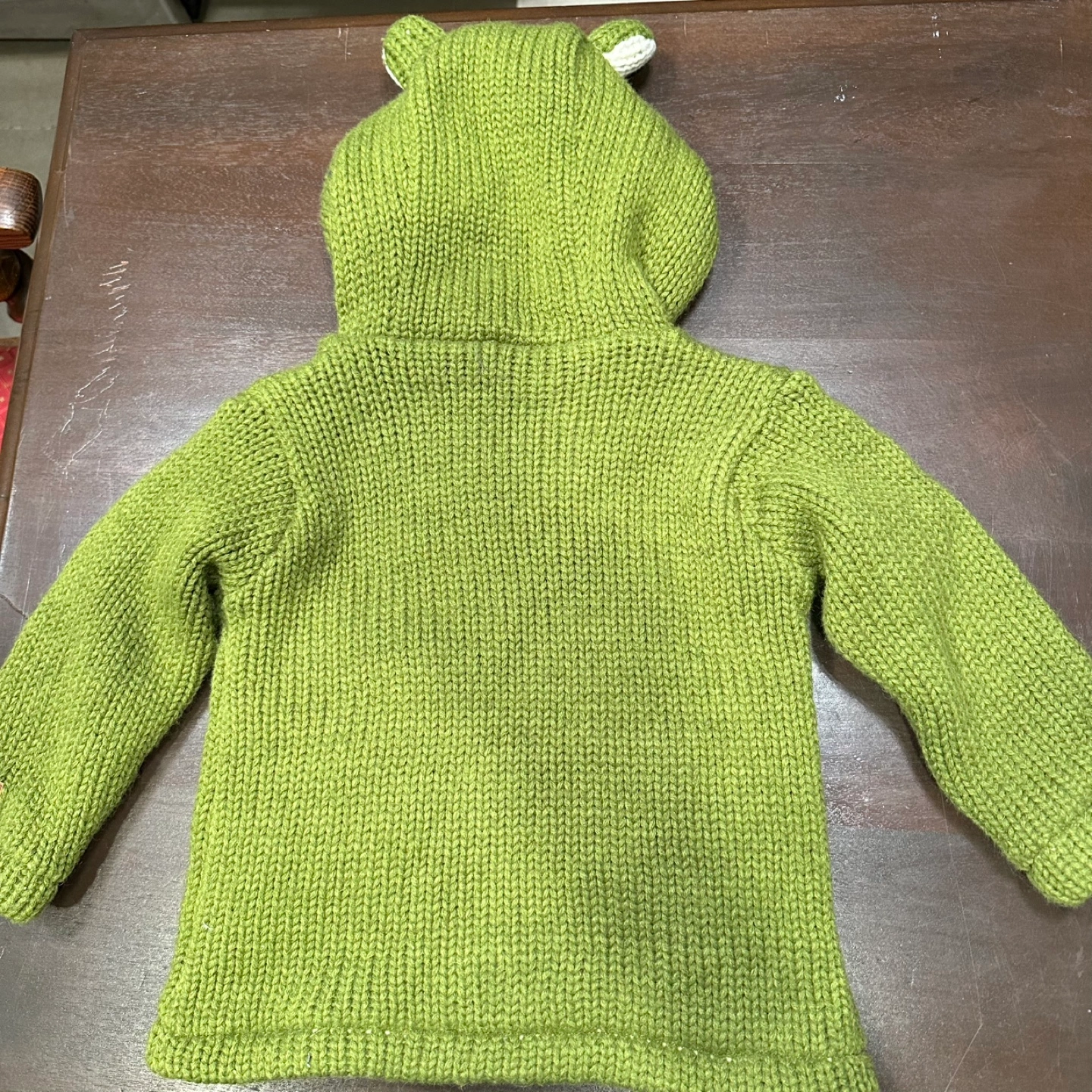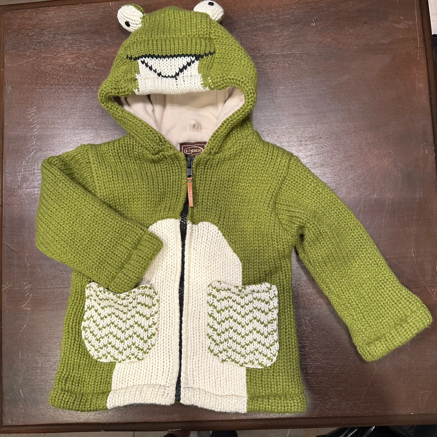Green frog-themed hooded sweater. Zipper closure. Knit fabric. Adorable details. Great for chilly days. Kids size M fits like a 3/4 year in my opinion