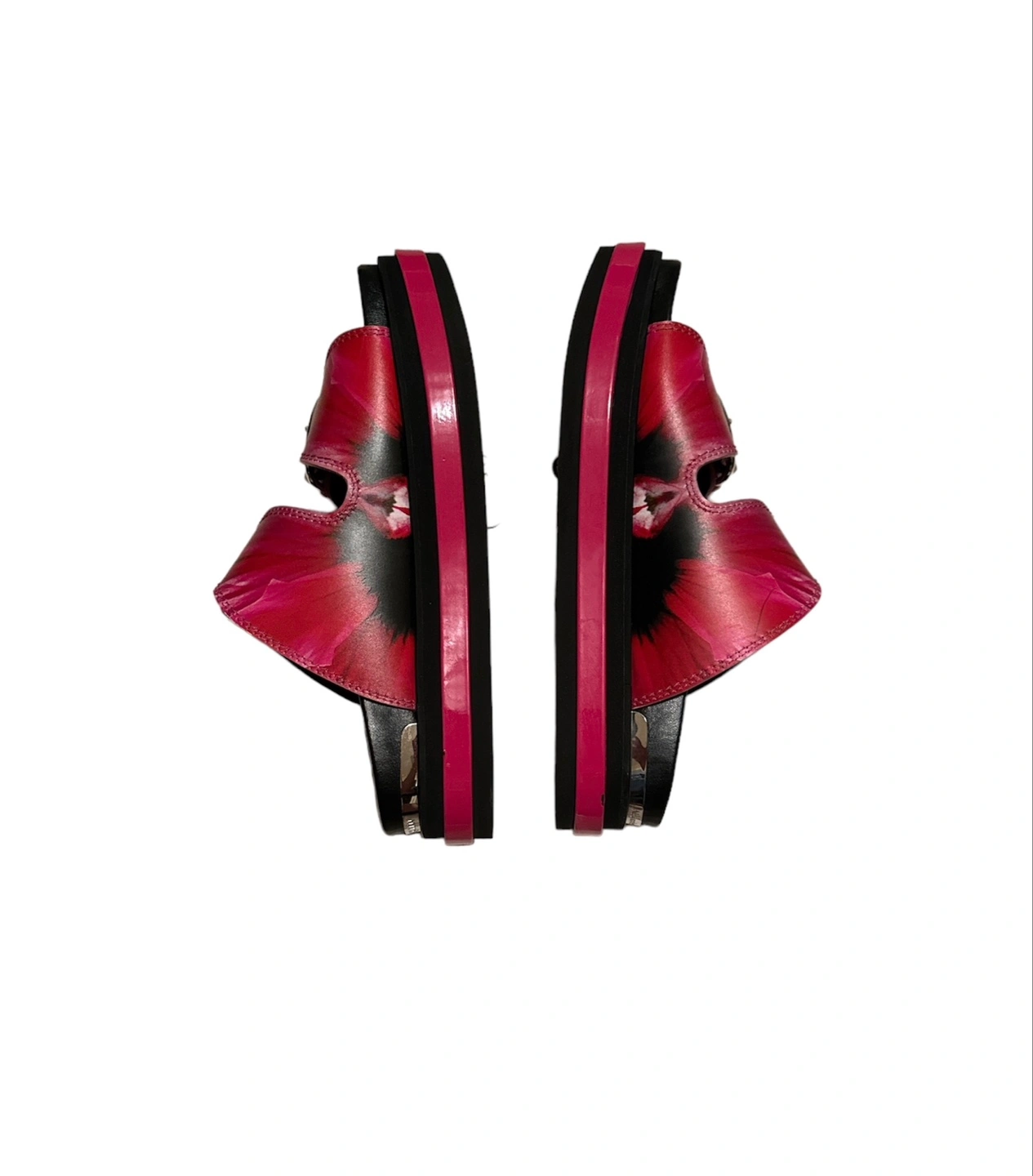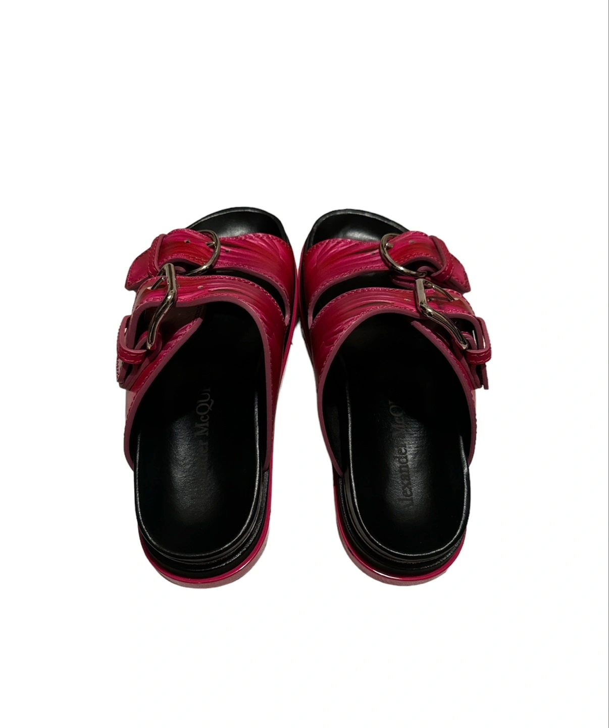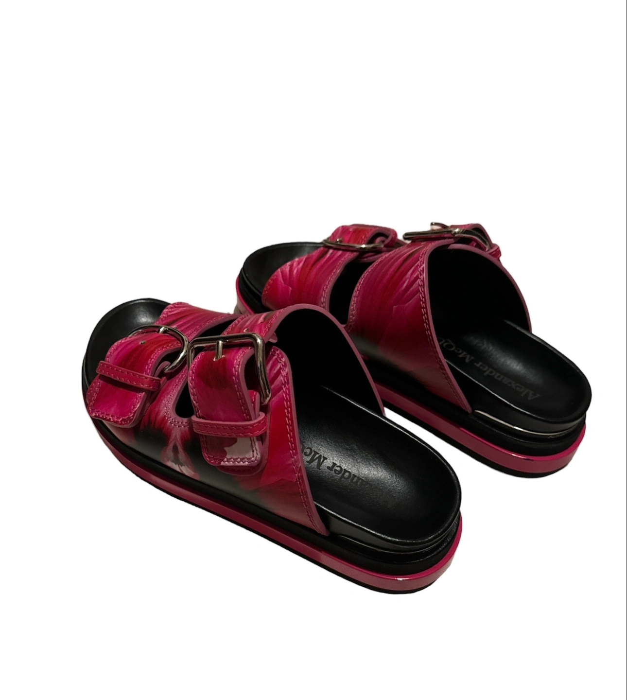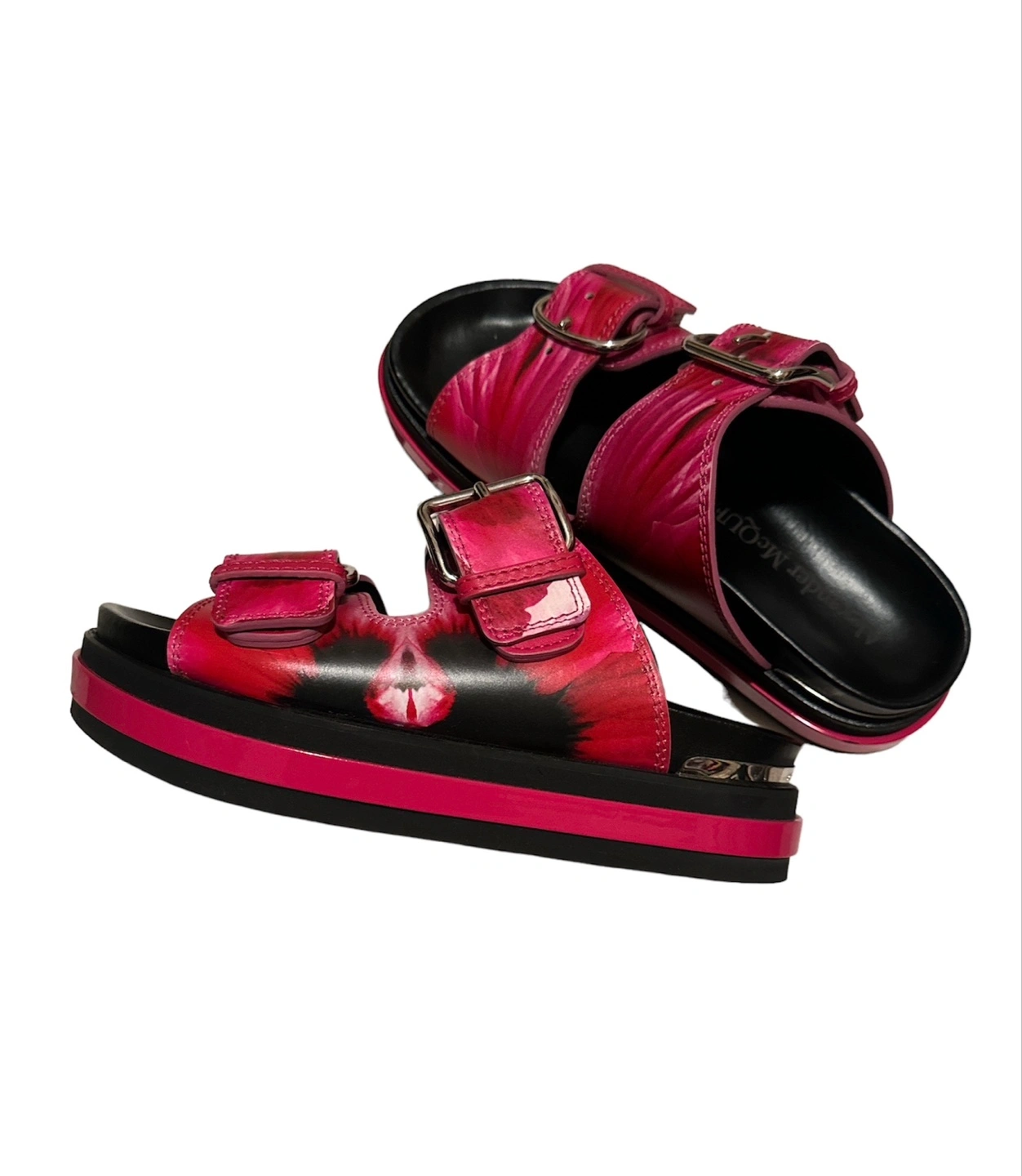 Stunning Alexander McQueen platform sandals. Pink leather with unique print. Double buckle straps. Thick platform sole. Pre-owned.
