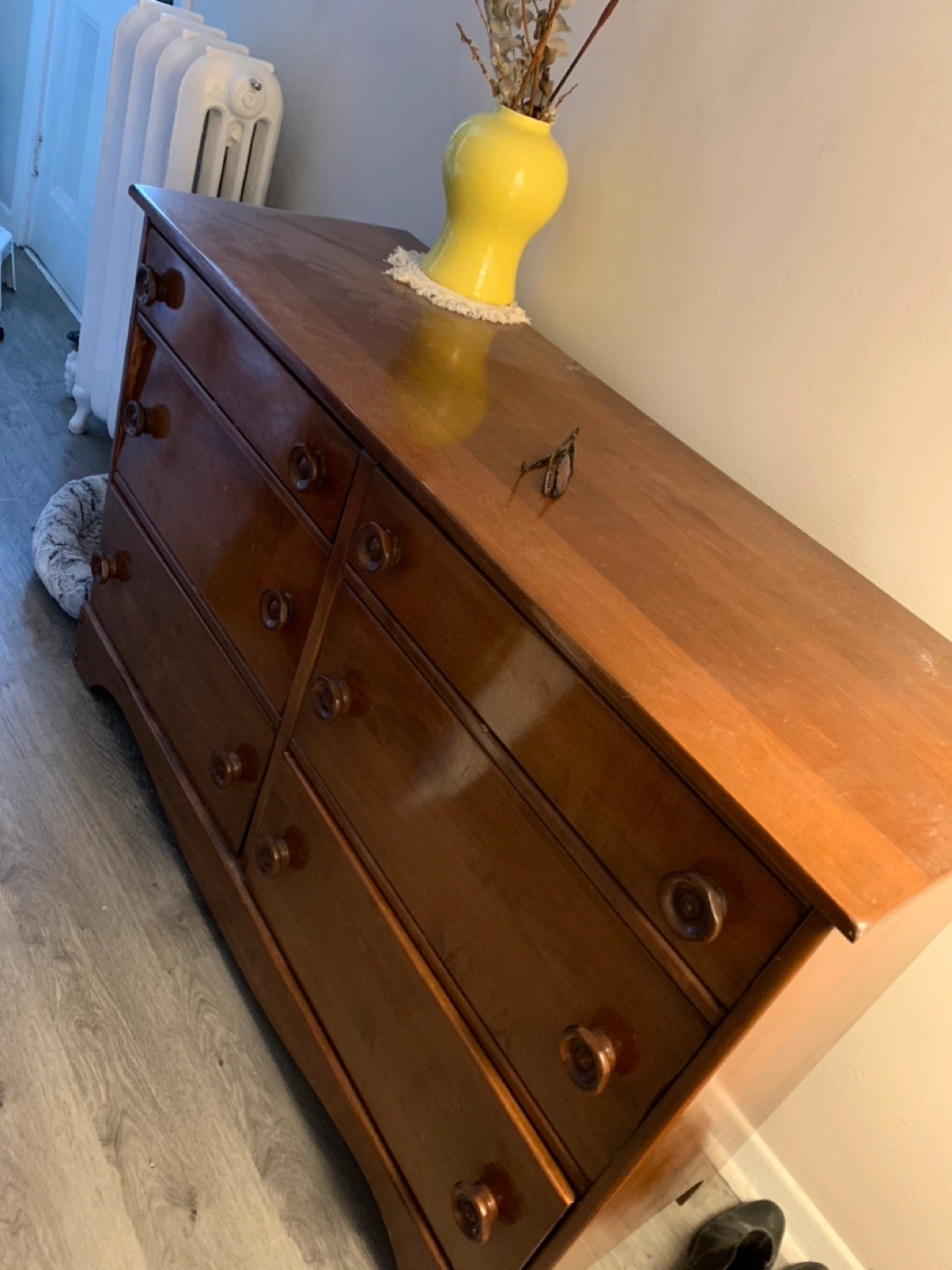 Free antique dresser, from the 1940s. I refinished it about 20 years ago. The inside framing on one side is broken so two drawers don’t slide well. I’ve still been using it but would be perfect for a handyperson. Drawers are huge. Will need 2 people to pick up. Must go by Feb 11. (18.5” deep, 52” wide, 34” tall)