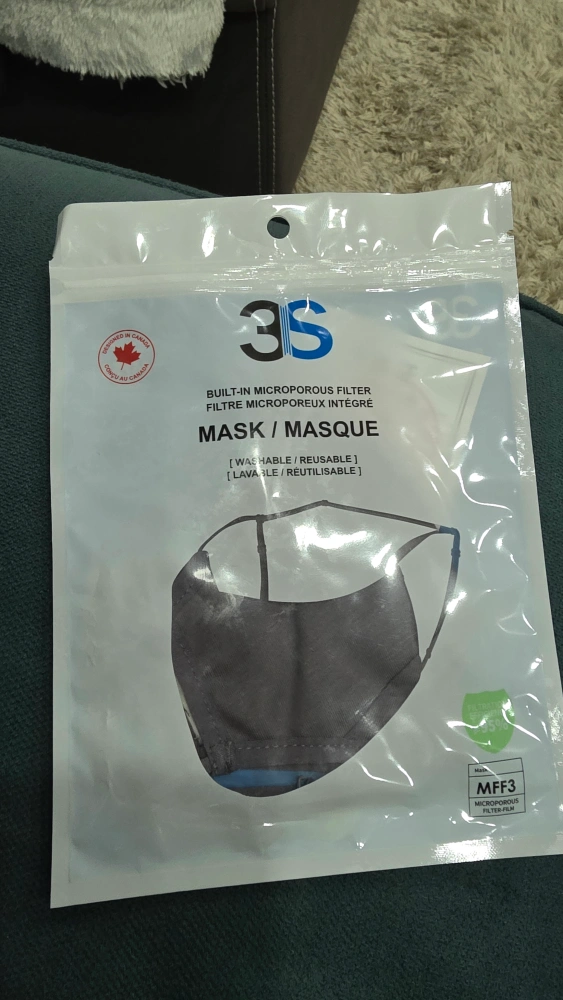 Washable and reusable face mask. Features a built-in microporous filter. Designed in Canada. $1 each so many in stock