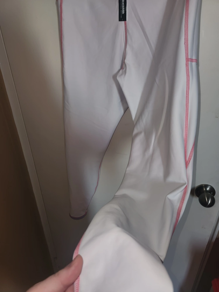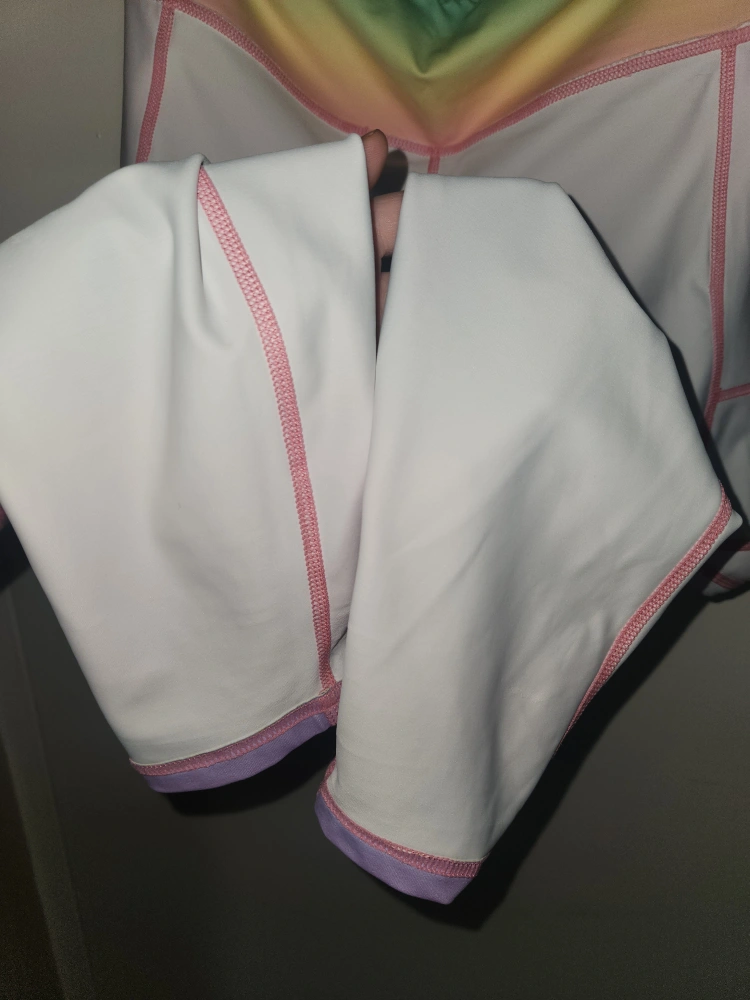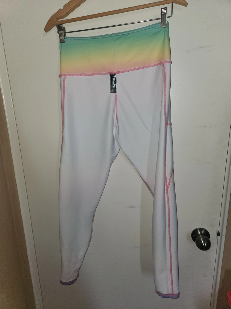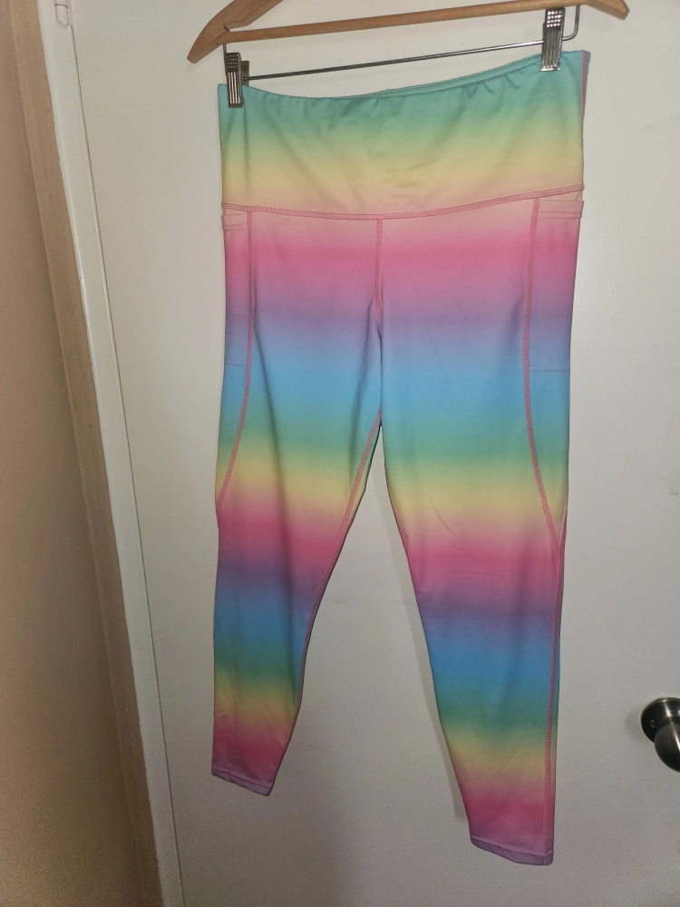 Women's full length leggings. Rainbow ombre design. Side pockets. Pink stitching detail. Size Large.