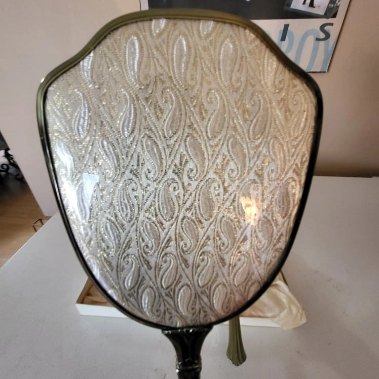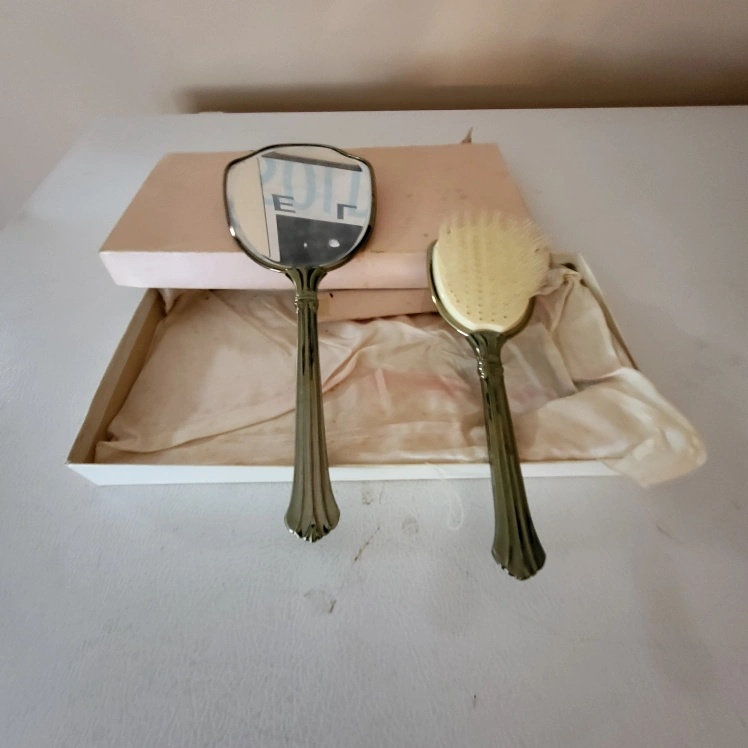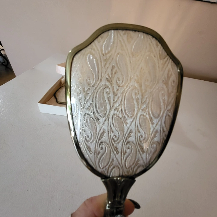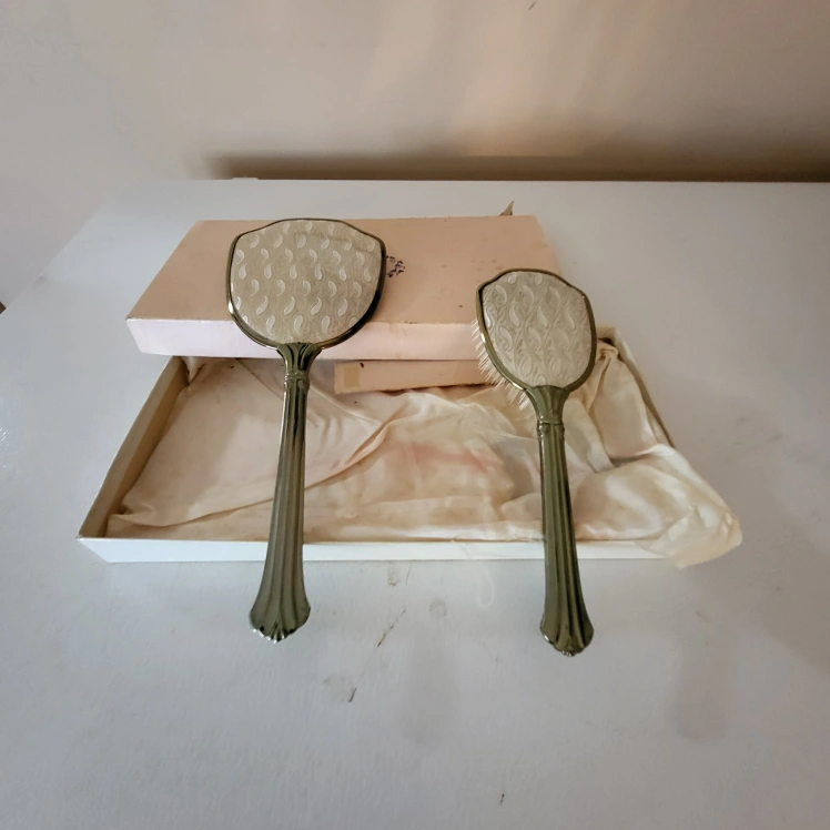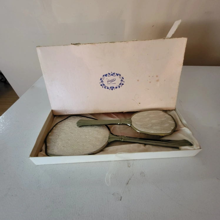 43Beautiful vintage hand mirror and brush set, like New Excellent Condition Gold-tone metal frames. White paisley patterned inserts. Comes in original box. Elegant and stylish. Made in Canada Smoke free home