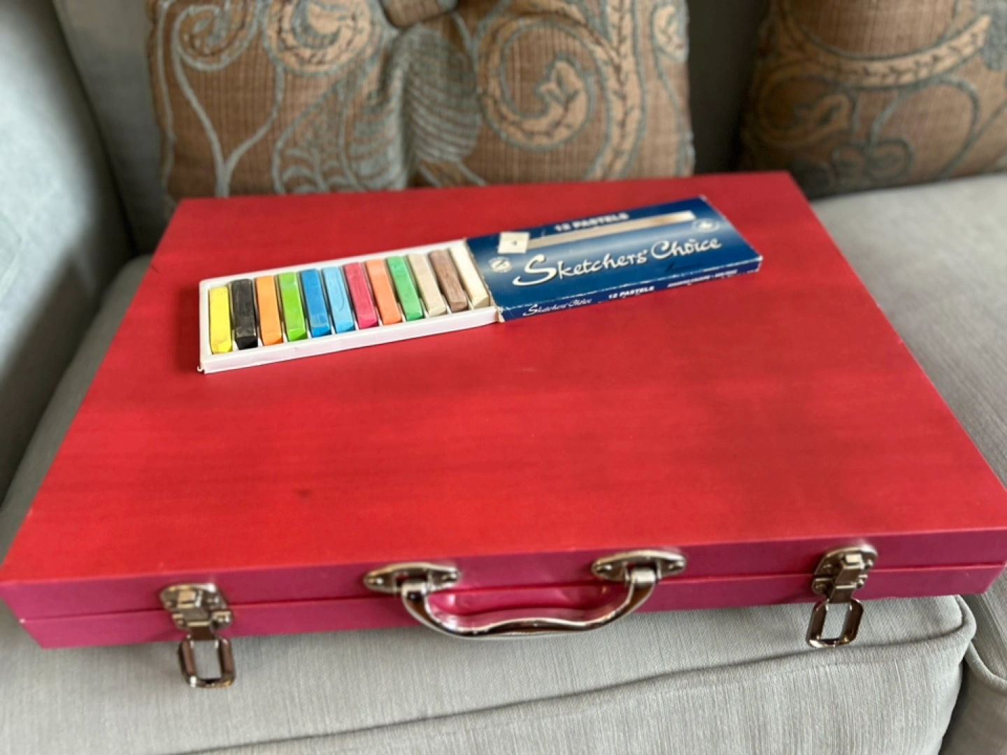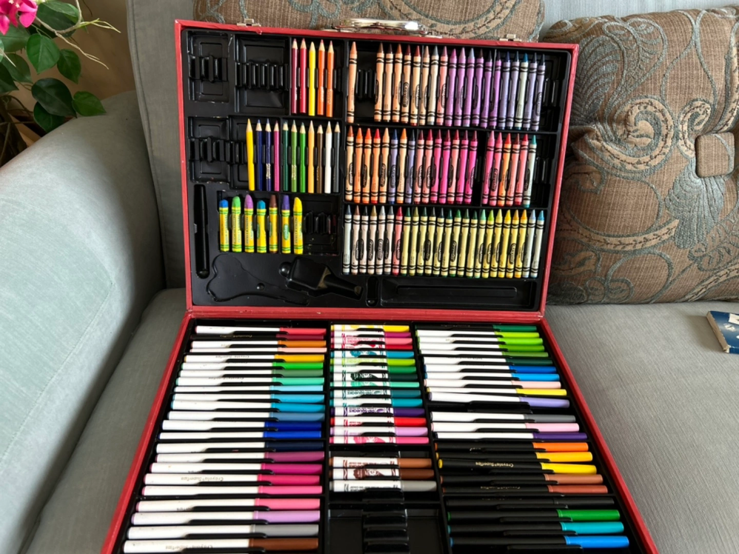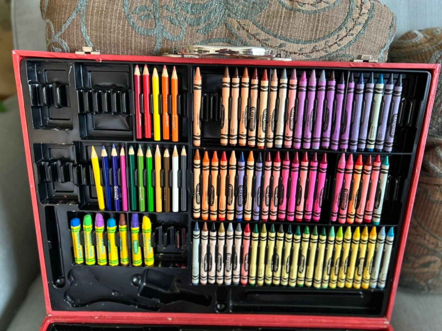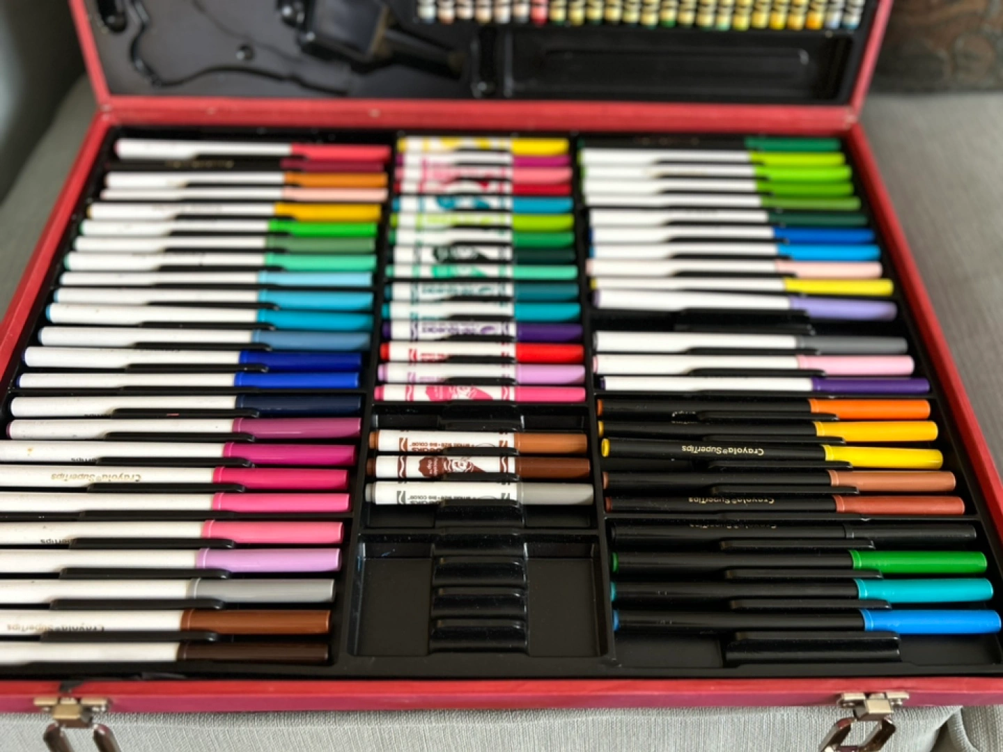 Red carrying case, well-organized. Contains many crayons, felt pen markers, coloured pencils and since a few pieces are missing in the case, I added a set of Sketchers’ Choice pastels!