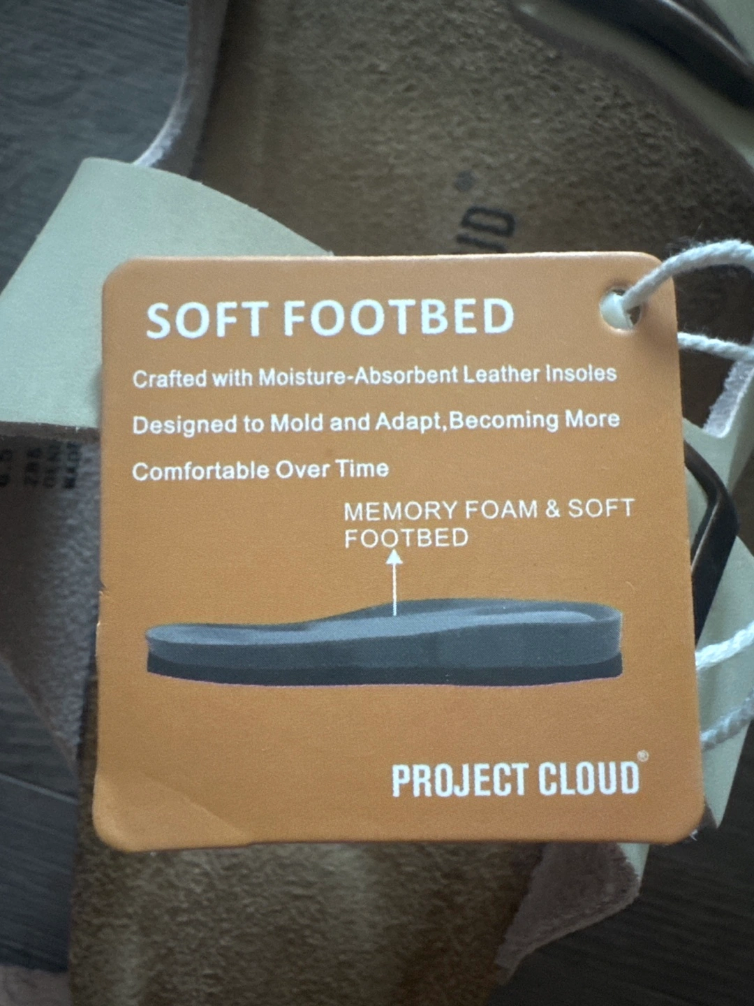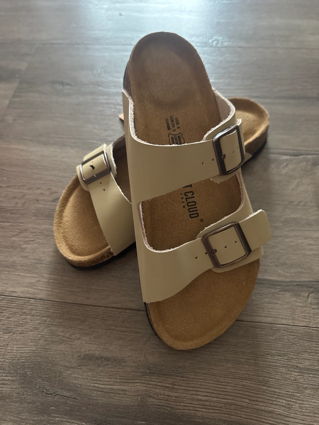 Cream coloured leather sandals. Two buckle straps. Cork footbed. Memory foam and soft footbed. Moisture-absorbent leather insoles. Comfortable.