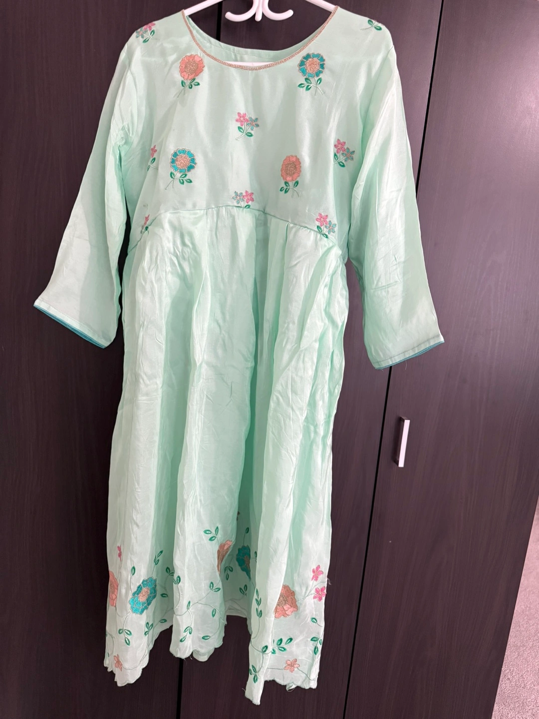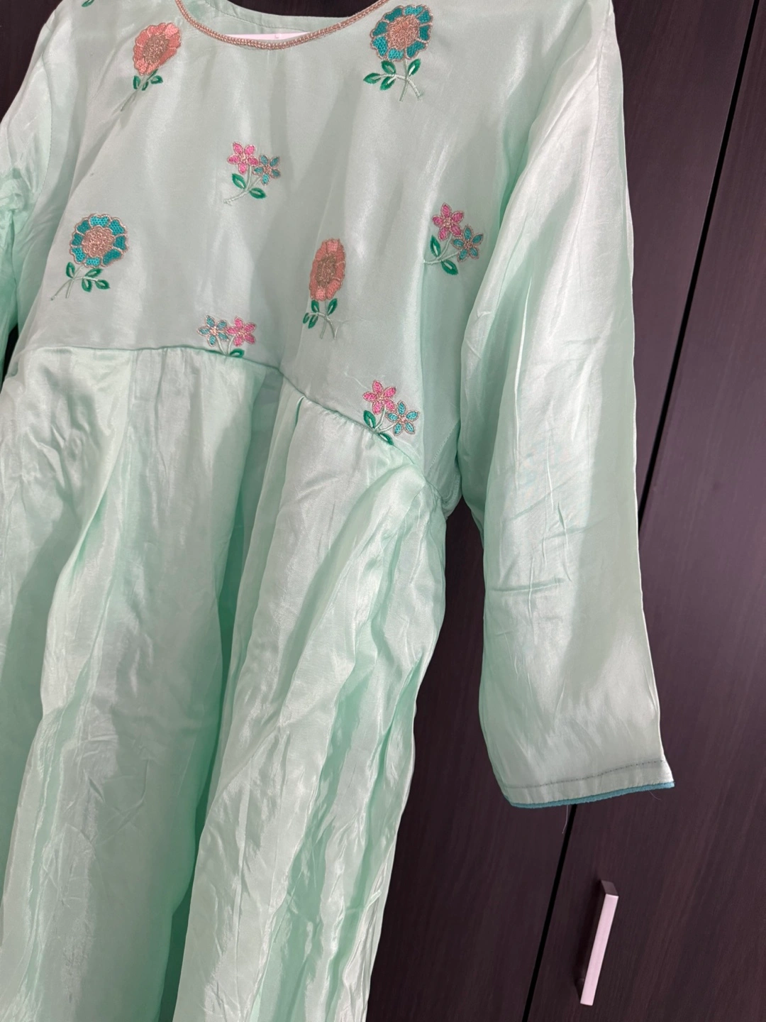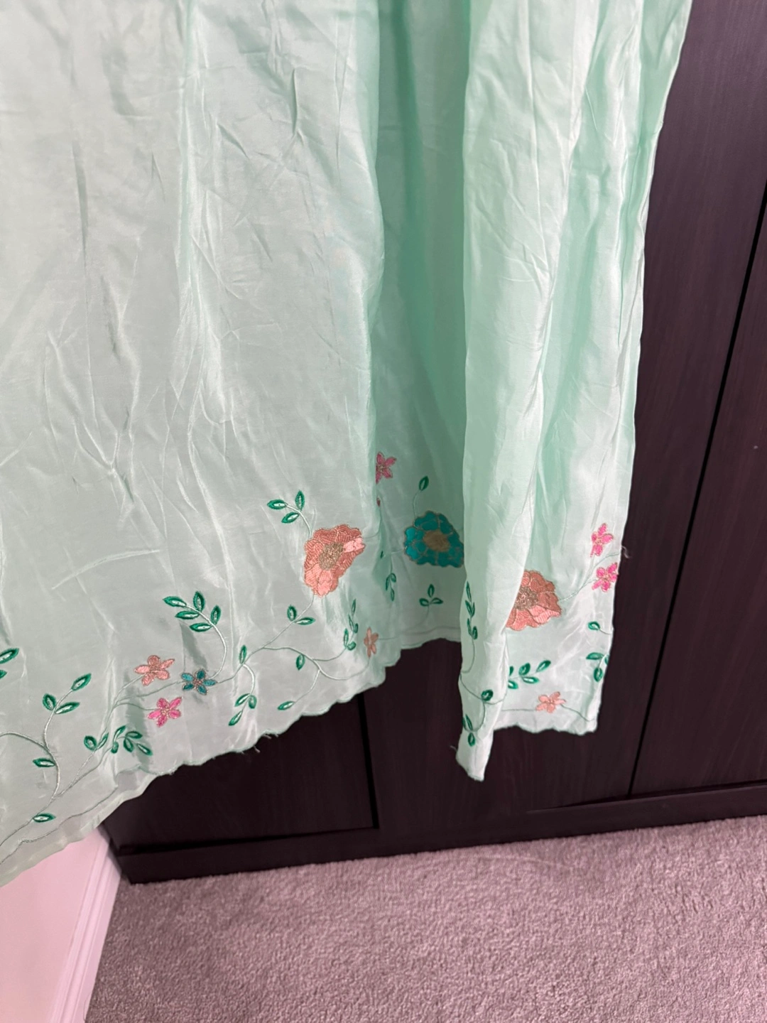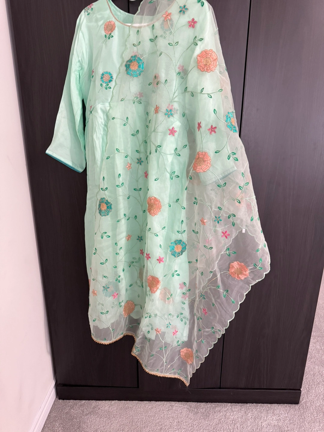 Beautiful mint green designer boutique suit with organza floral dupatta. Features delicate floral embroidery. Three-quarter sleeves. Scalloped hemline. Flowy and comfortable.