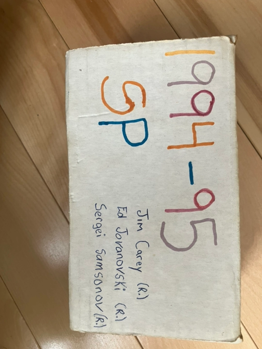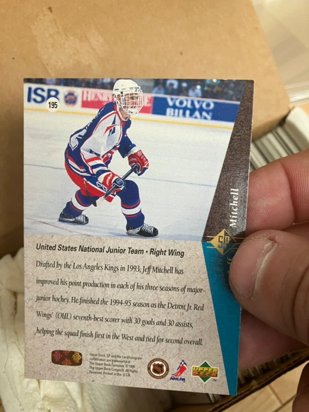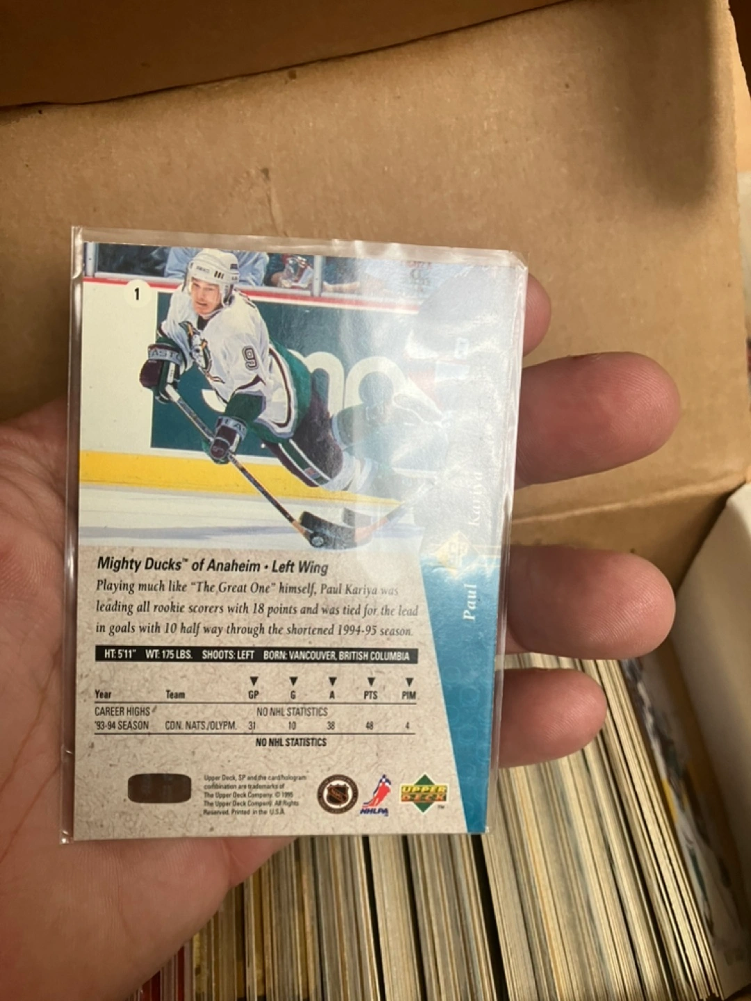 Box of 1994-95 Upper Deck hockey cards. Includes cards of Jeff Mitchell and Paul Kariya. Handwritten names on box.