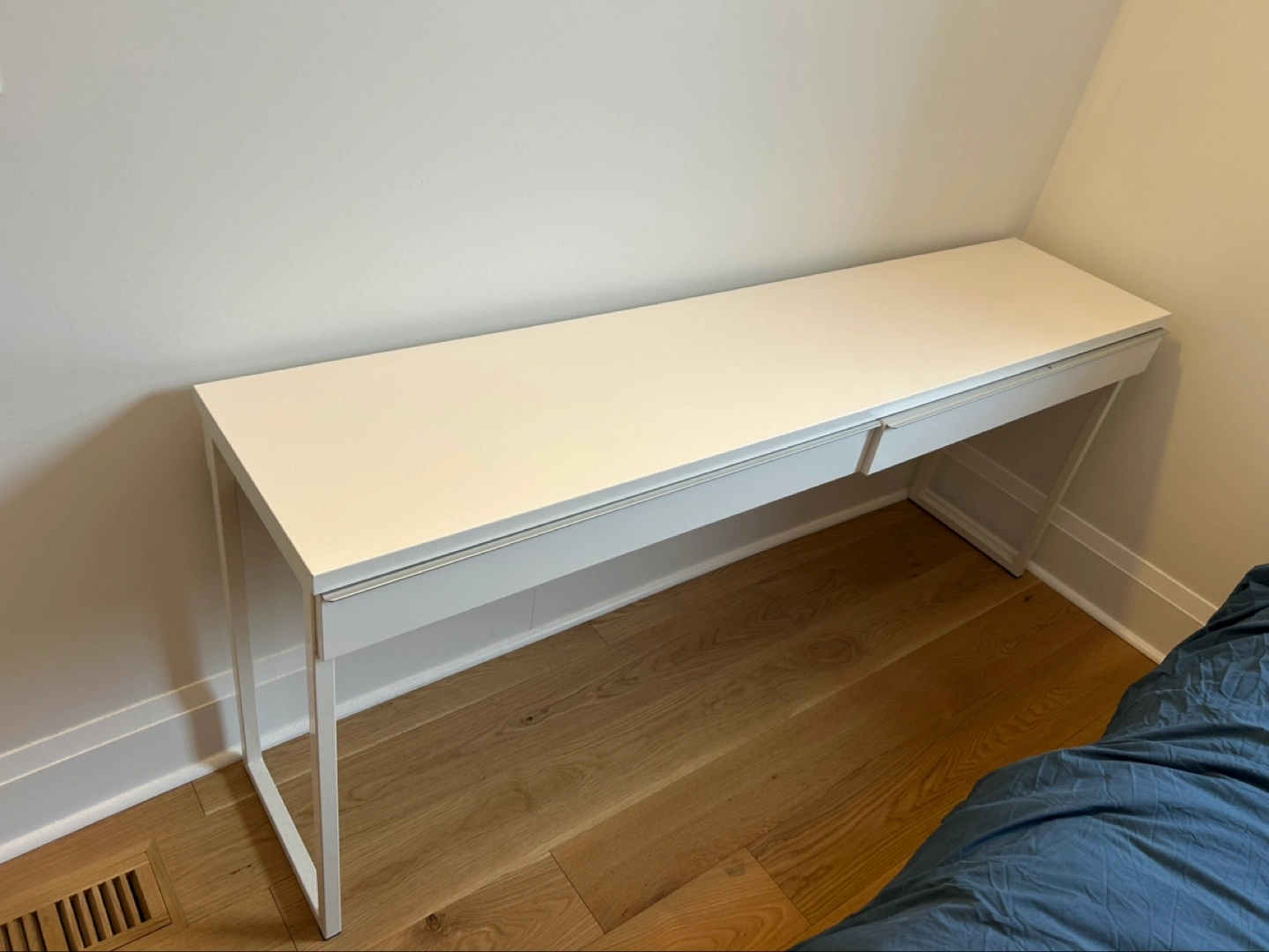 IKEA Long white desk (Besta Burs). Two drawers. Minimalist design. Modern style. Perfect for a bedroom or small office.