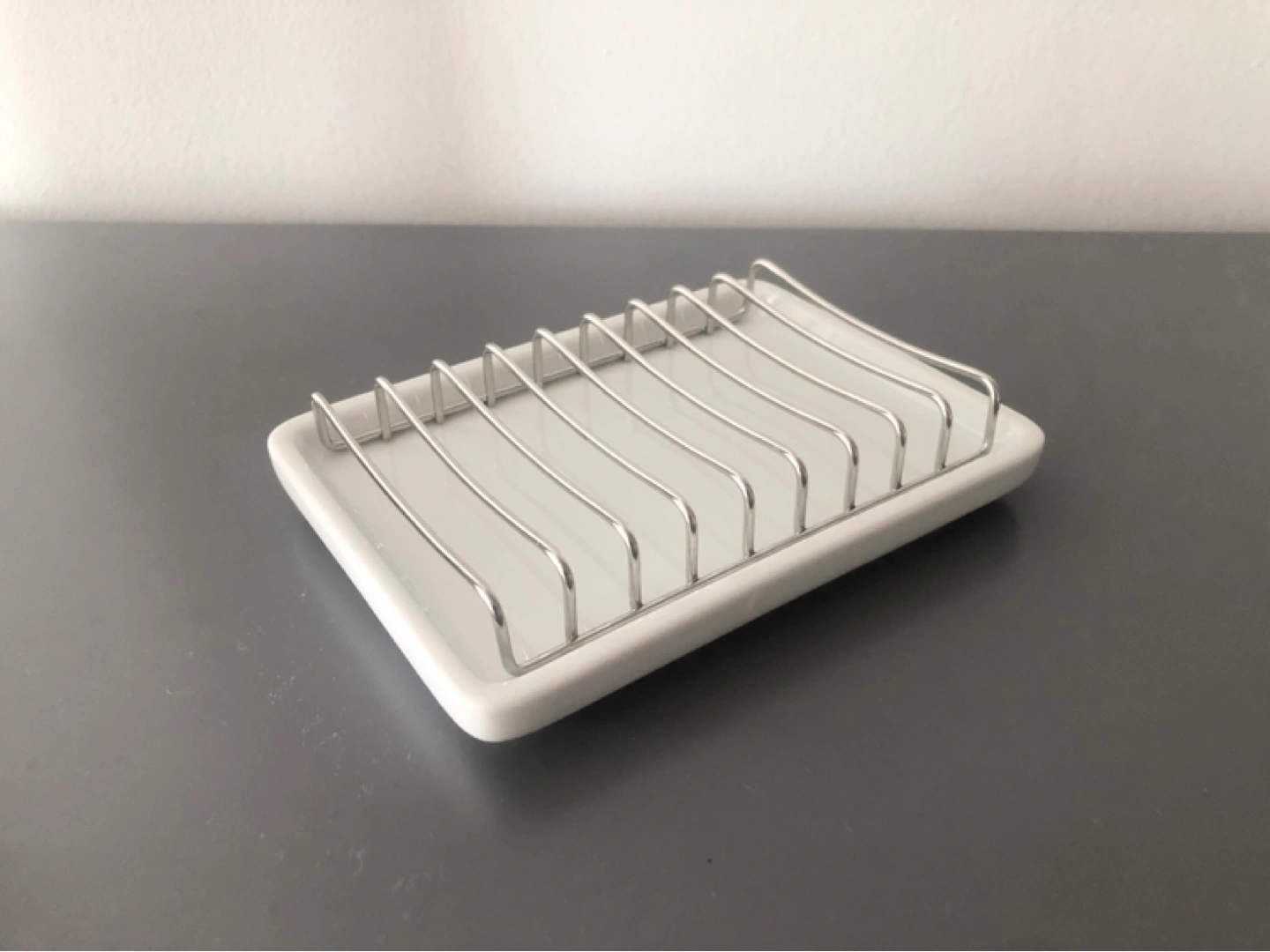 Modern soap dish. Features a white ceramic base and a stainless steel draining rack. Perfect for bathrooms or kitchens.