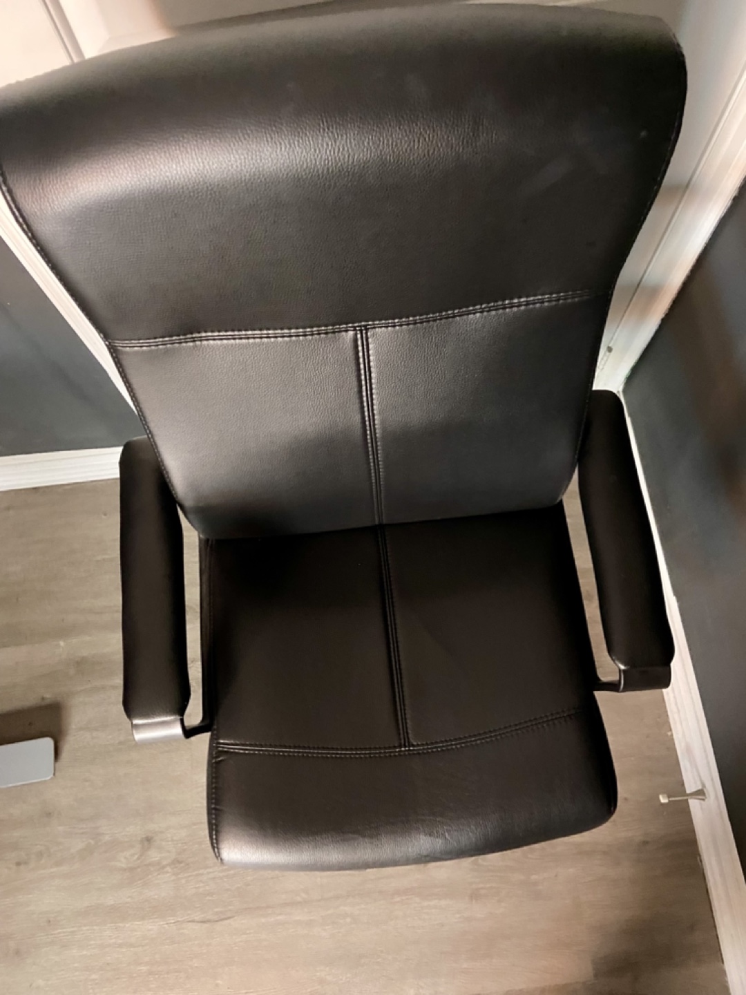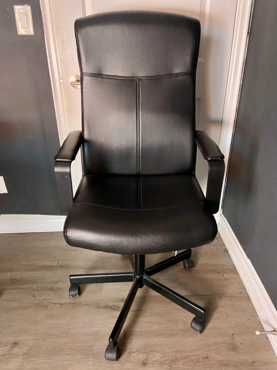Black leather office chair. Five-star base with casters. Adjustable height. Good for home or office use. Slight wear.