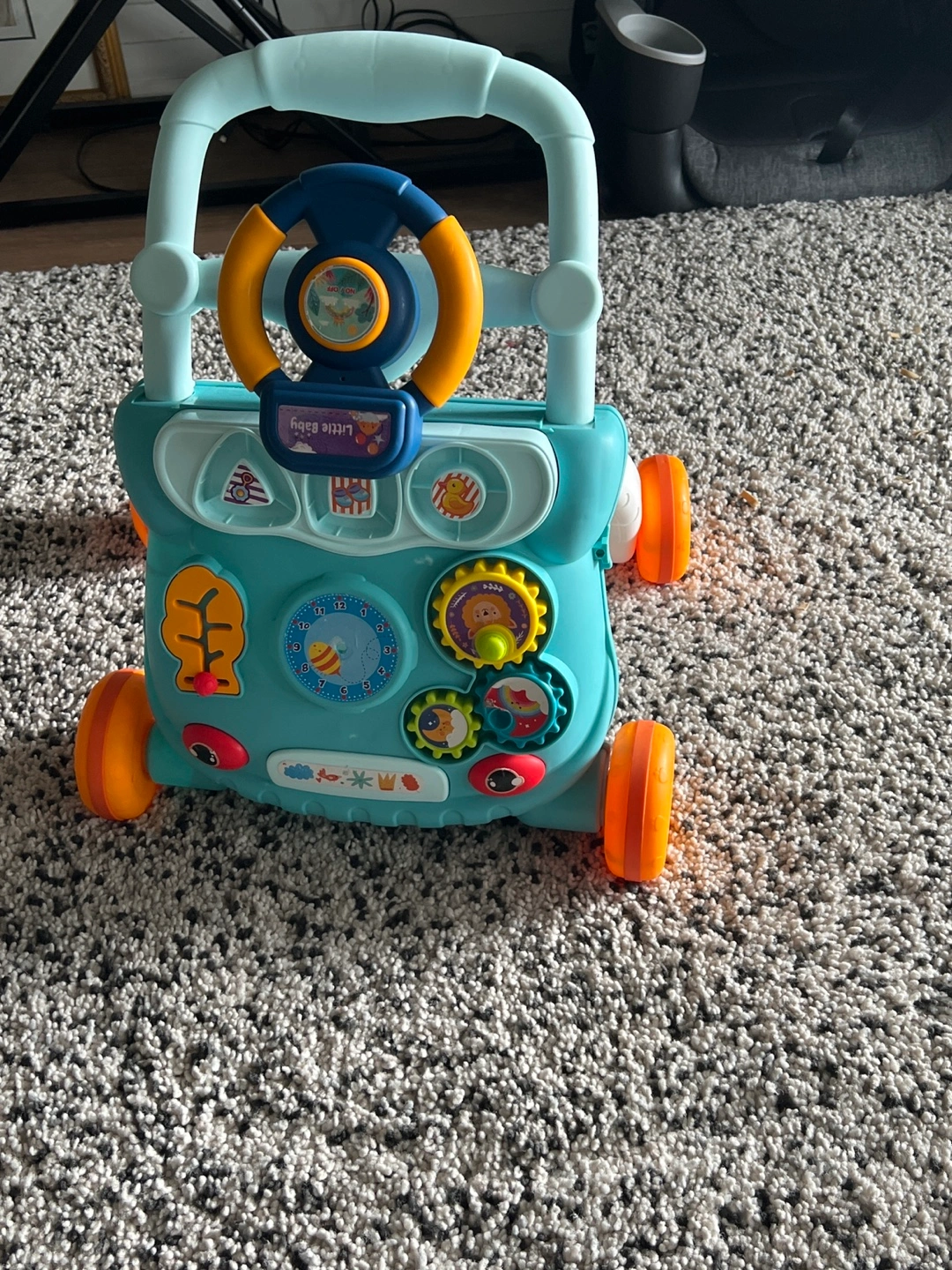 Fun baby walker, features activity panel with various shapes, colours, and sounds. Great for encouraging independent movement. Sturdy wheels and comfortable handle.