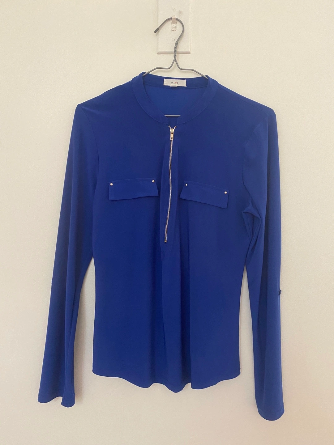 Women's royal blue long sleeve blouse. Features a mock neck, front zipper closure, and two pockets. Gold zipper and accents. Long sleeves with slight bell cuffs.
