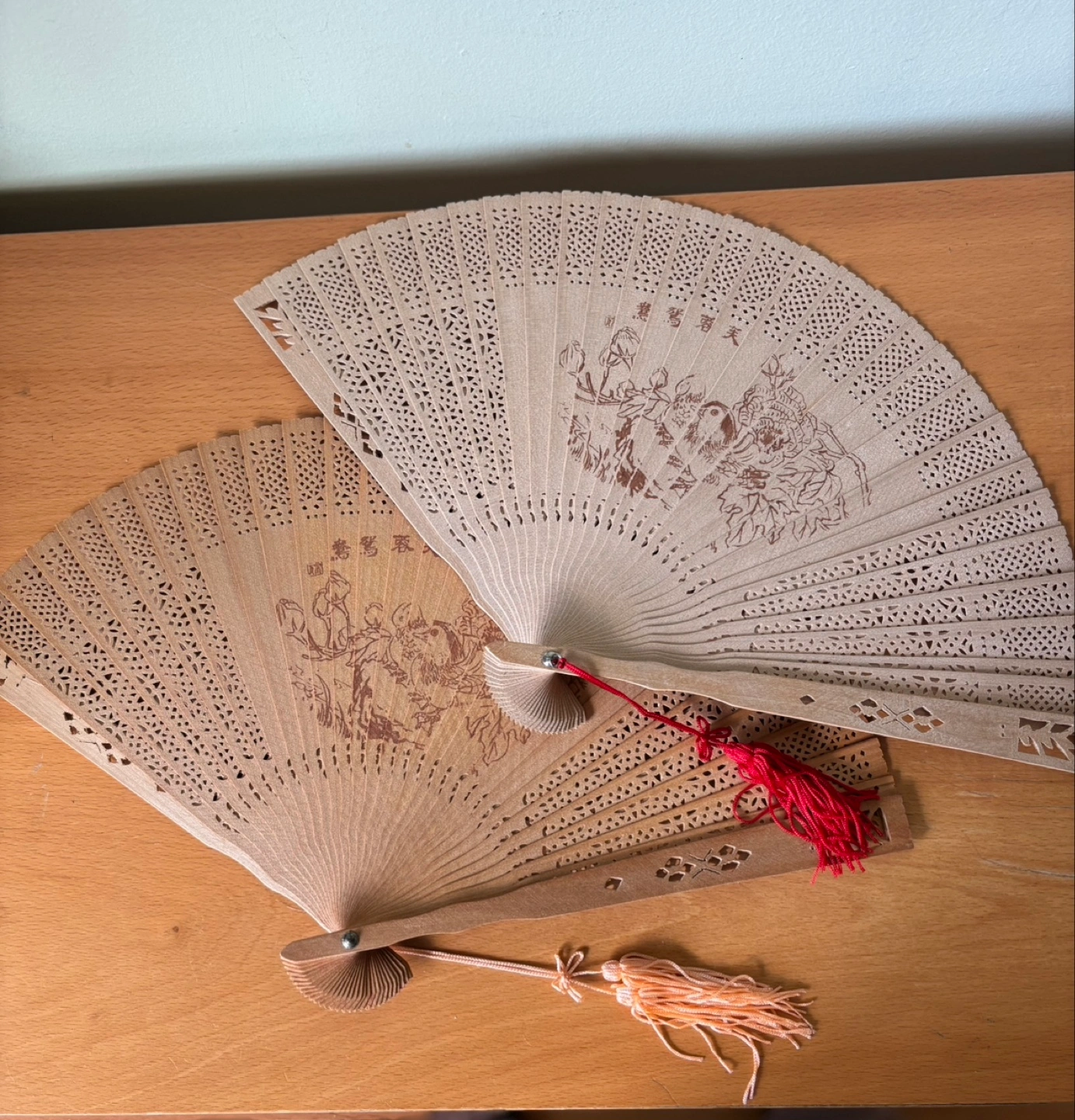 Scented beautiful, vintage Chinese hand fans. Wooden construction, intricate carvings. Each features a unique design and comes with a tassel. Stored in decorative cases. Never used. Case length 9 3/4”, Fan slightly shorter than case length.