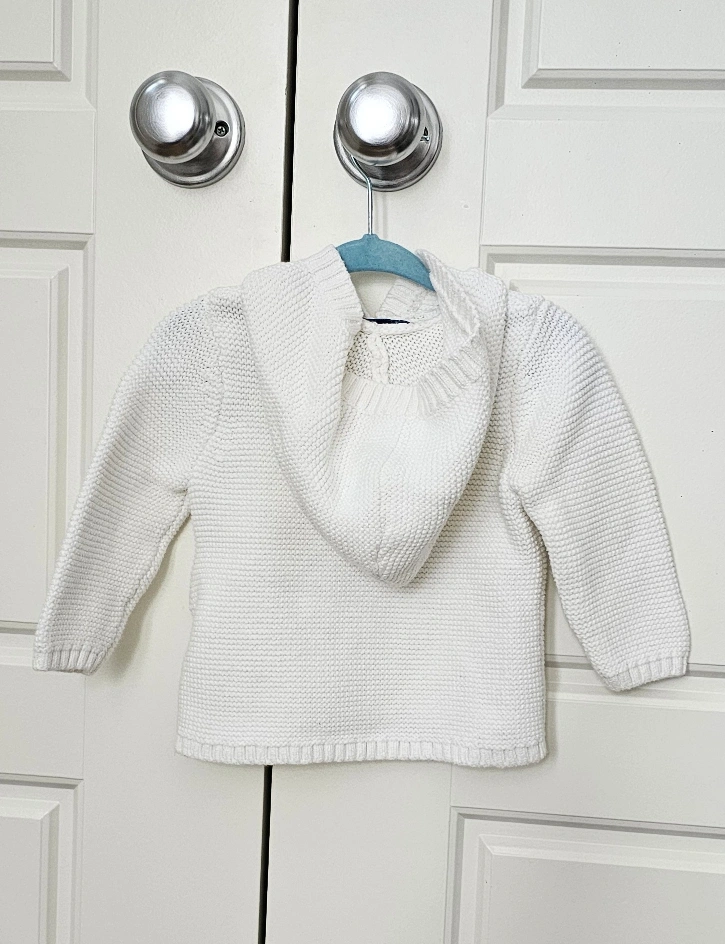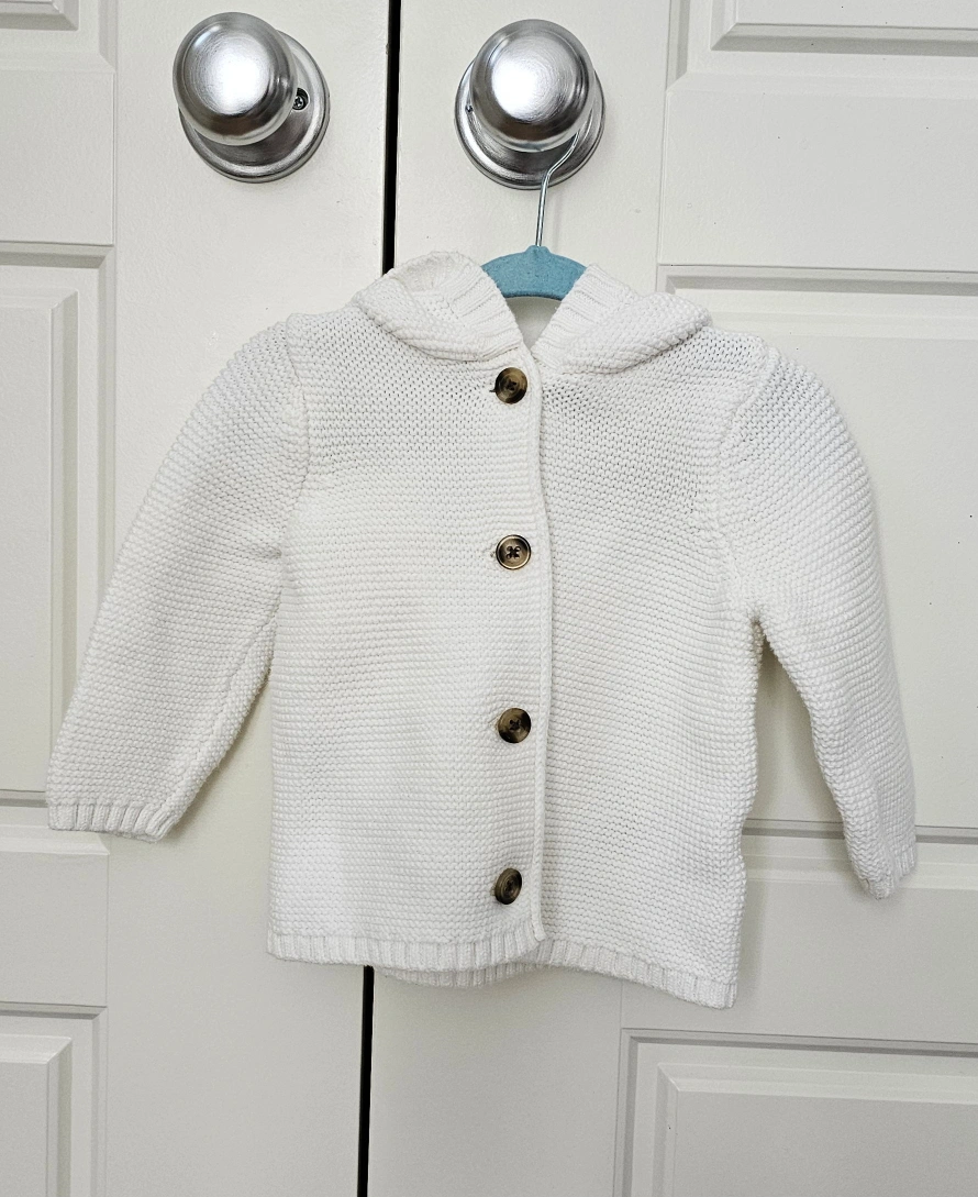 Adorable cream-coloured hooded baby cardigan. Soft knit fabric. Button closure. Perfect for layering. Washed but never used. 6-12 months