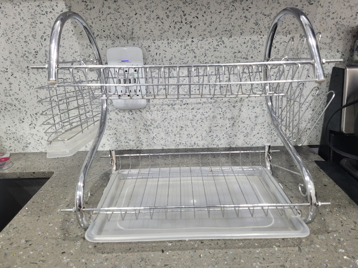 Chrome dish rack, two tiers. Includes a cutlery holder and a plastic draining tray. Durable metal construction. Great for small kitchens.