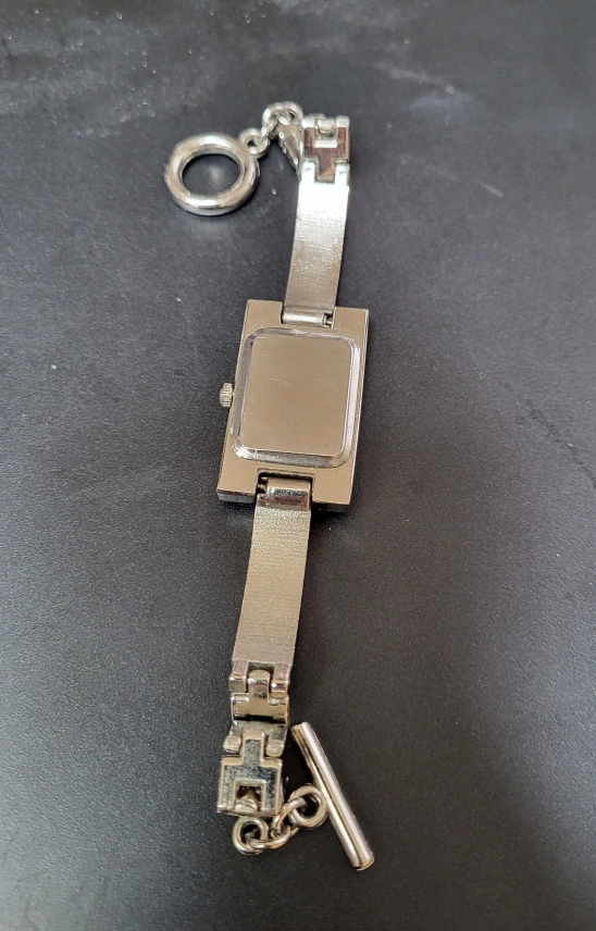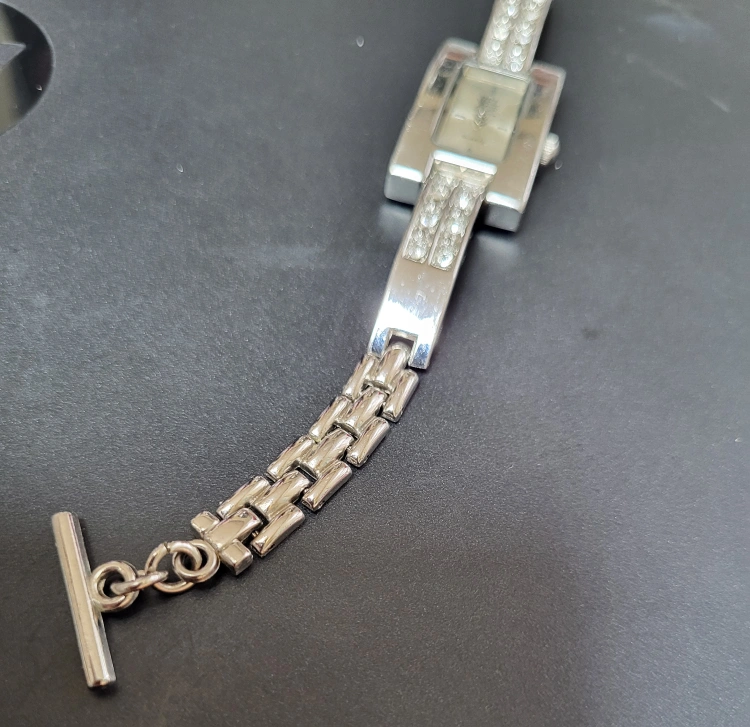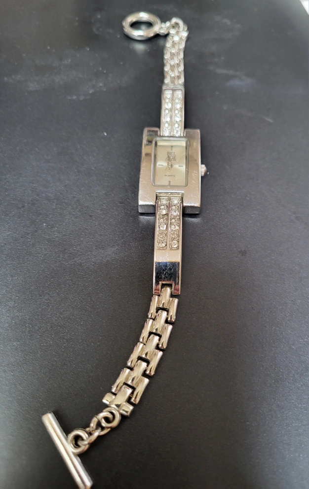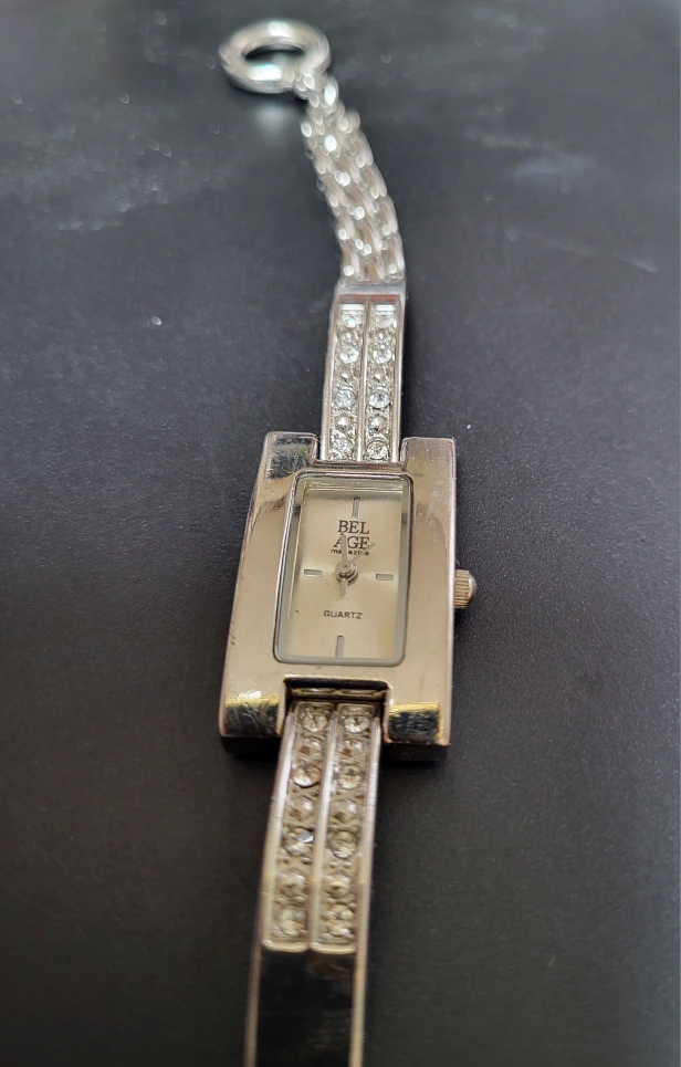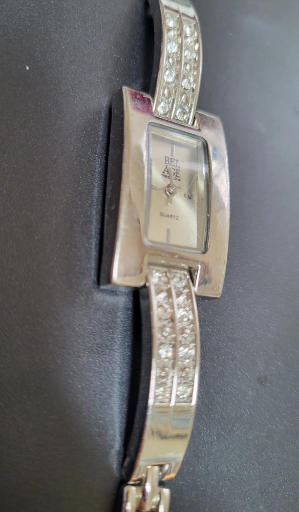 Elegant silver tone watch. Features a rectangular face, crystal accents, and a linked bracelet. Quartz movement. Bel age magazine & Quartz written on face. Bar clasp closure