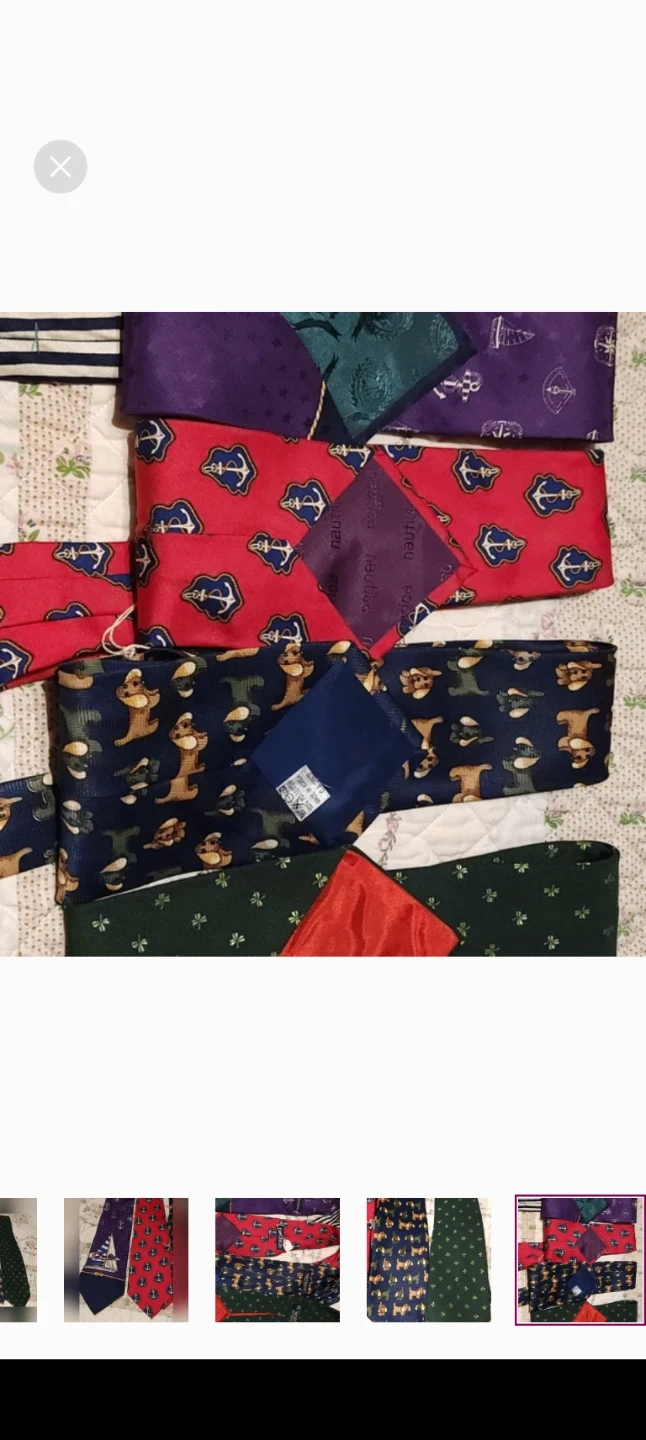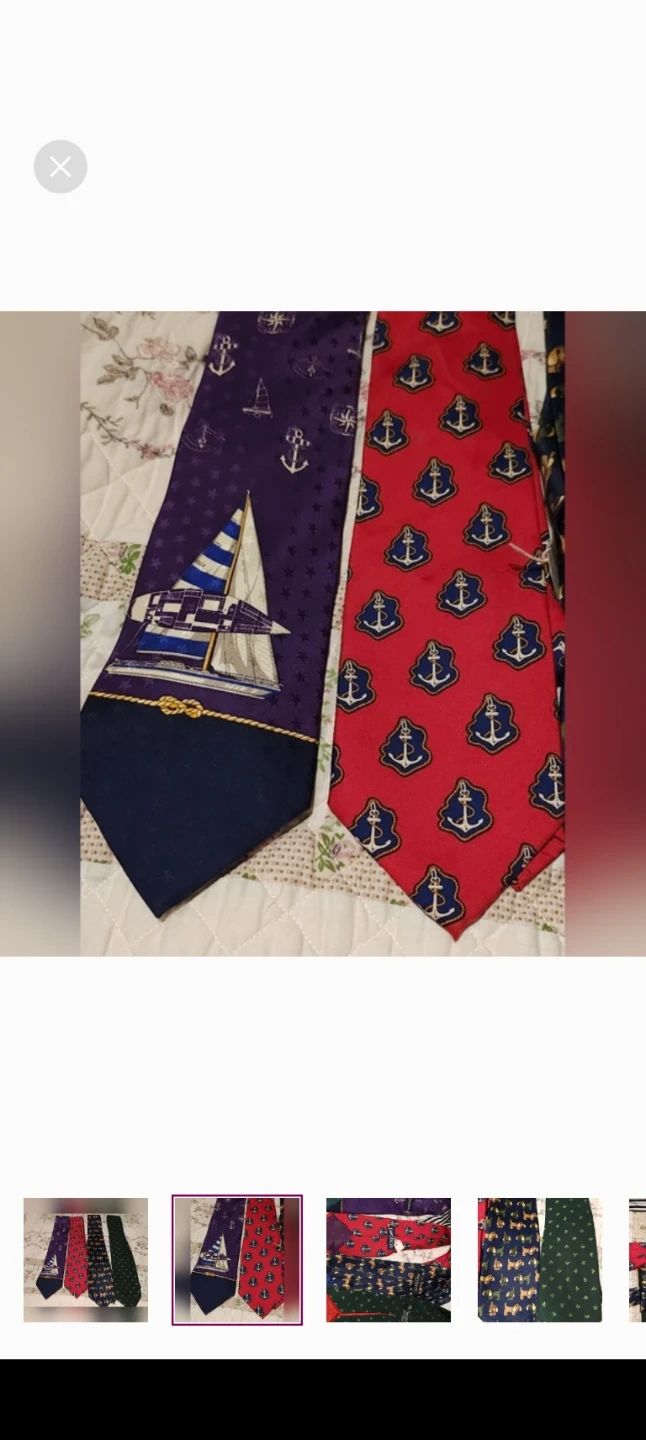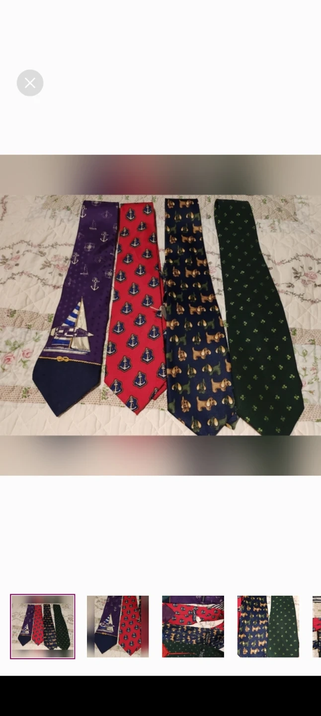 A collection of four men's neckties, including one from Nautica with anchors and one with a sailboat design. The other ties feature dog and shamrock patterns. These ties are made of silk and polyester blends.