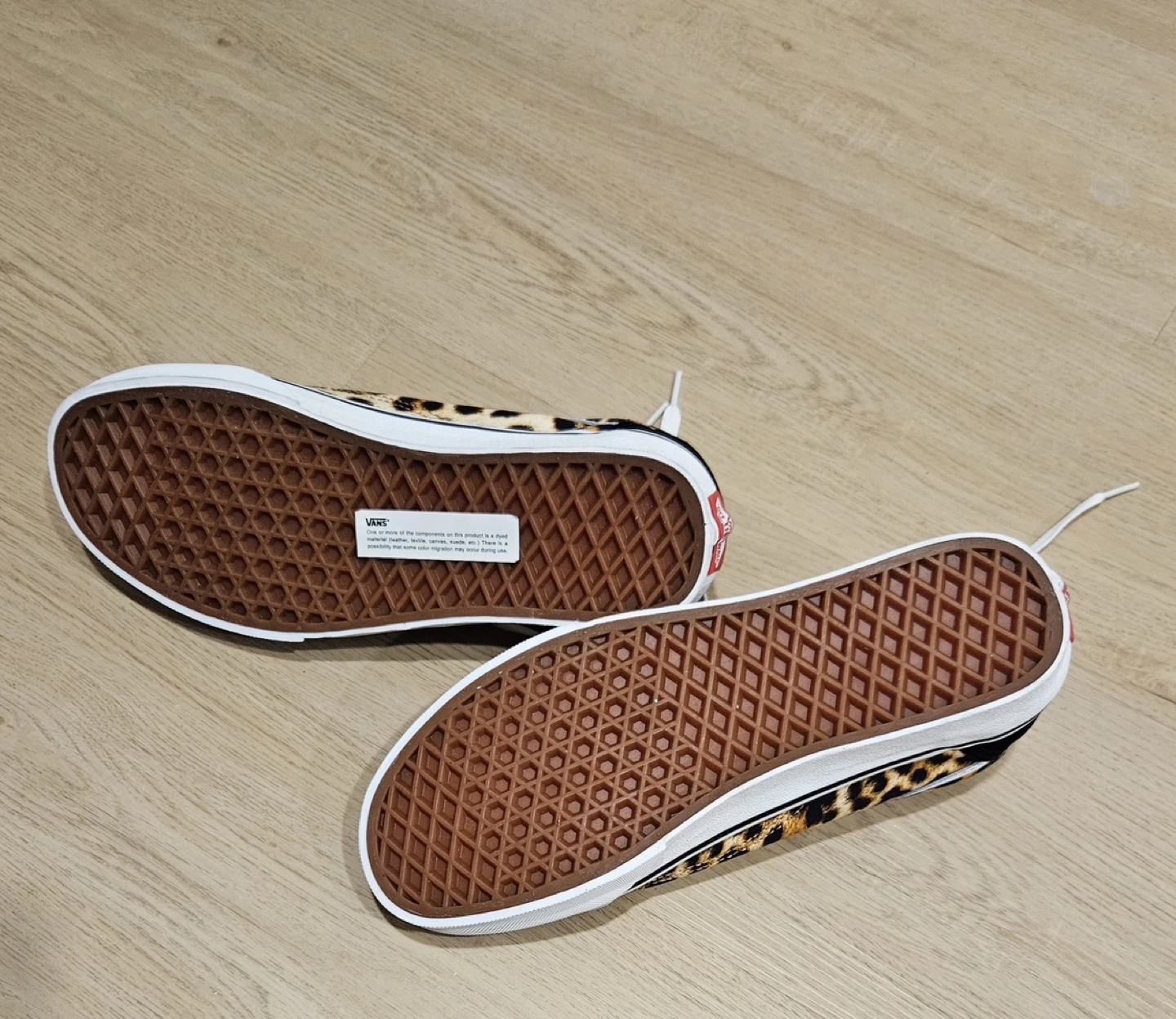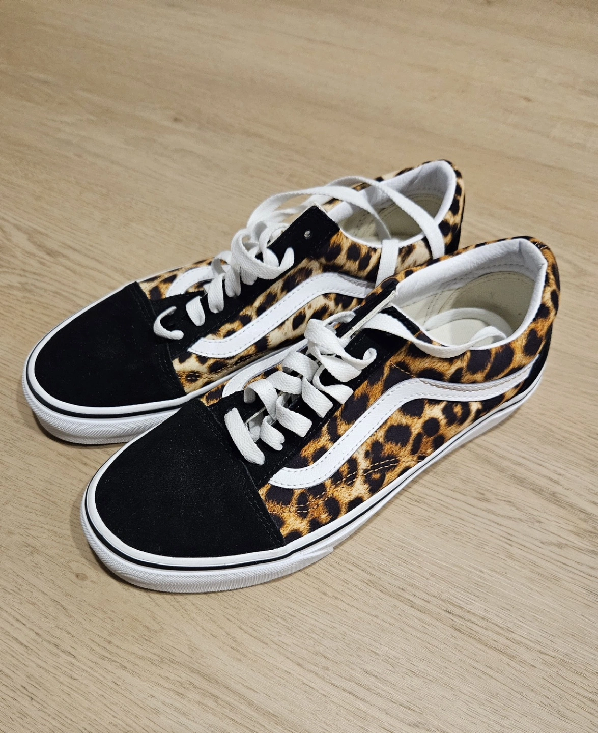 Unisex Vans Old Skool sneakers. Leopard print canvas upper. Black suede accents. White midsole. Waffle outsole.