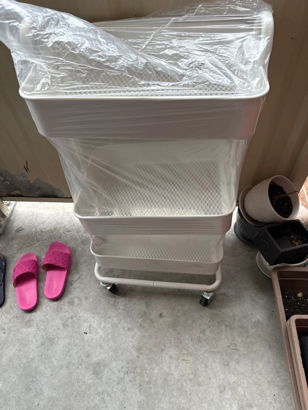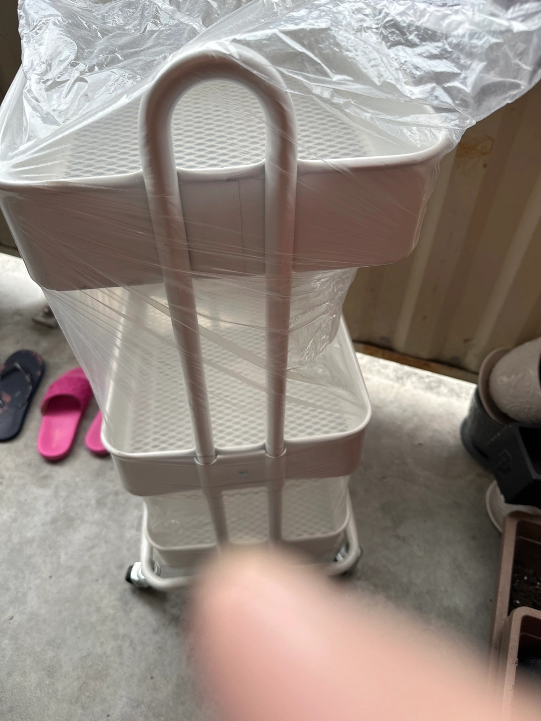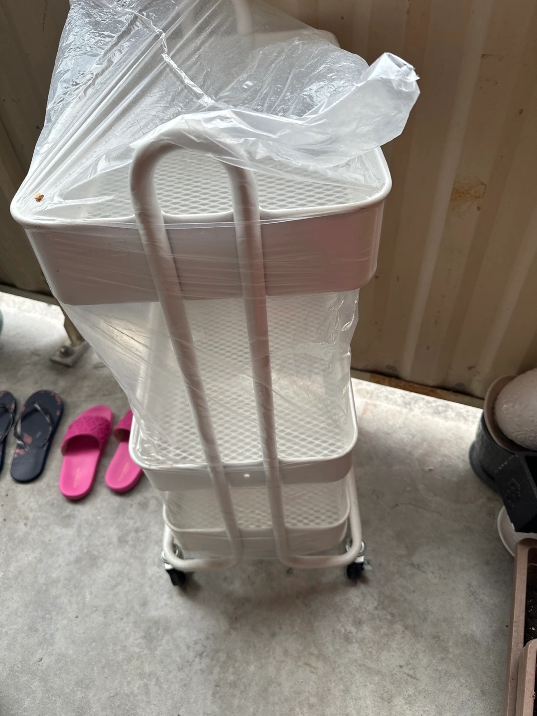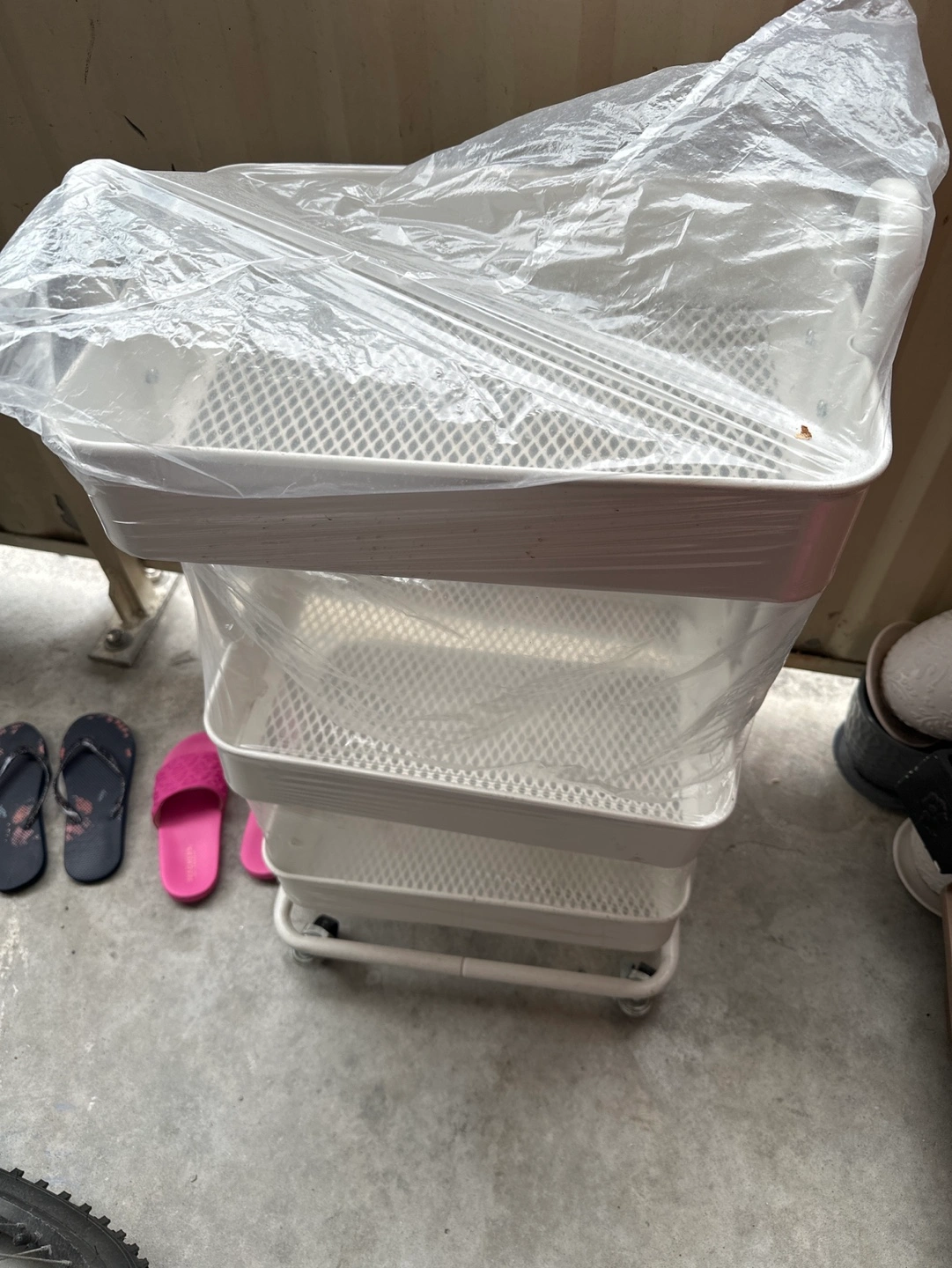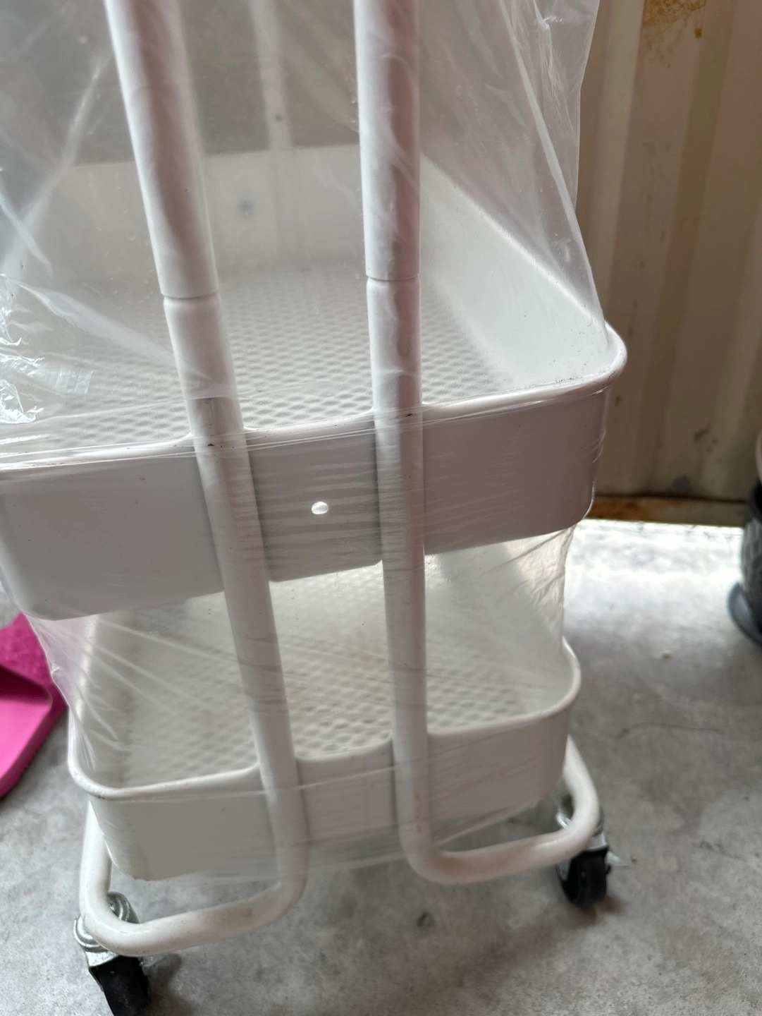 Three-tiered rolling cart. White metal frame. Mesh trays. Wheels for easy mobility. , in pictures one screw is missing of one side rack of middle one ,other wise it’s new , will are good working wheels