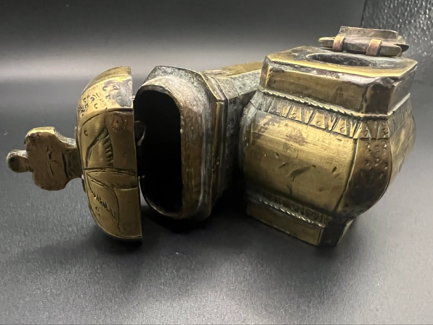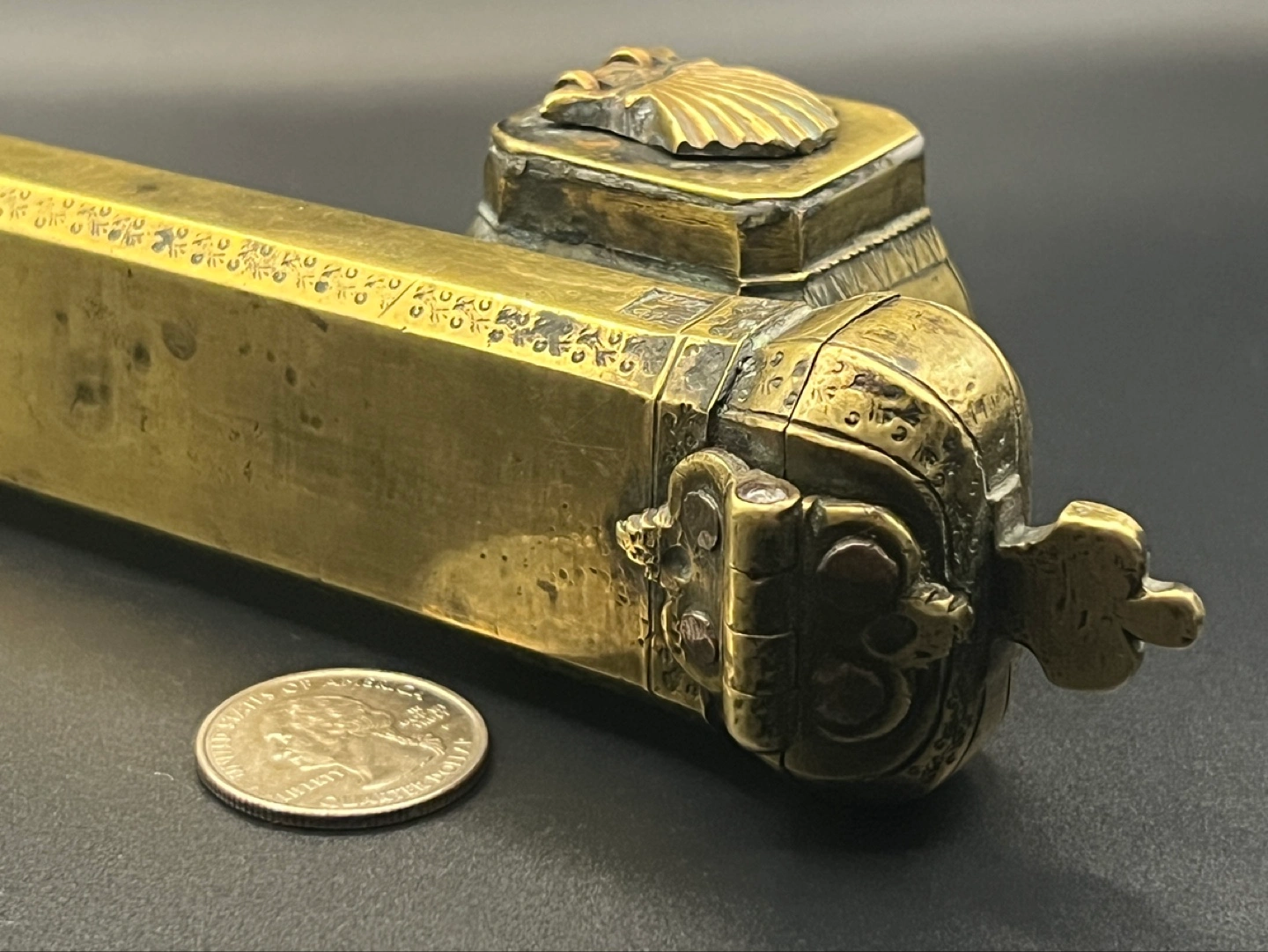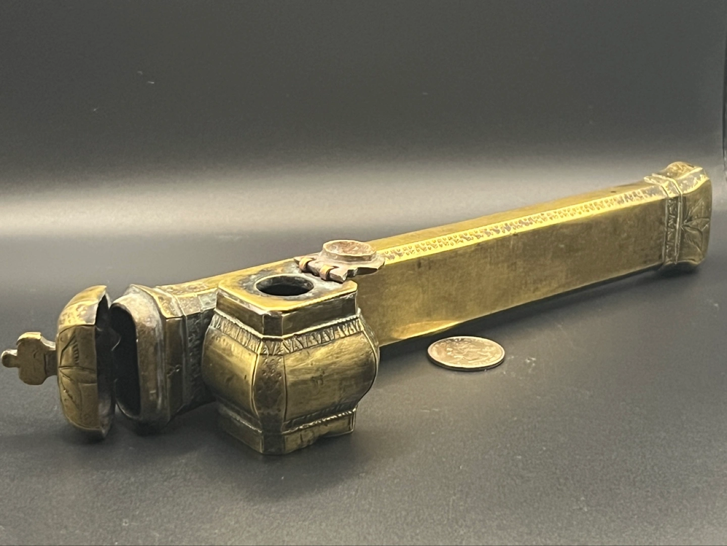 Antique 19th century Ottoman brass divit or qalamdan, a combination inkwell and pen box.