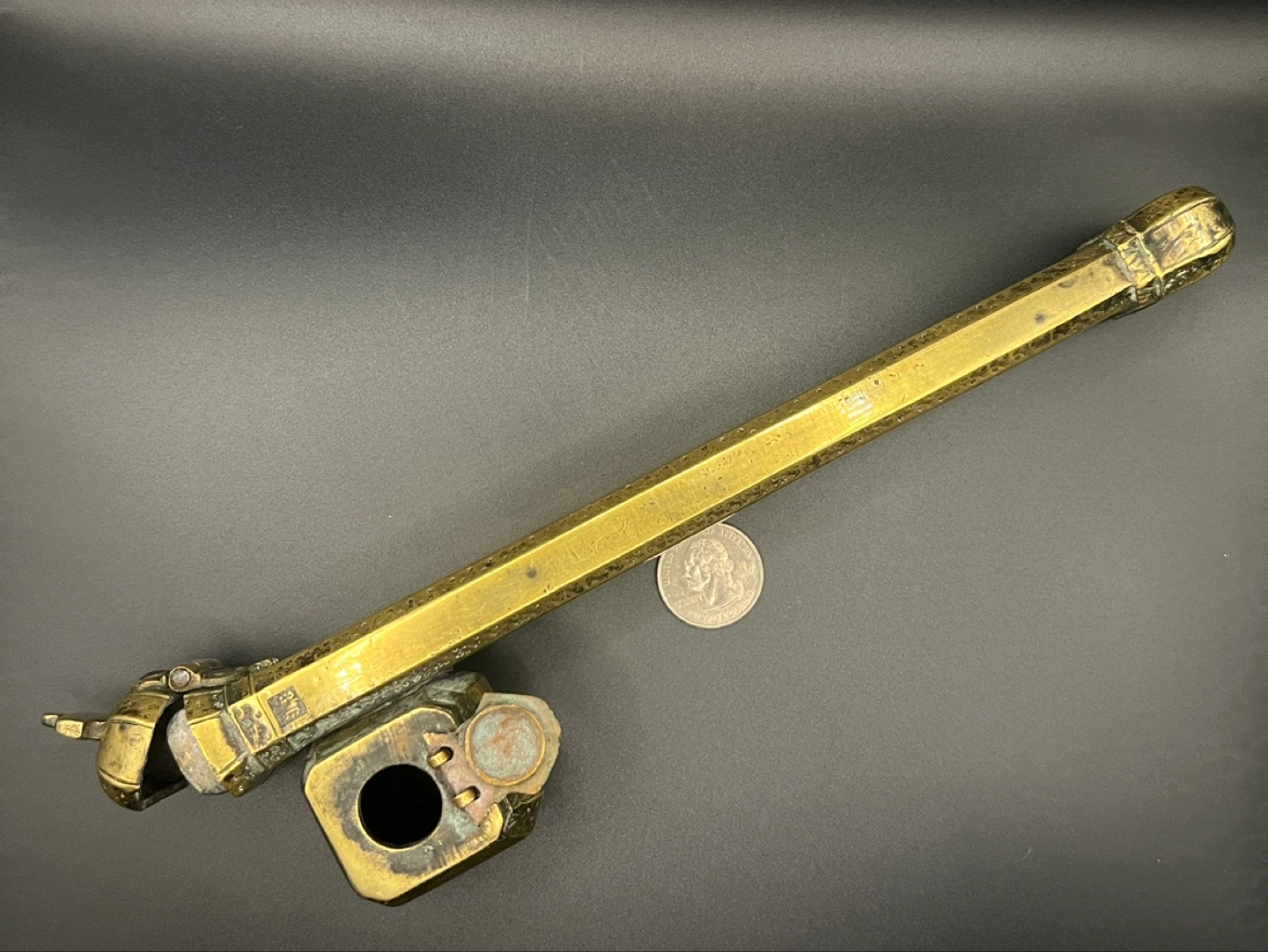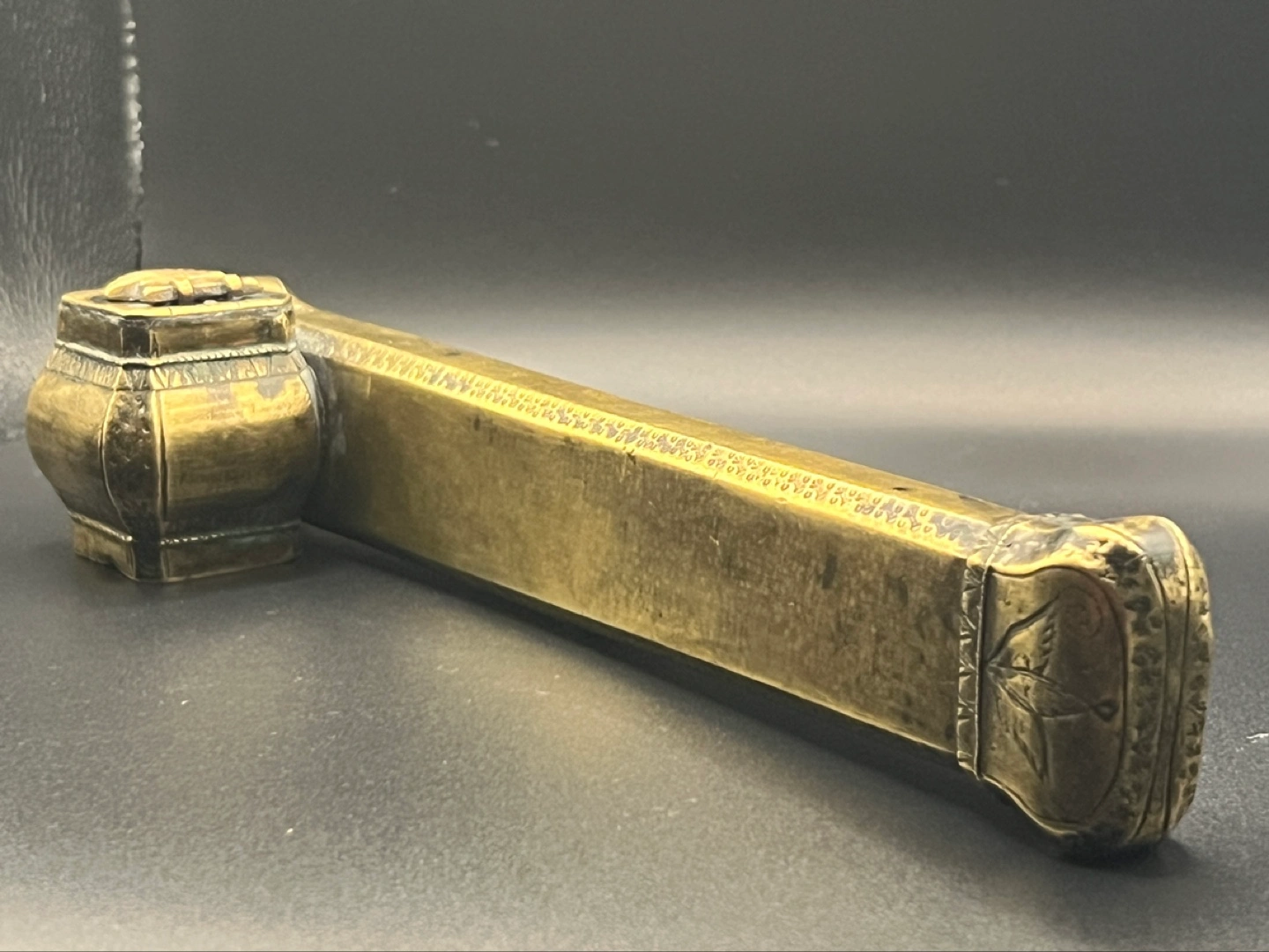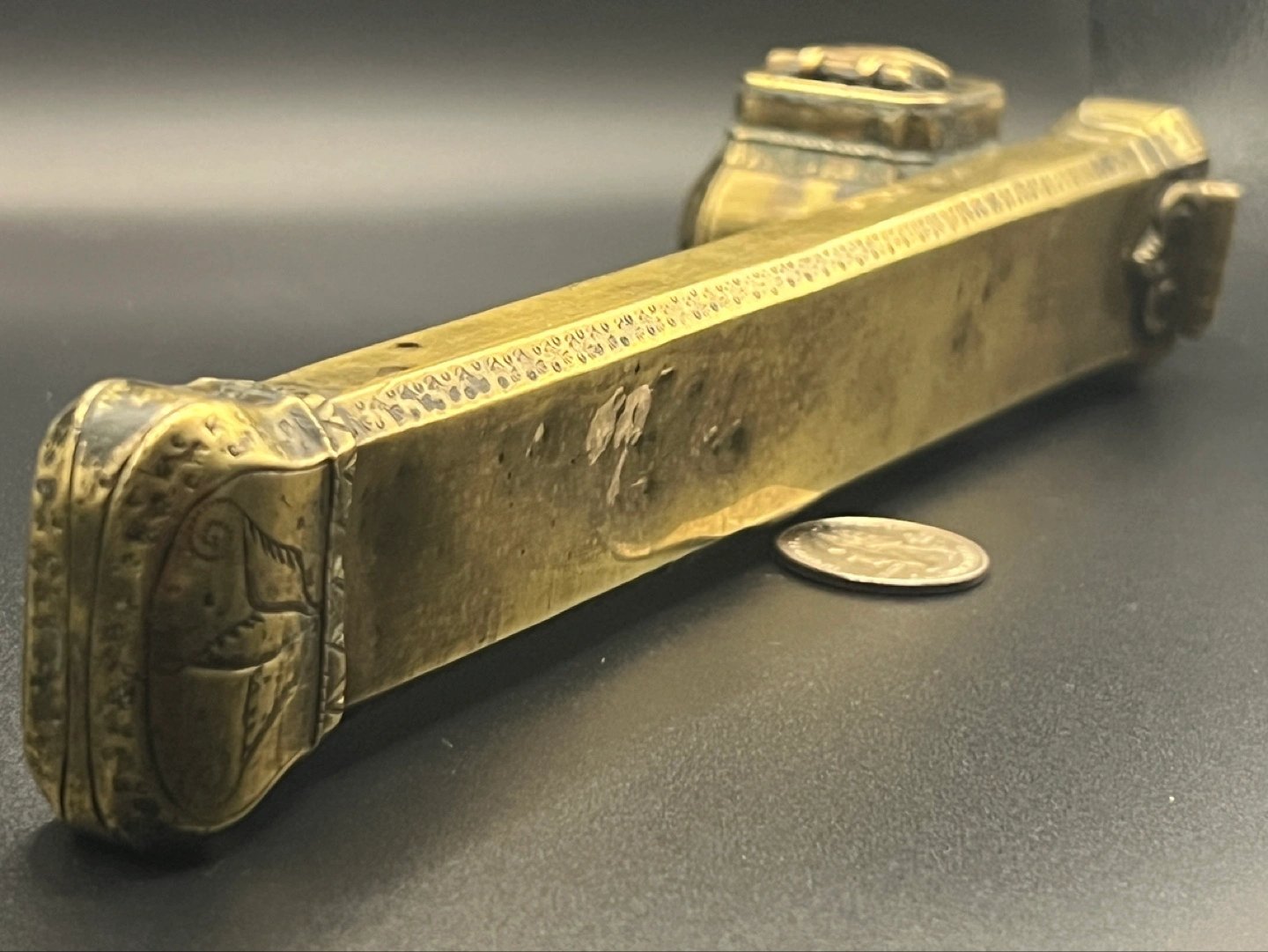 Antique 19th century Ottoman brass divit or qalamdan, a combination inkwell and pen box.