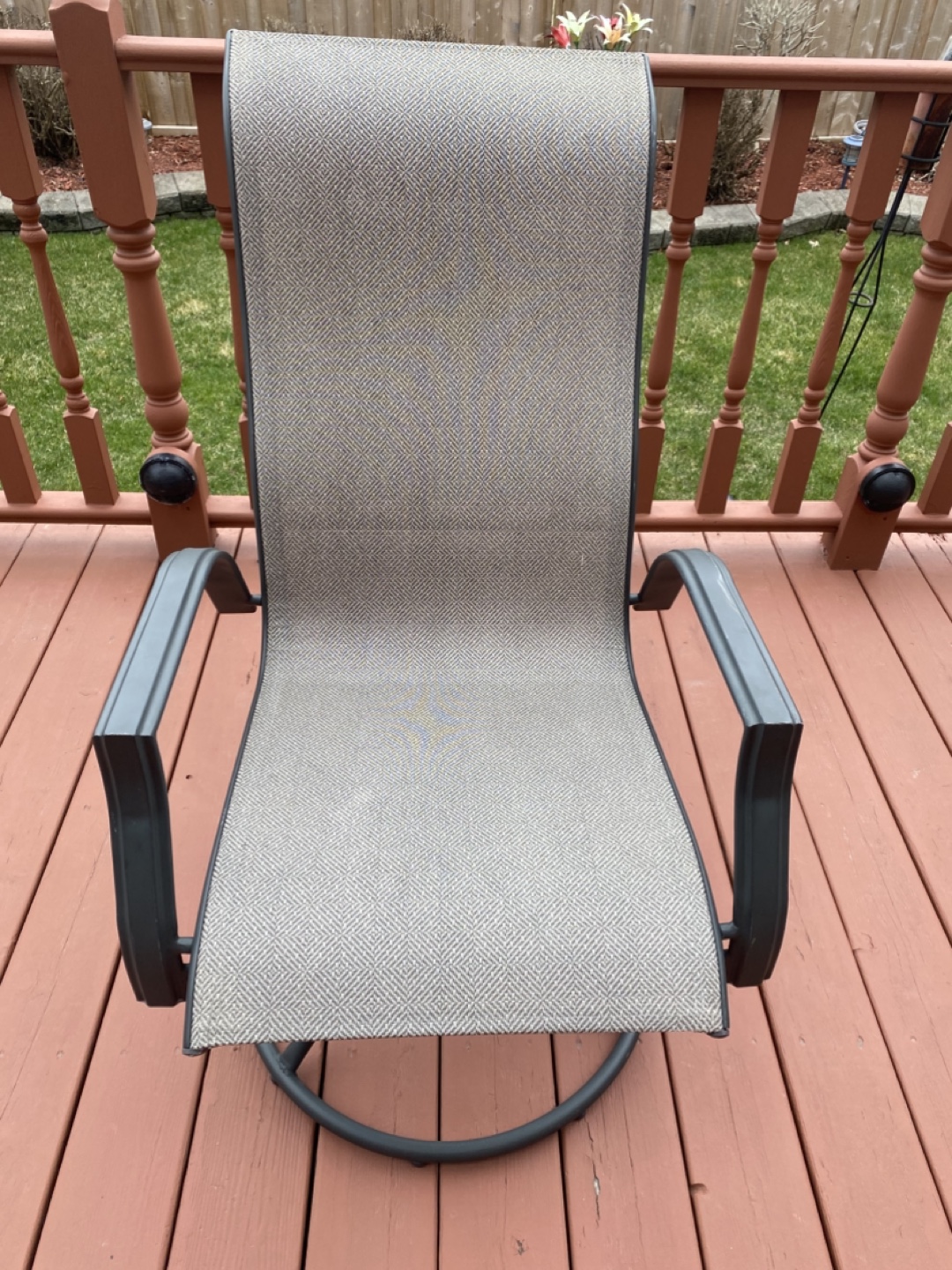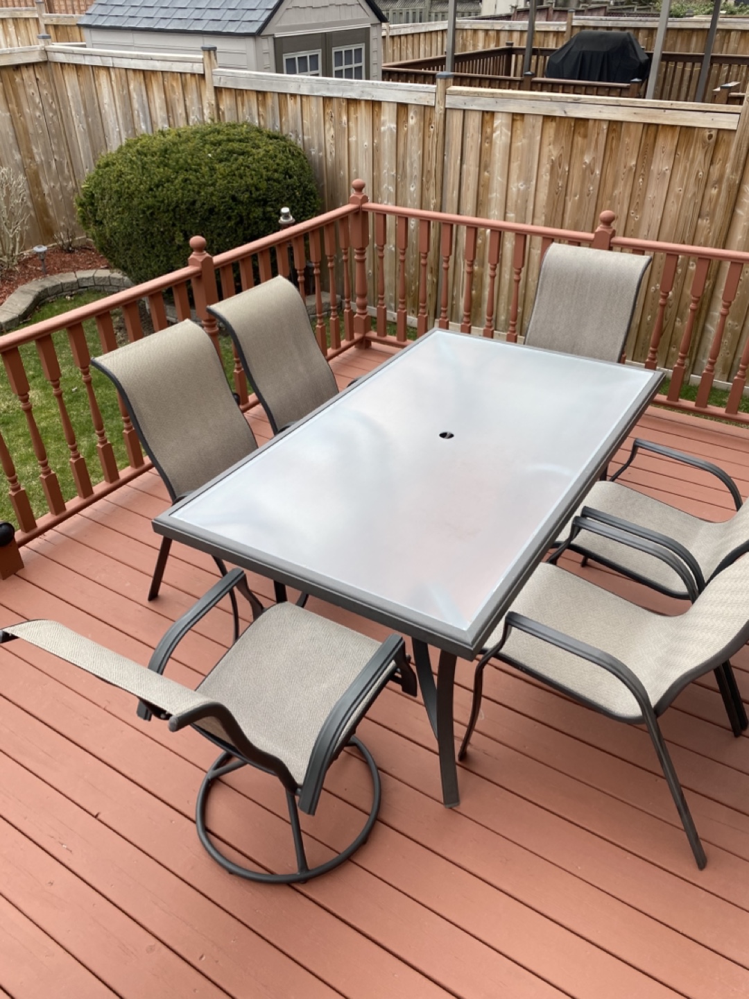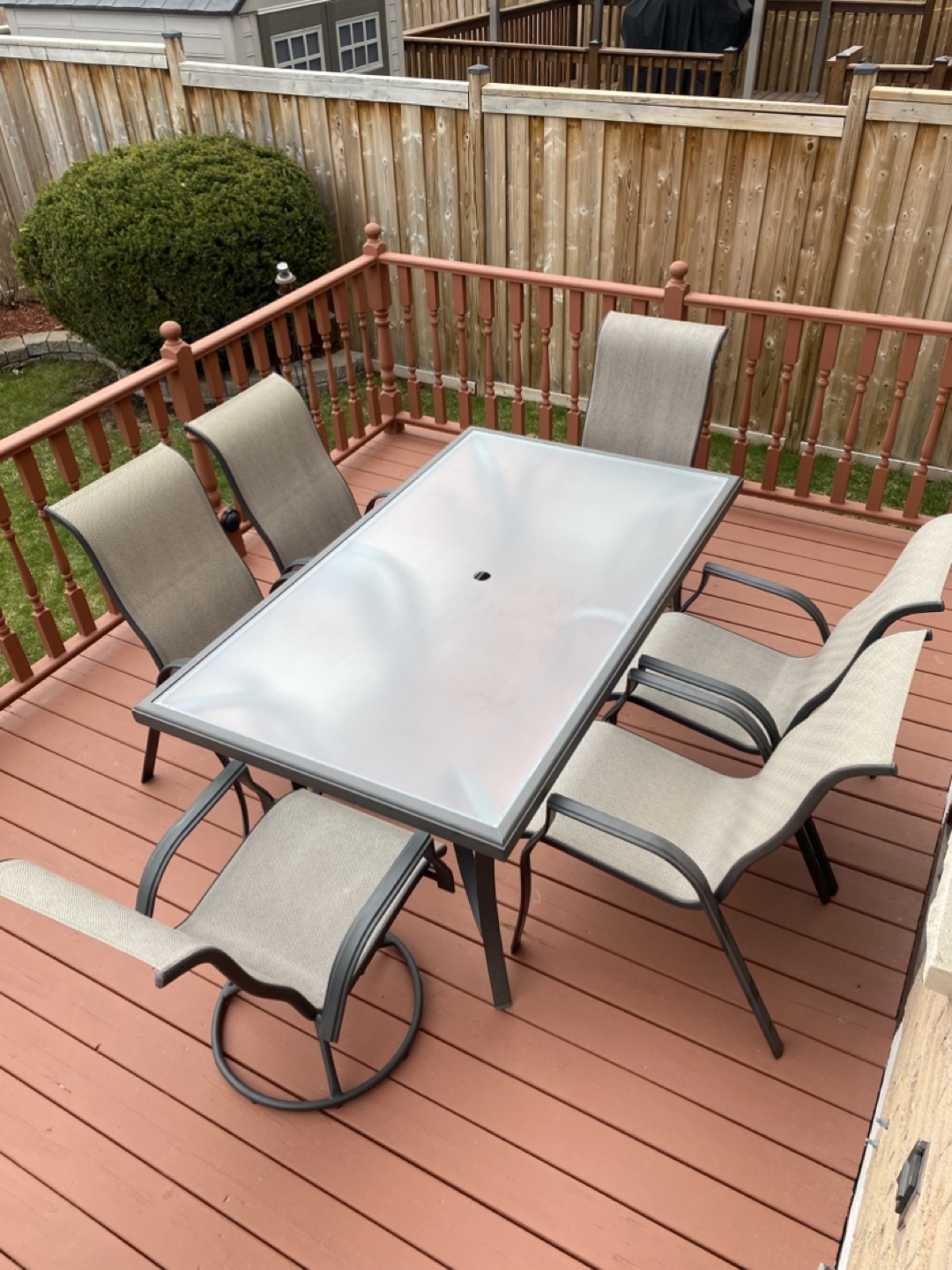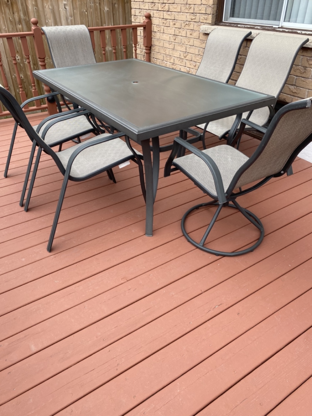 Outdoor patio furniture set. Includes one rectangular table and six sling chairs. Great for entertaining.