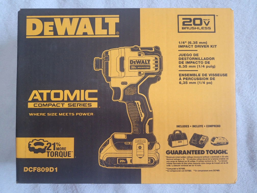 126Unopened New Dewalt Atomic Compact Series impact driver kit. 20V max brushless motor. 21% more torque. Includes battery and carrying case. Model DCF809D1.