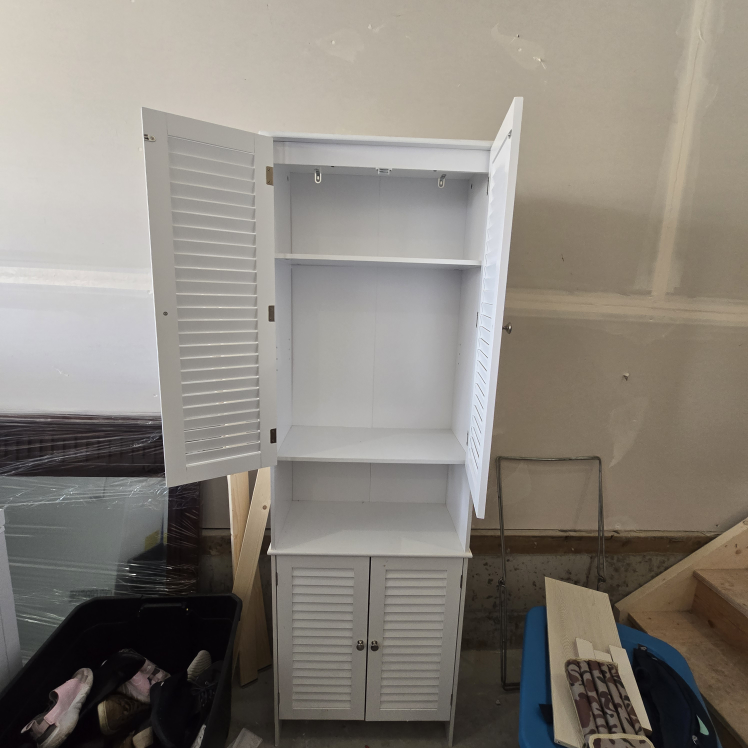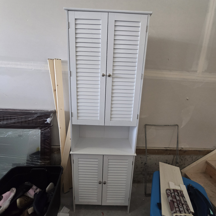 Tall white cabinet, perfect for storage. Two doors at the top and two at the bottom. Multiple shelves inside. Good condition.