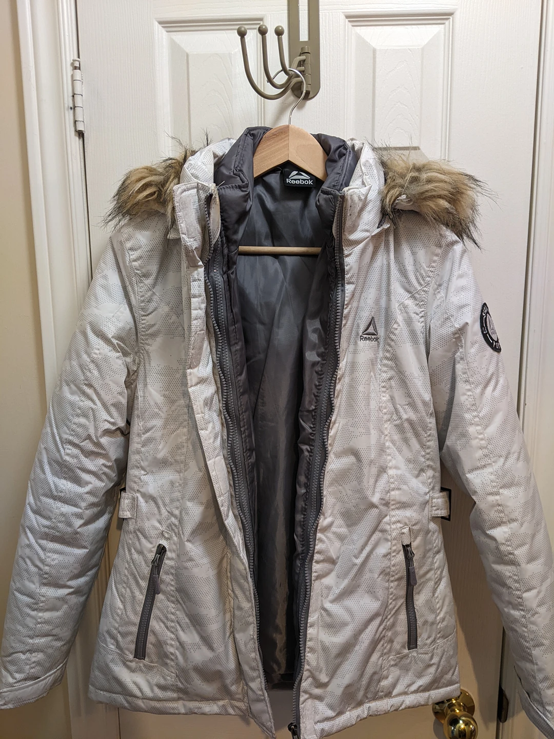Nice double jacket, excellent for cold weather. It can separate to a lighter grey jacket or use it double for more protection. Size Small, Brand Reebok, Color White with gray pattern. In very good condition.