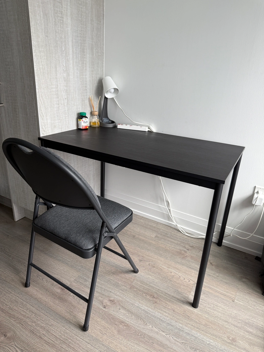 Simple black computer desk, great for small spaces. Includes a foldable chair. Minimalist design, easy to assemble.