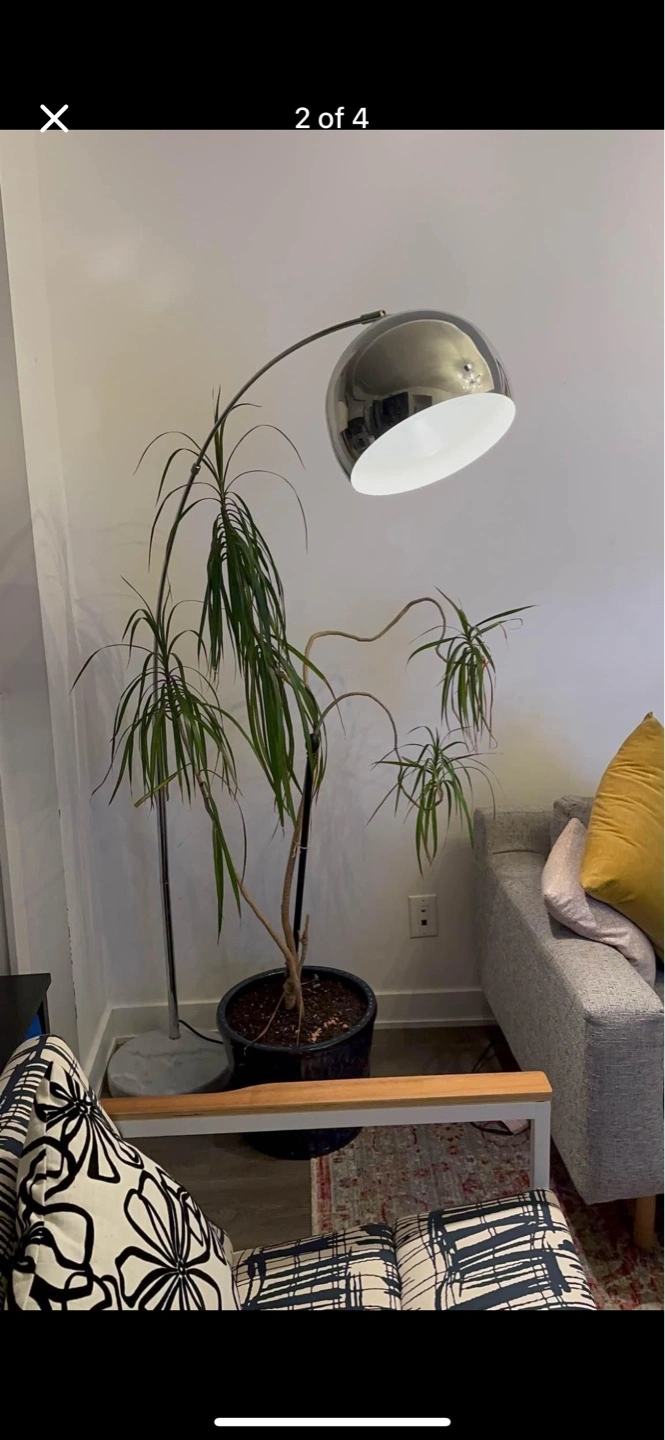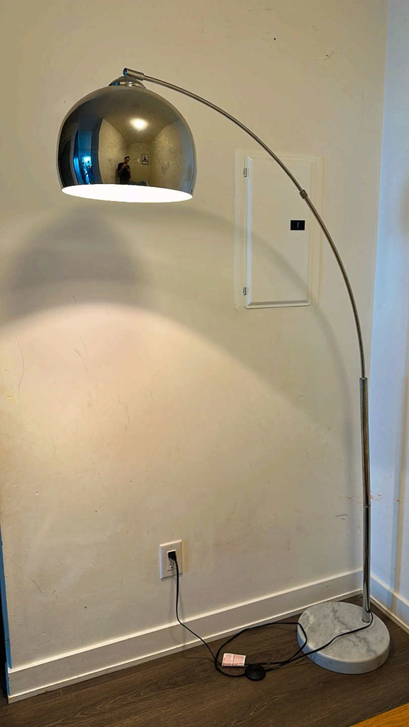 Modern arc floor lamp. Features a chrome finish and a marble base. Curved design. Great for living room or bedroom.