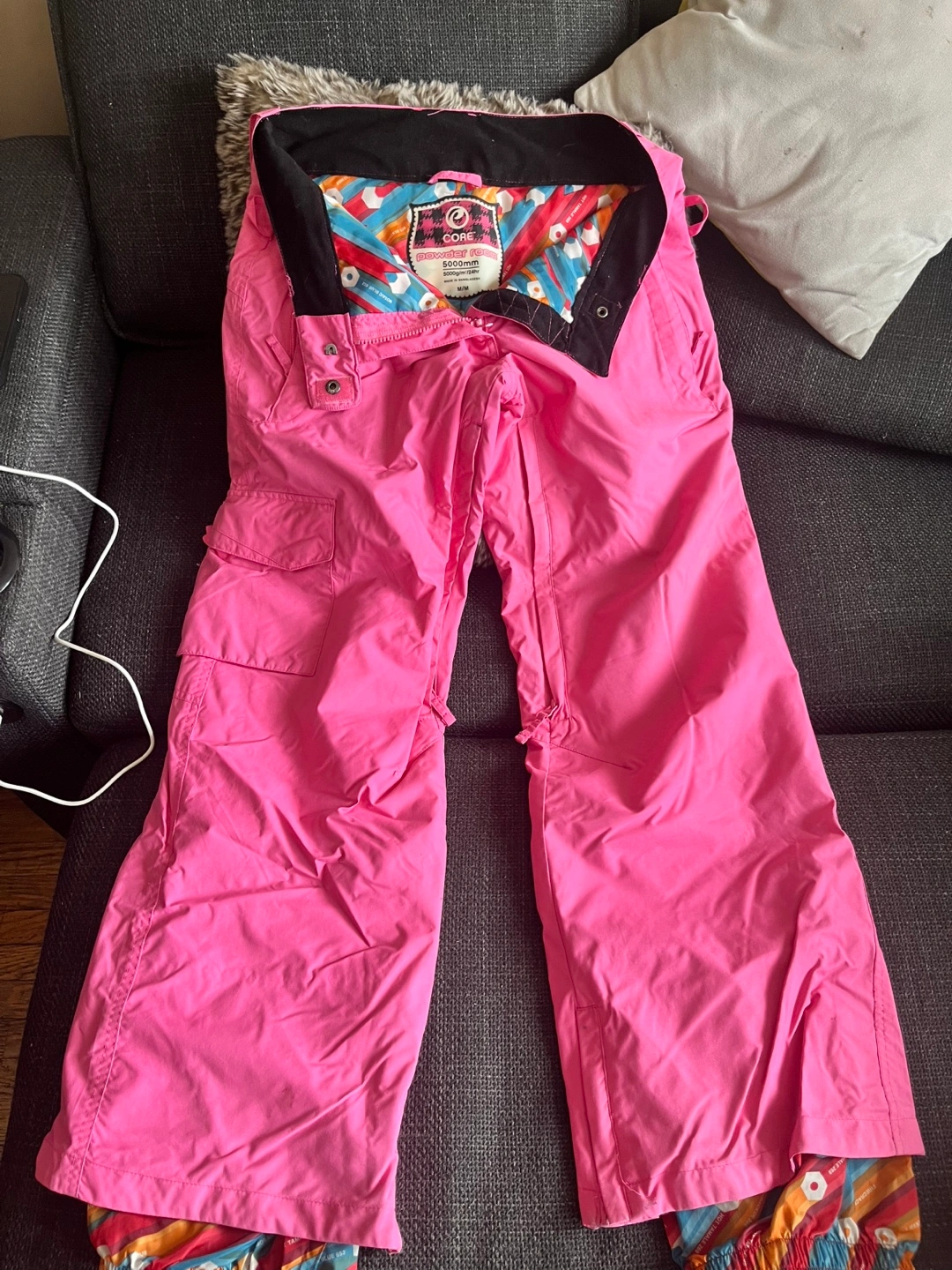 Women's Core Powder Room snow pants. Pink colour. Size medium. 5000mm waterproof rating. Made in Bangladesh. Good condition.