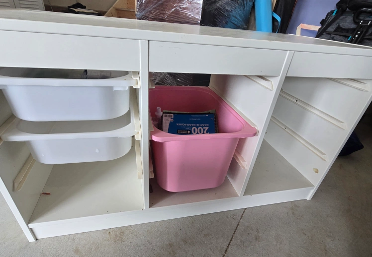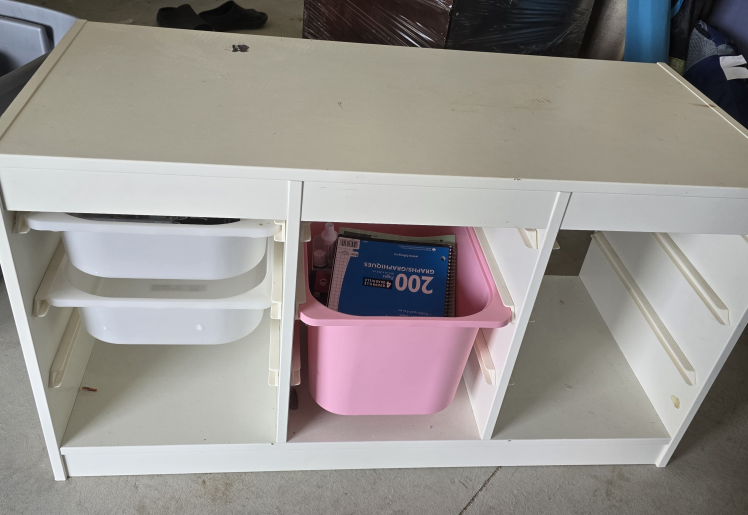 White cabinet with drawers and storage bins. Great for a child's room or play area. Some minor wear and tear.