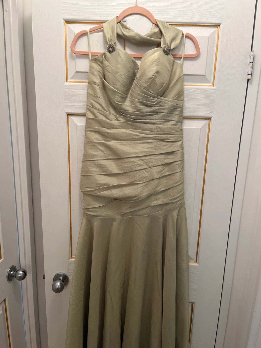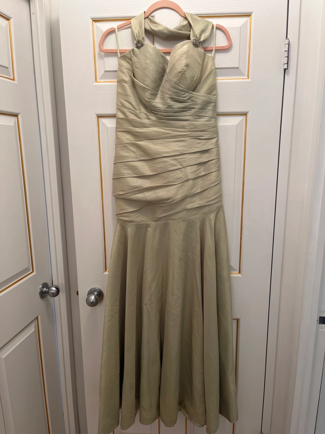 Beautiful light green formal gown. Halter neck, floor length, and features a fitted bodice and flared skirt. Perfect for weddings, galas, or other special occasions. Size not specified; please check measurements.