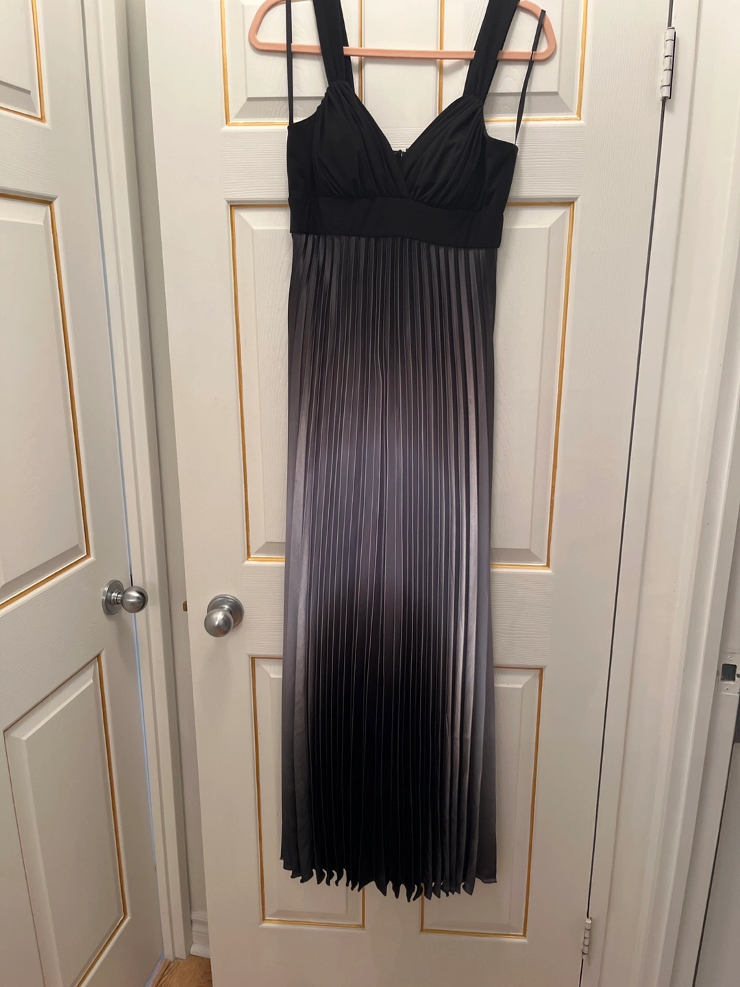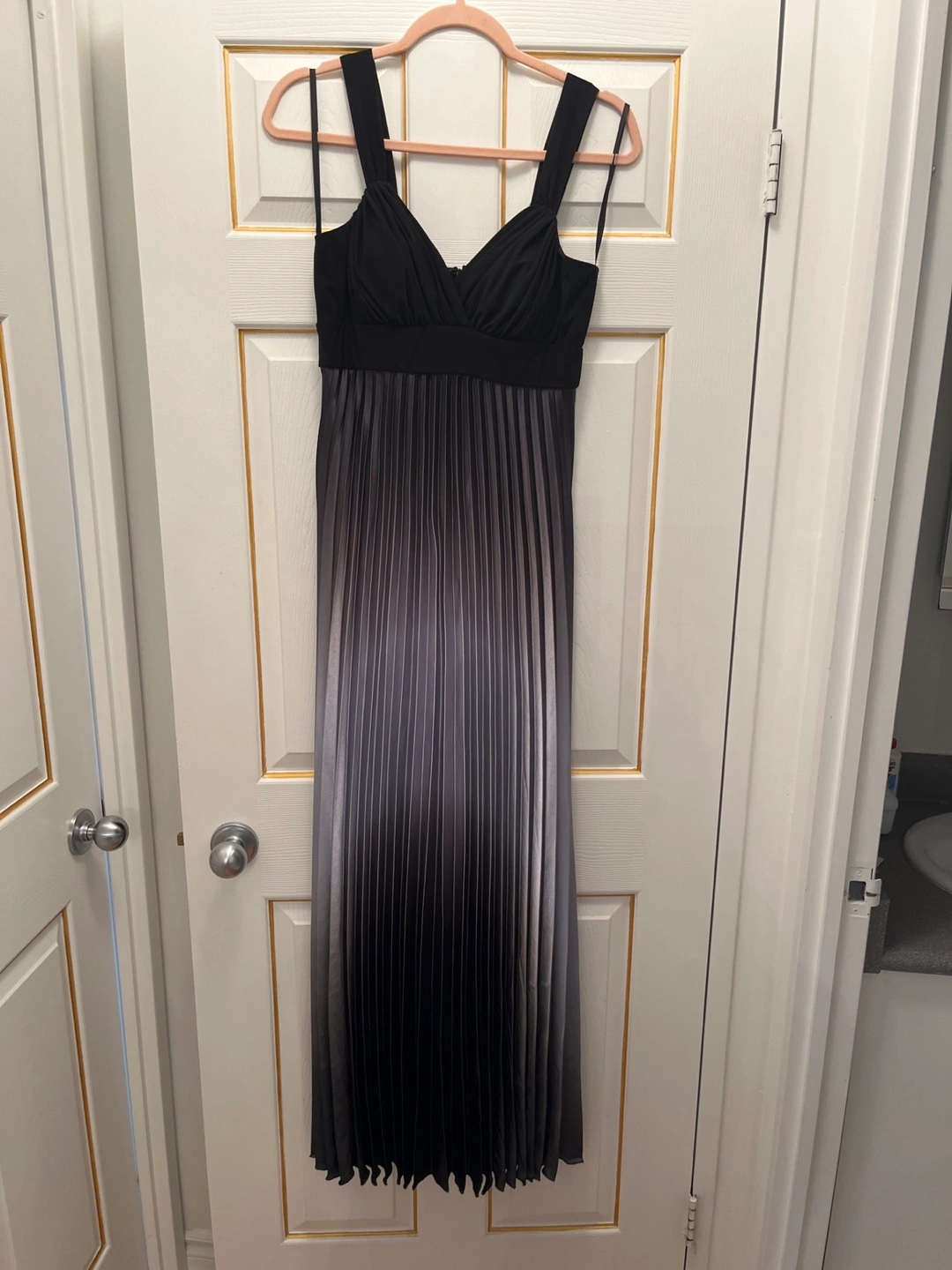 Floor-length formal gown. Features a black bodice and grey pleated skirt. V-neckline and thin straps. Great for special occasions.
