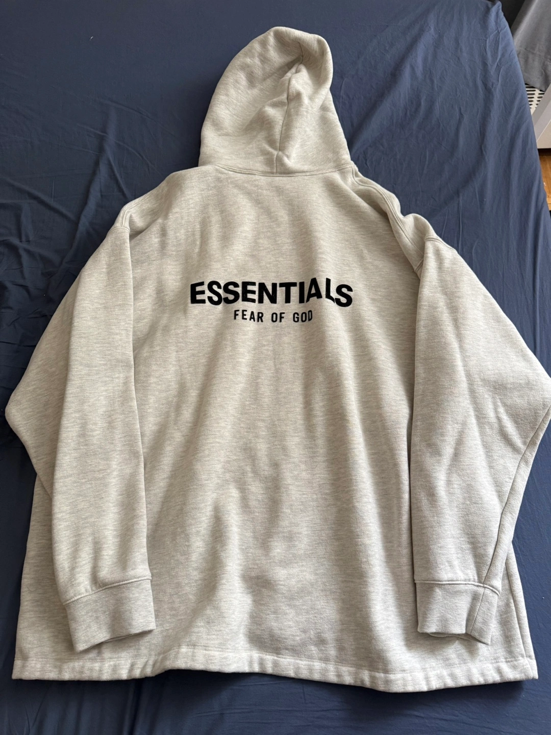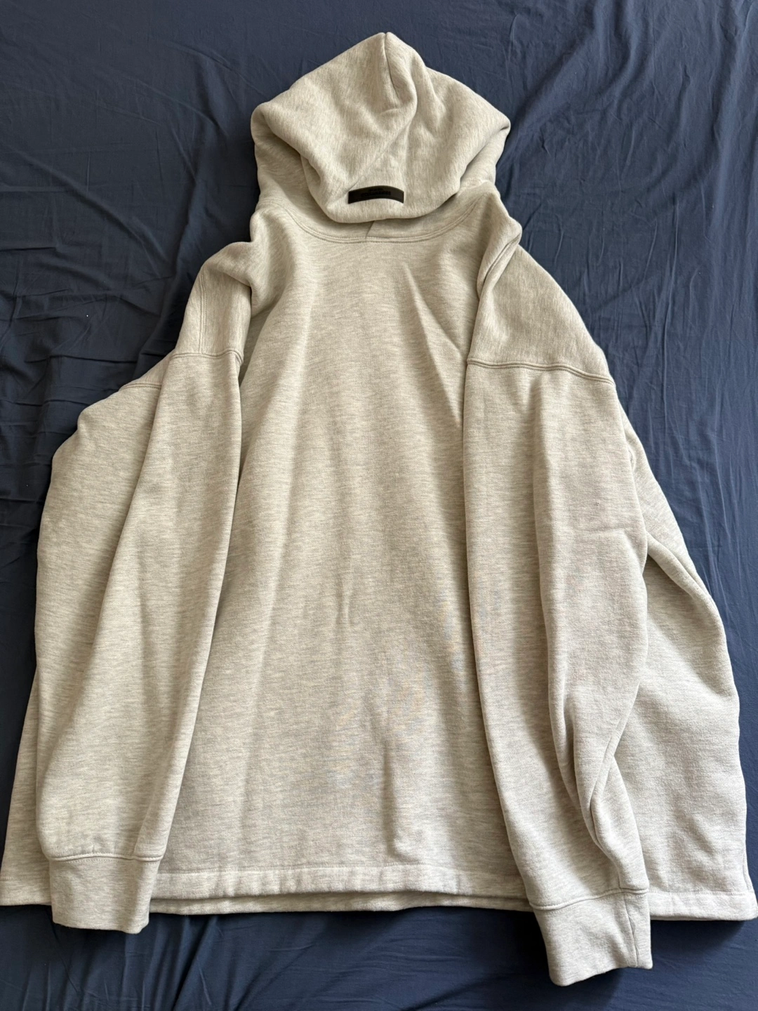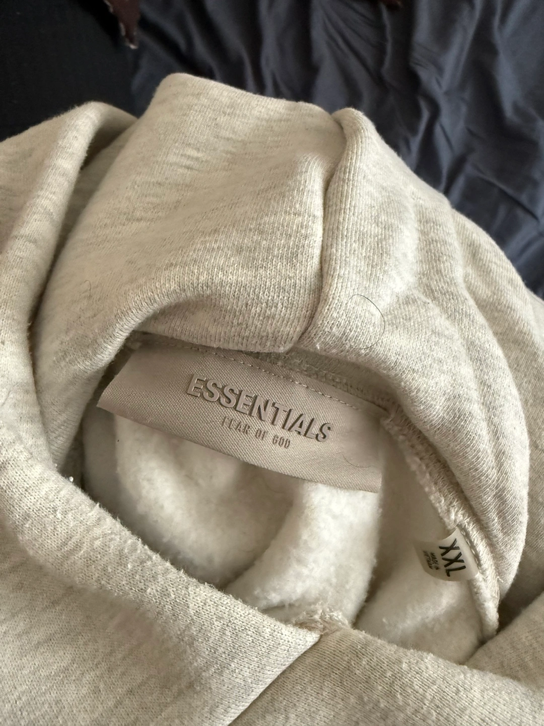 Oversized heather oatmeal grey hoodie. Features Fear of God Essentials branding on the back and on the interior tag. Size XXL. 80% cotton, 20% polyester. Excellent Condition.