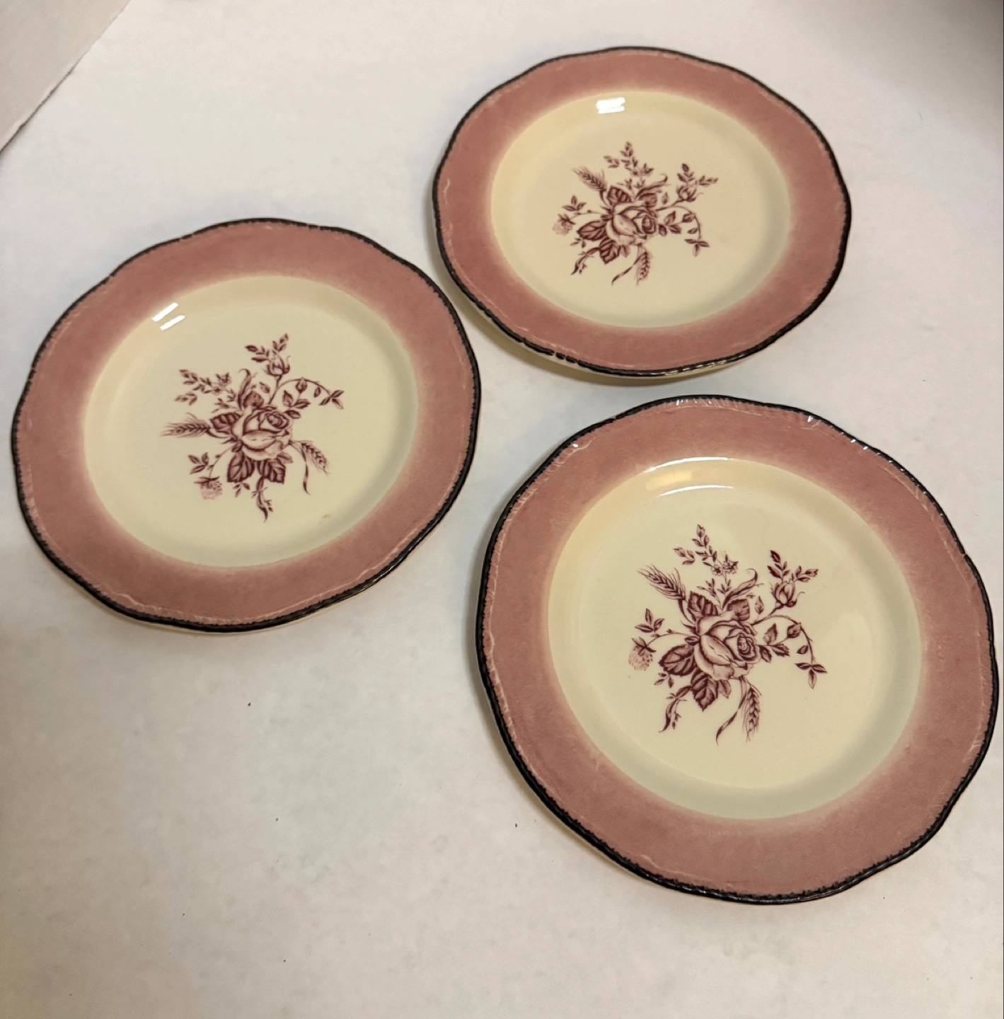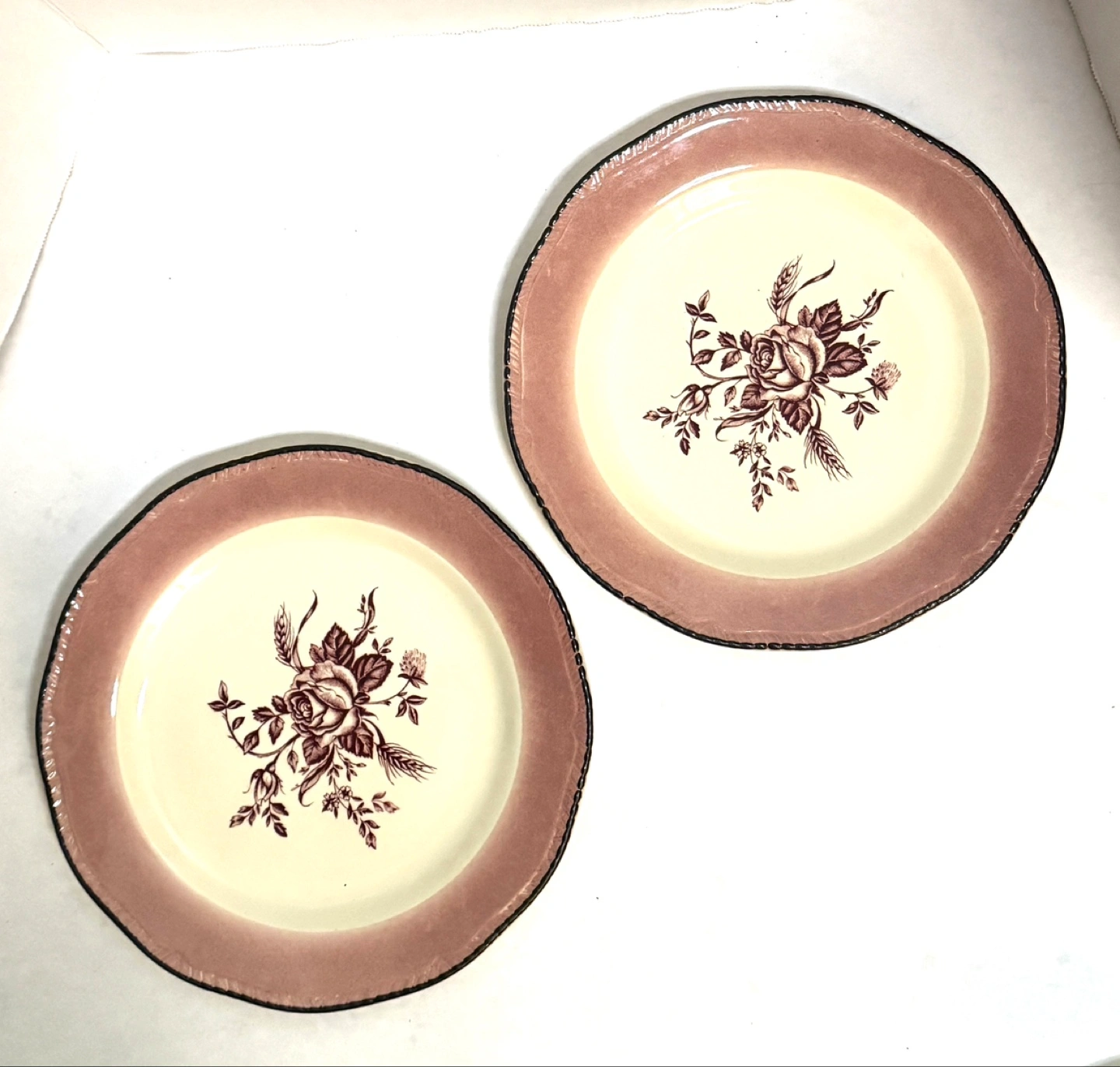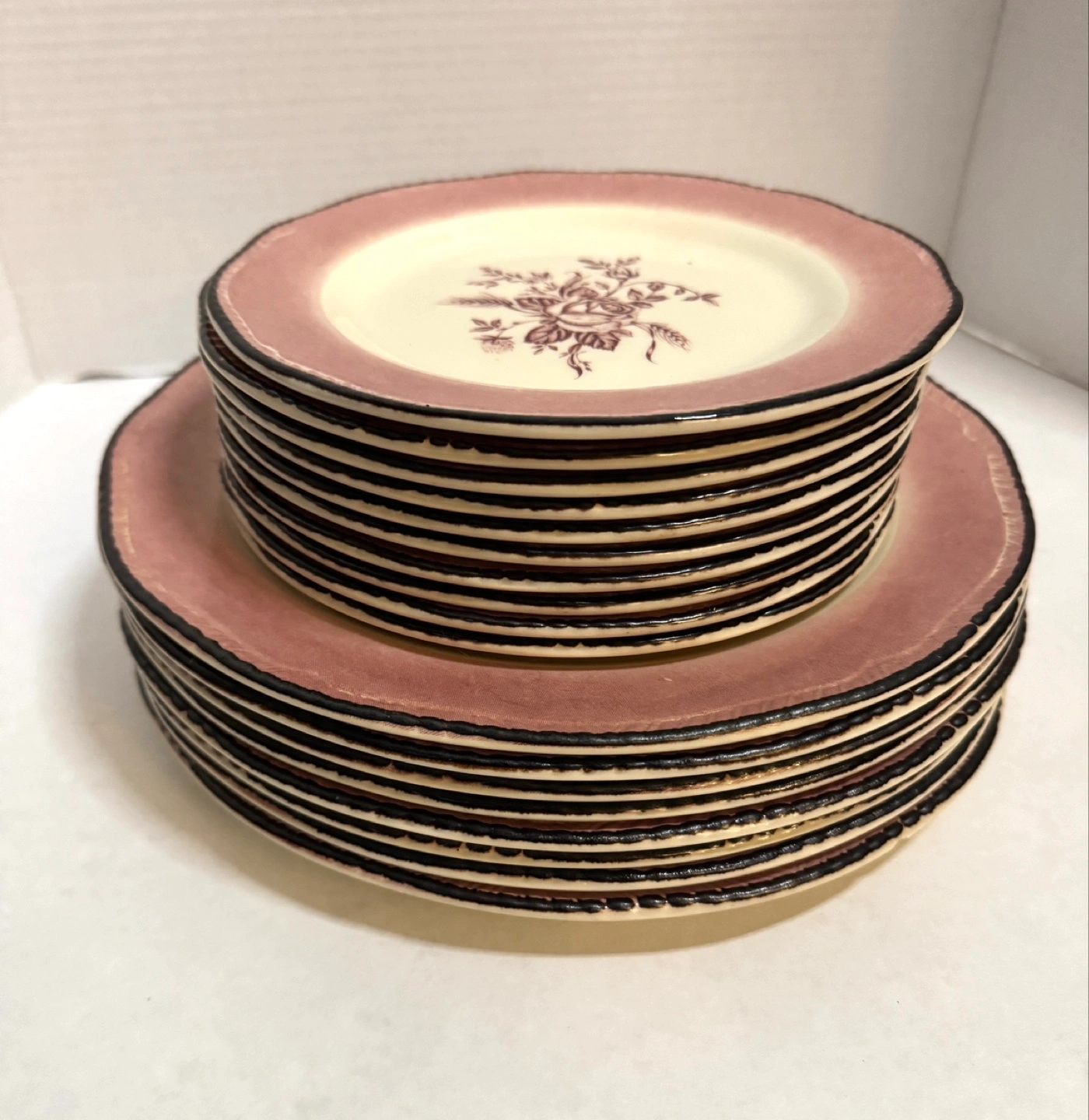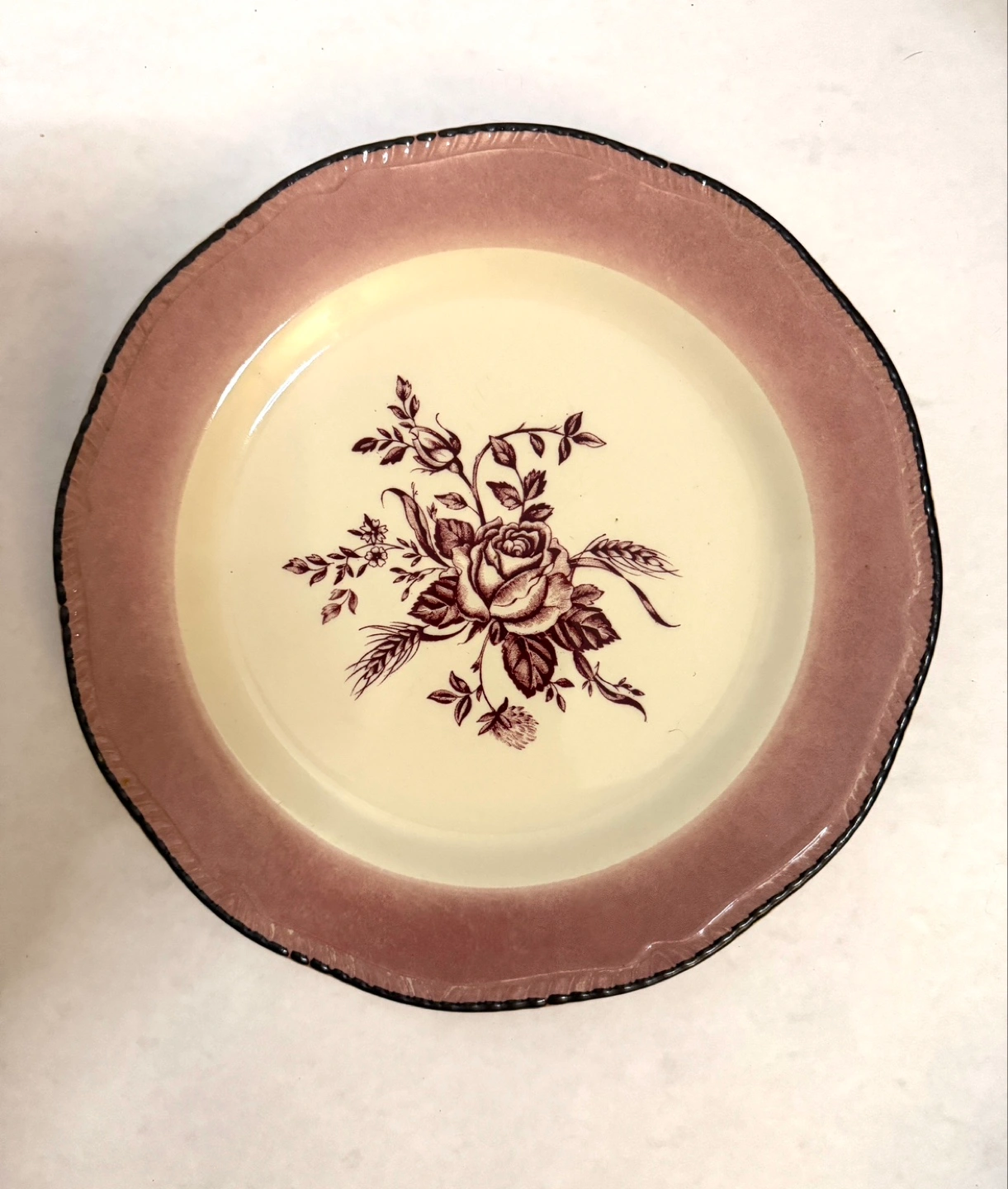 Set of twelve vintage plates. Made in England. Features a mauve/pink and cream colour scheme with a rose and wheat design. Microwave and dishwasher safe. Excellent condition