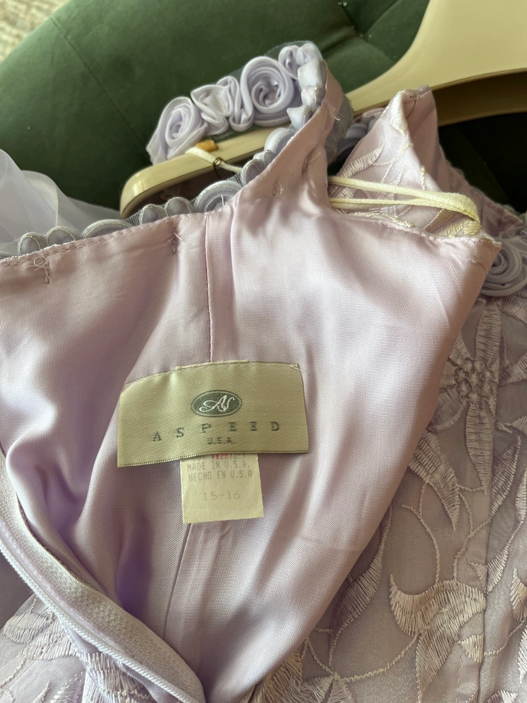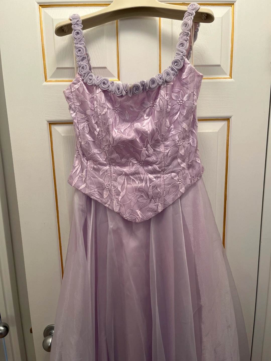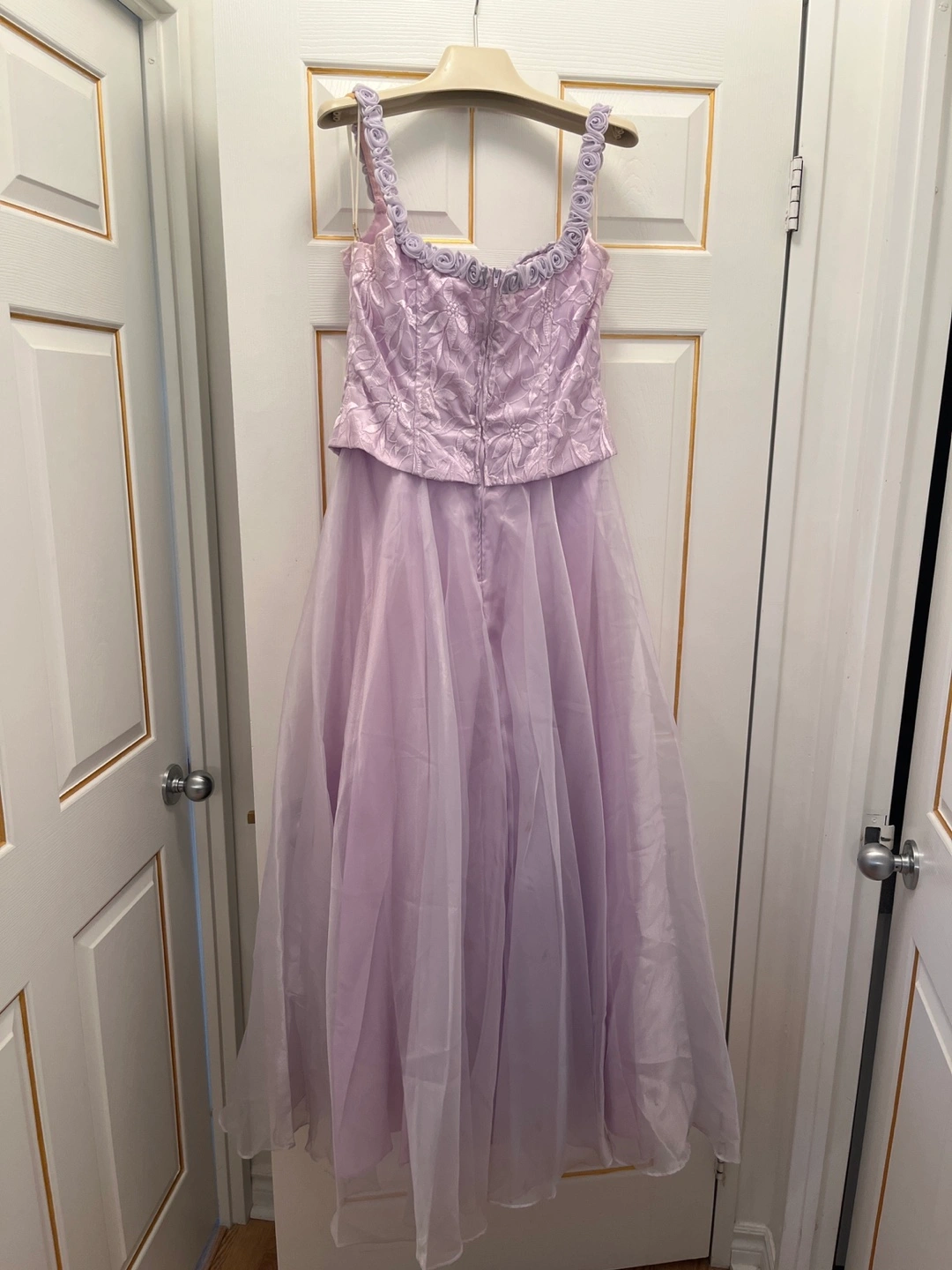 Gorgeous lavender formal gown. Two-piece design, features a fitted bodice with floral embroidery and a flowing layered skirt. Beautiful detail, perfect for prom or special occasion. Size 15-16.