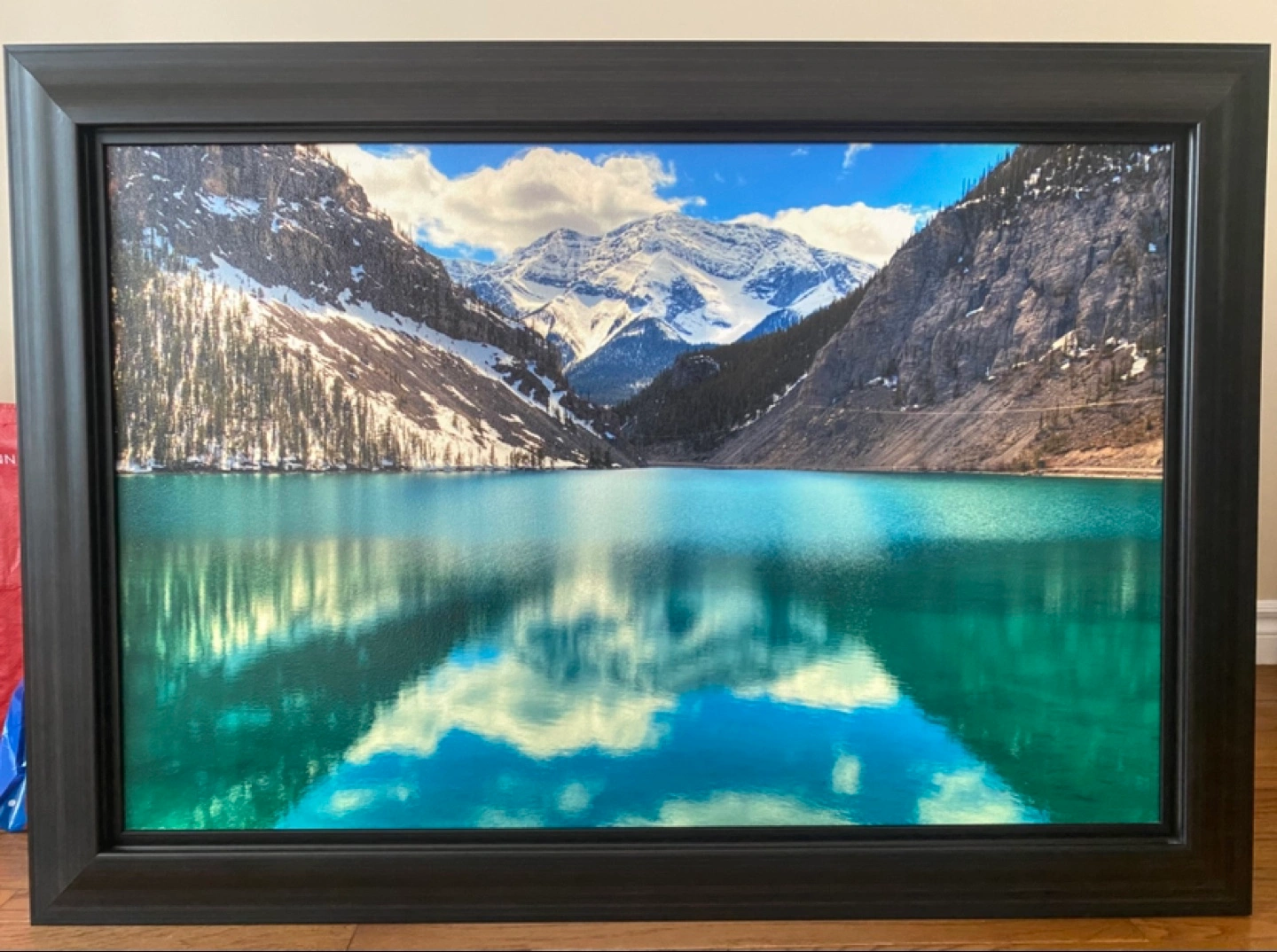 Large framed canvas print. Beautiful mountain lake scenery. Black frame. Ready to hang.