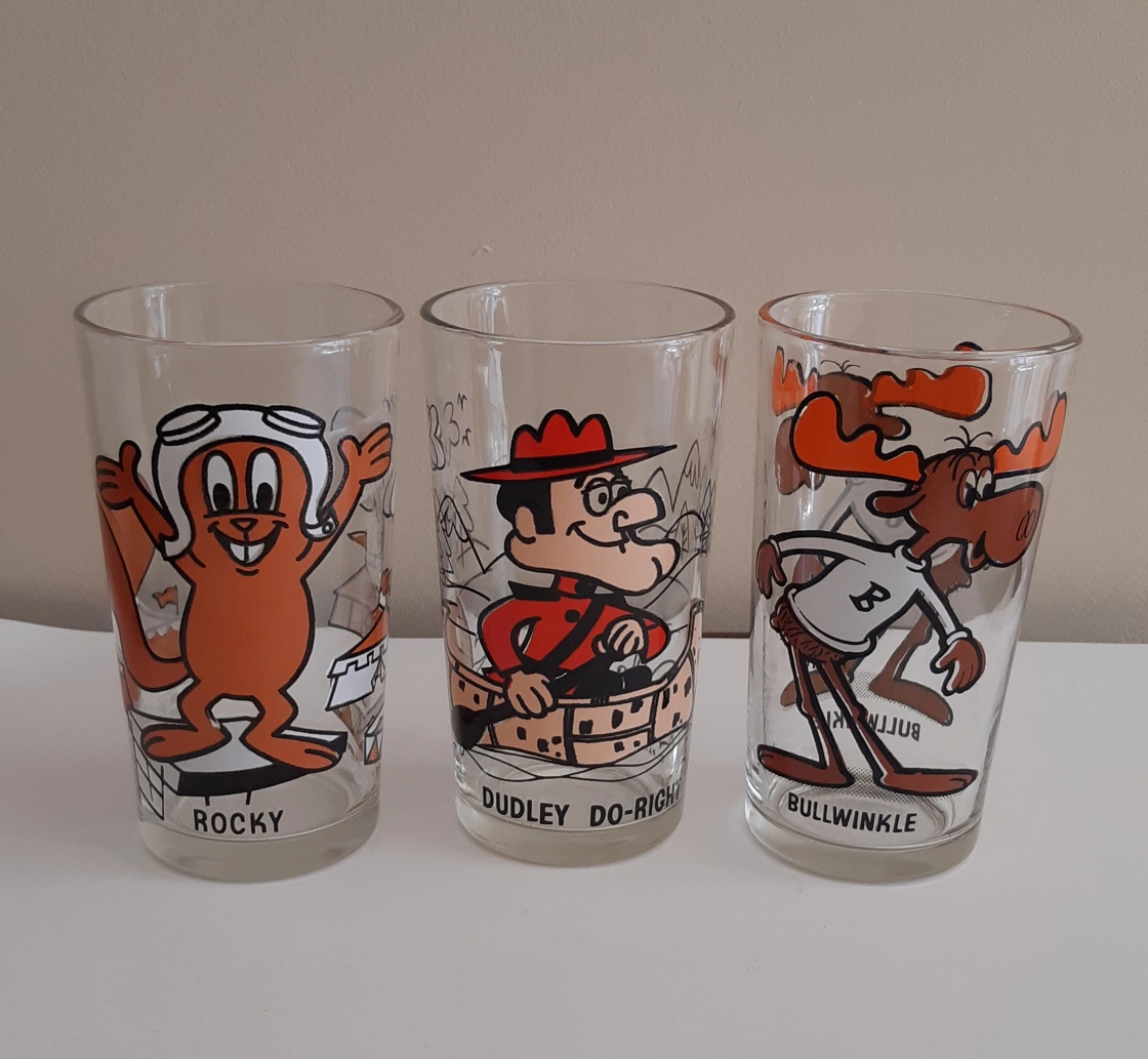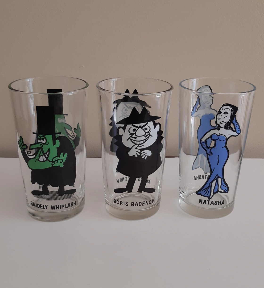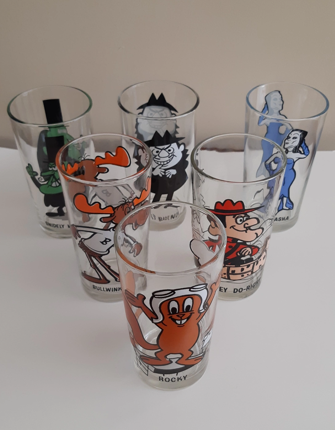 29Set of 6 Rocky and Bullwinkle Pepsi Collector series glasses. 1960s-1970s Height 5 inches. Rocky, Bullwinkle, Boris, Natasha, Snidley Whiplash, Dudley Do-right. sell as set only for $45, no chips or cracks, excellent condition