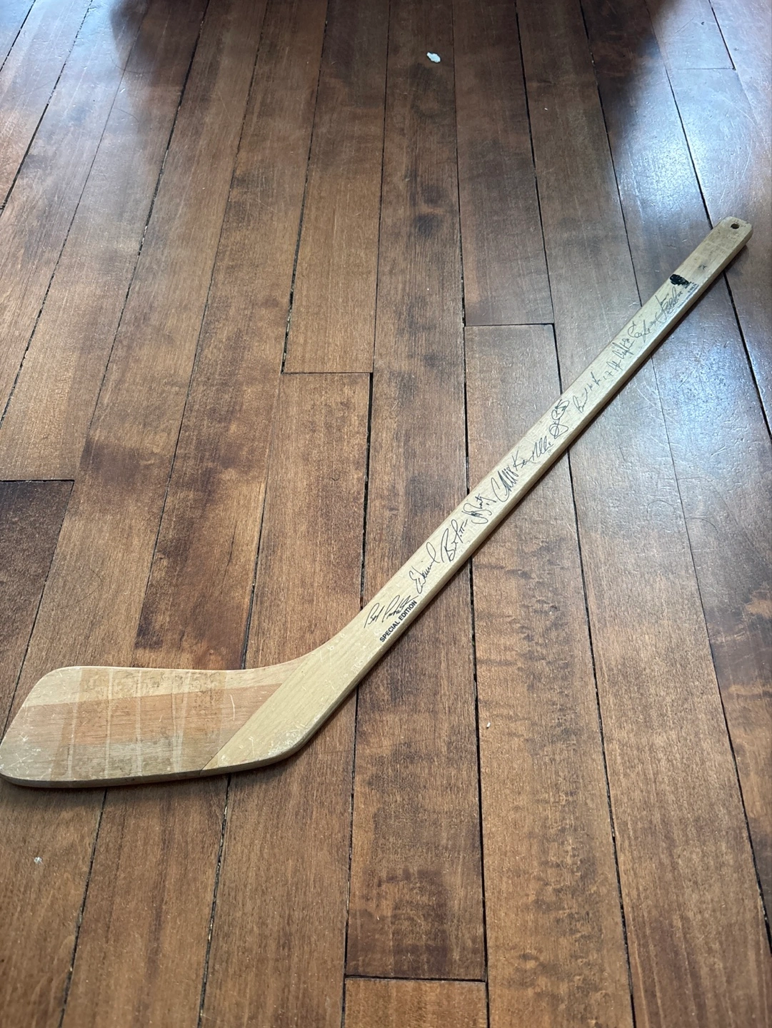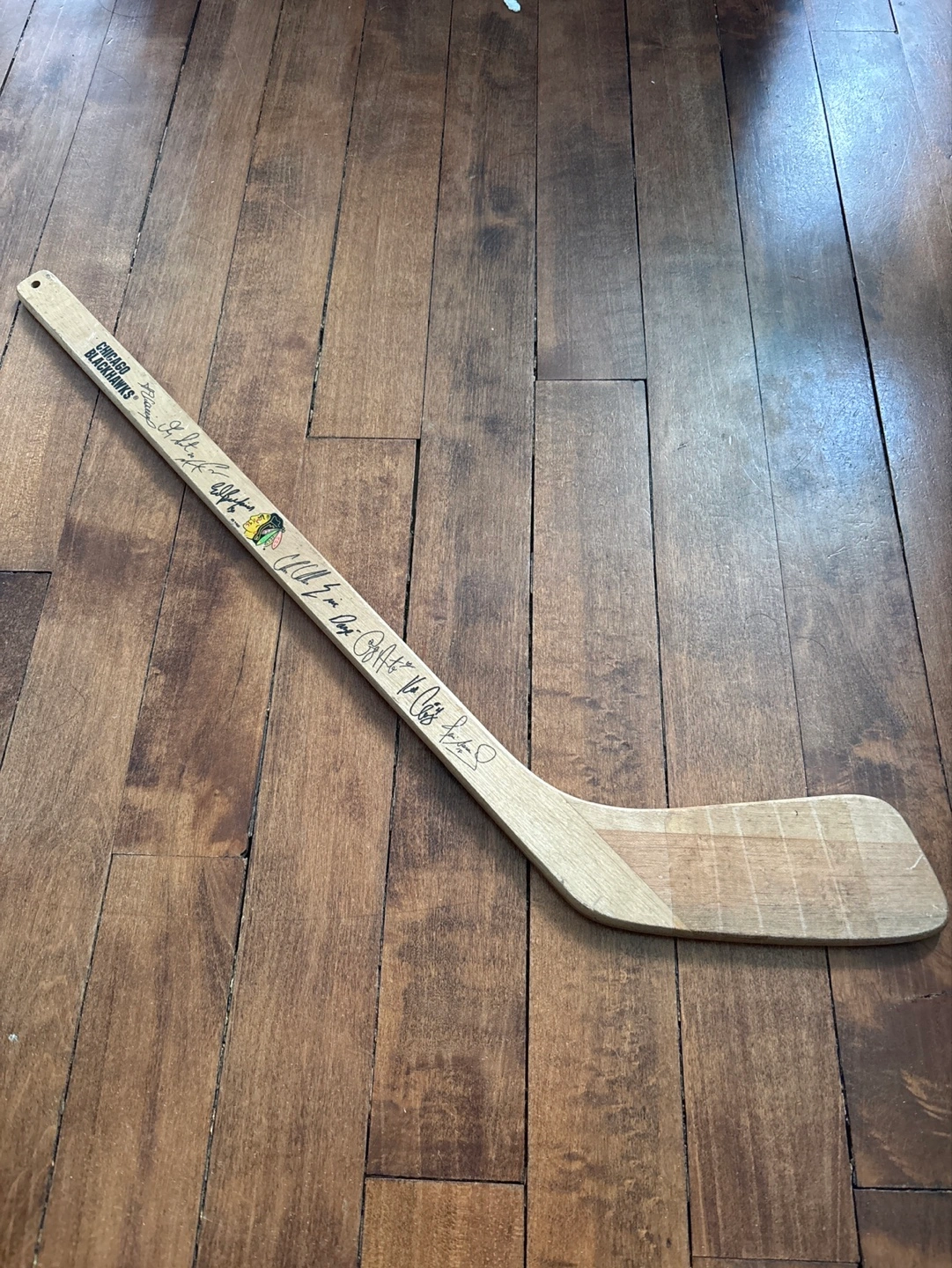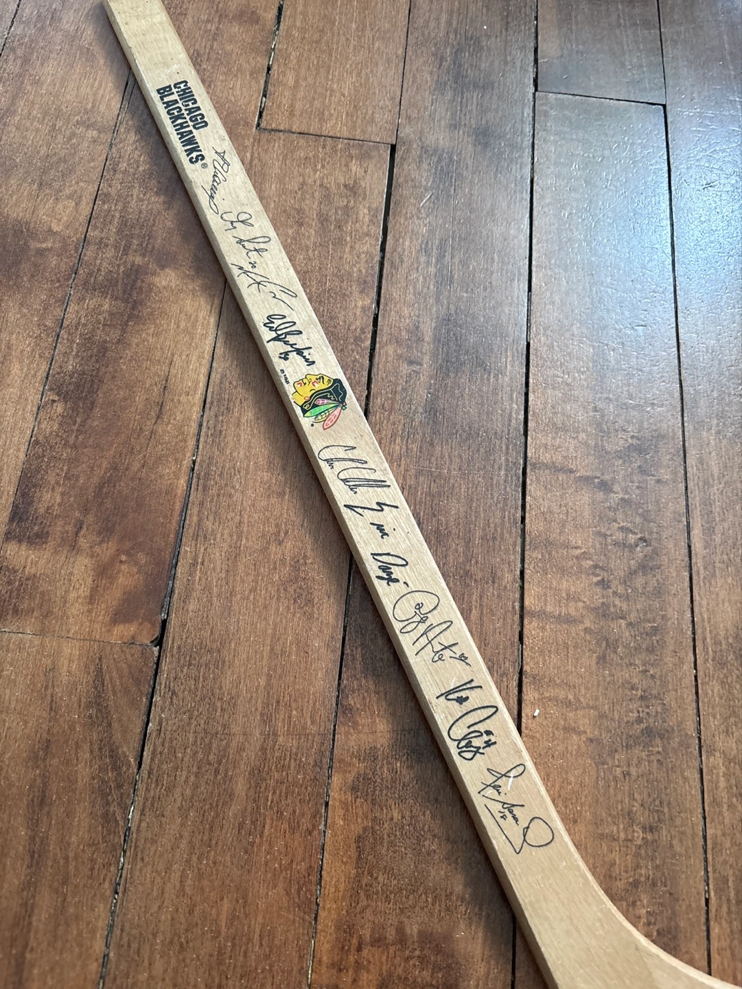 Vintage Chicago Blackhawks hockey stick. Multiple autographs. Great collectible item for hockey fans.