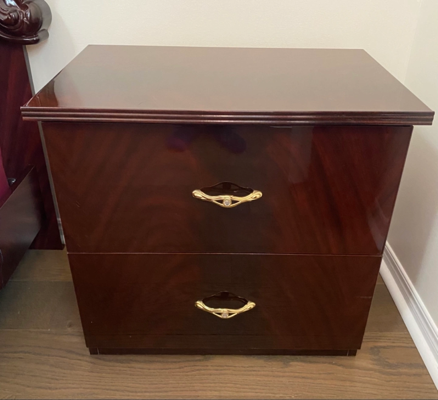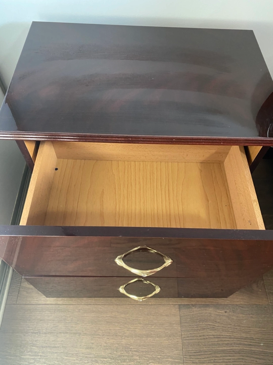 Two drawers with gold-coloured handles. Solid wood construction. Great for bedroom storage.