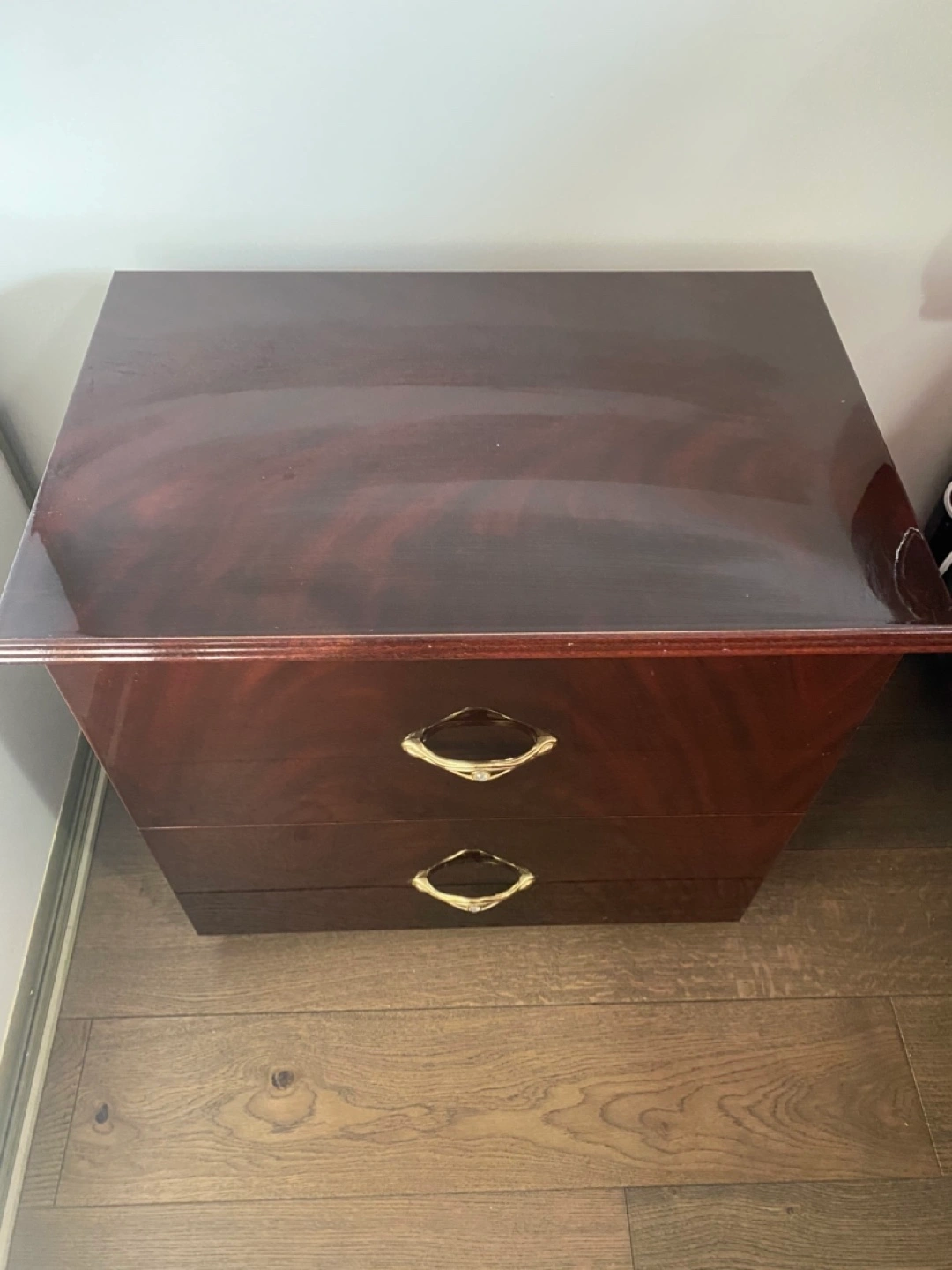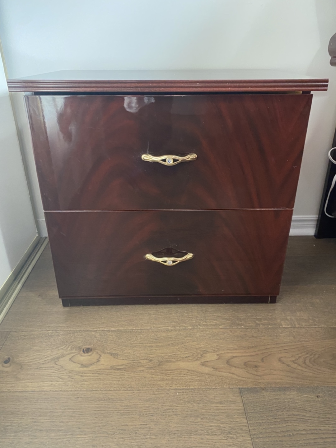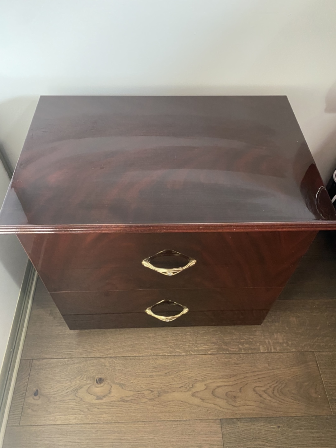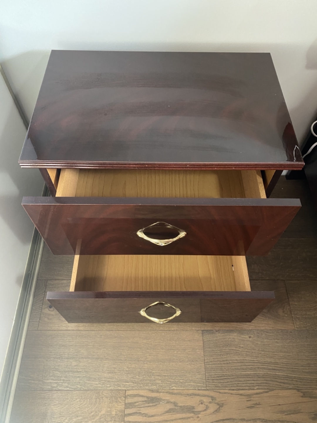 Two drawers with gold-coloured handles. Solid wood construction. Great for bedroom storage.