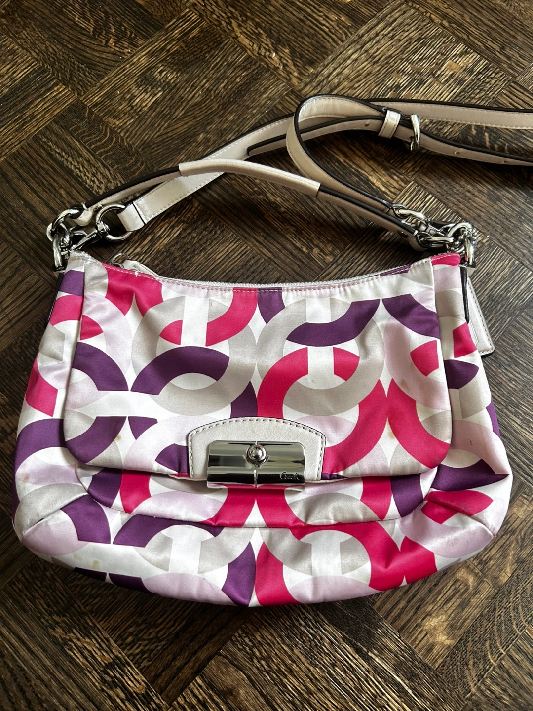 Pre-owned Coach handbag. Good condition Pink, purple and white signature C pattern. Slight discolouration because of smudge Includes shoulder strap. Some strains have shown in the picture I hope washing it will be better.