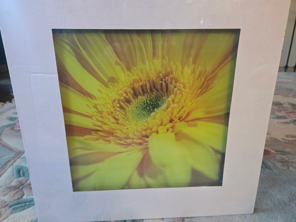 675Beautiful framed print of a yellow gerbera daisy. New in box, includes hanging hardware. Square frame, white matting. Perfect for adding a pop of colour to any room. open to trades- gift cards, household items, pantry items.