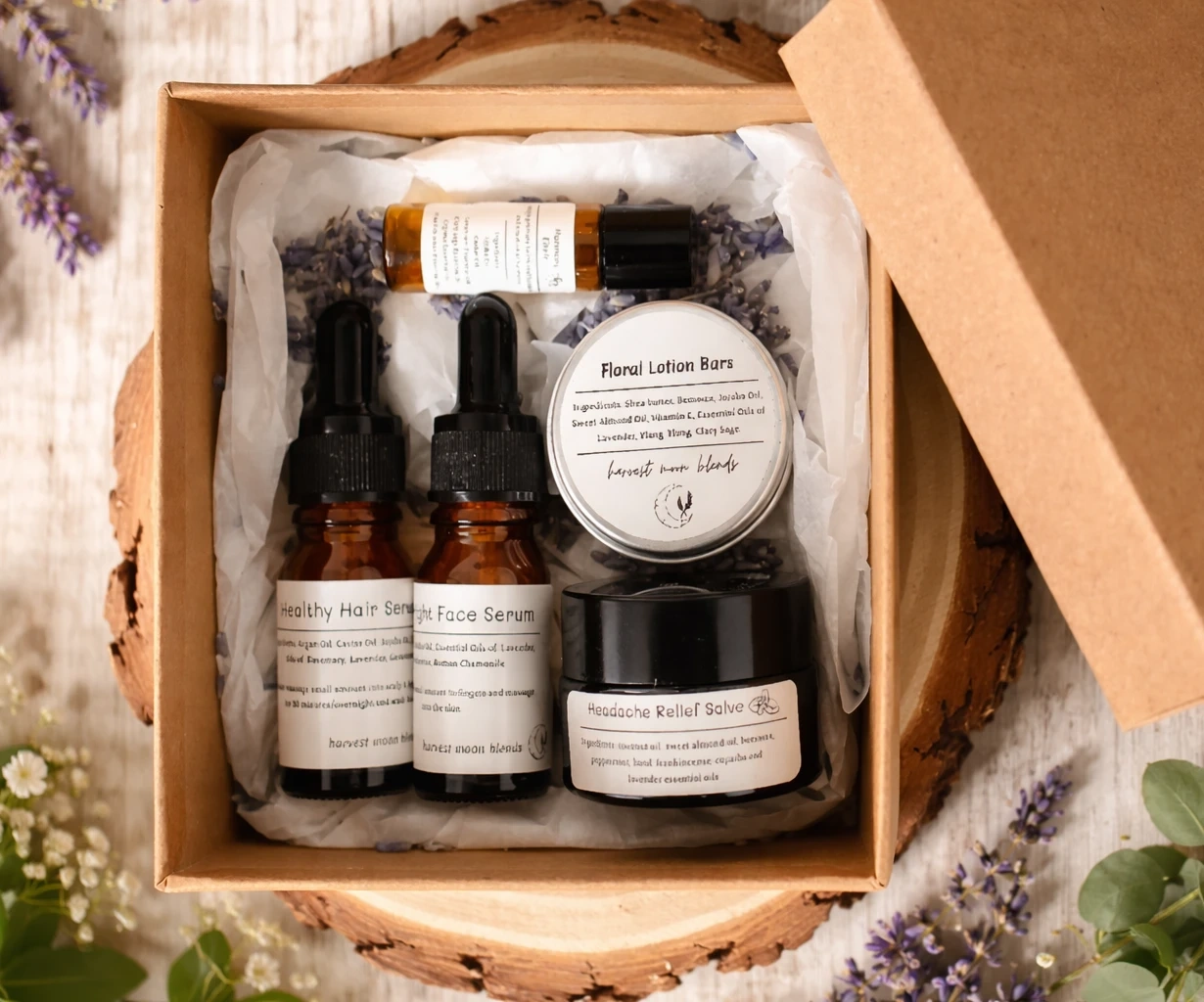 Handcrafted Self-Care Aromatherapy Kit with five wellness essentials made with 100% natural ingredients and high-quality essential oils. It includes: